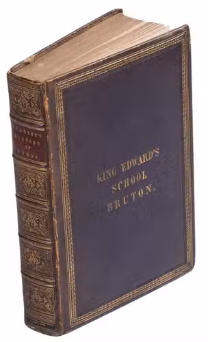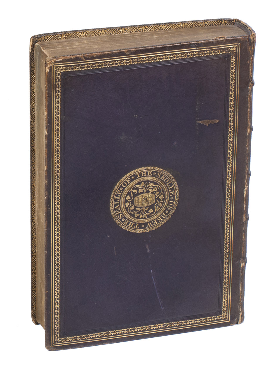 London, Longmans, Green and Co. (at the end: printed by Spottiswoode and Co.), 1865. 8vo. With engraved frontispiece, title-vignette, 2 engraved plates and 102 illustrations in the text.Contemporary gold-tooled calf, probably a school prize binding, with "King Edward's School Bruton" and its "Sealle of the Skolle of Brew" in a frame, the seal showing a Brewers tonne (Brew-ton), richly gold-tooled spine with a red morocco label, edges gilt over a fore-edge painting showing a falconry hunting scene. xiii, [1 blank], 446 pp.