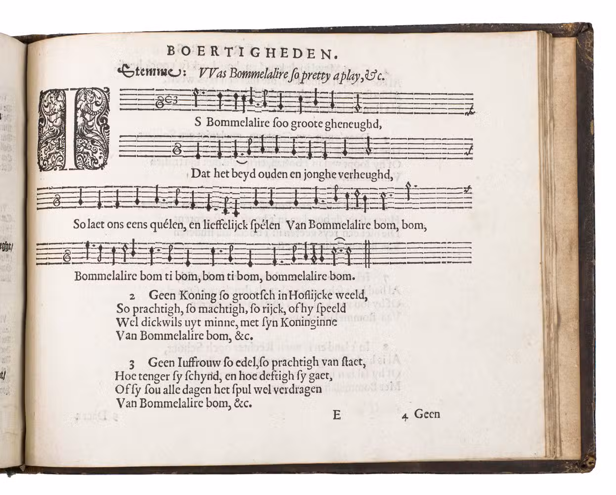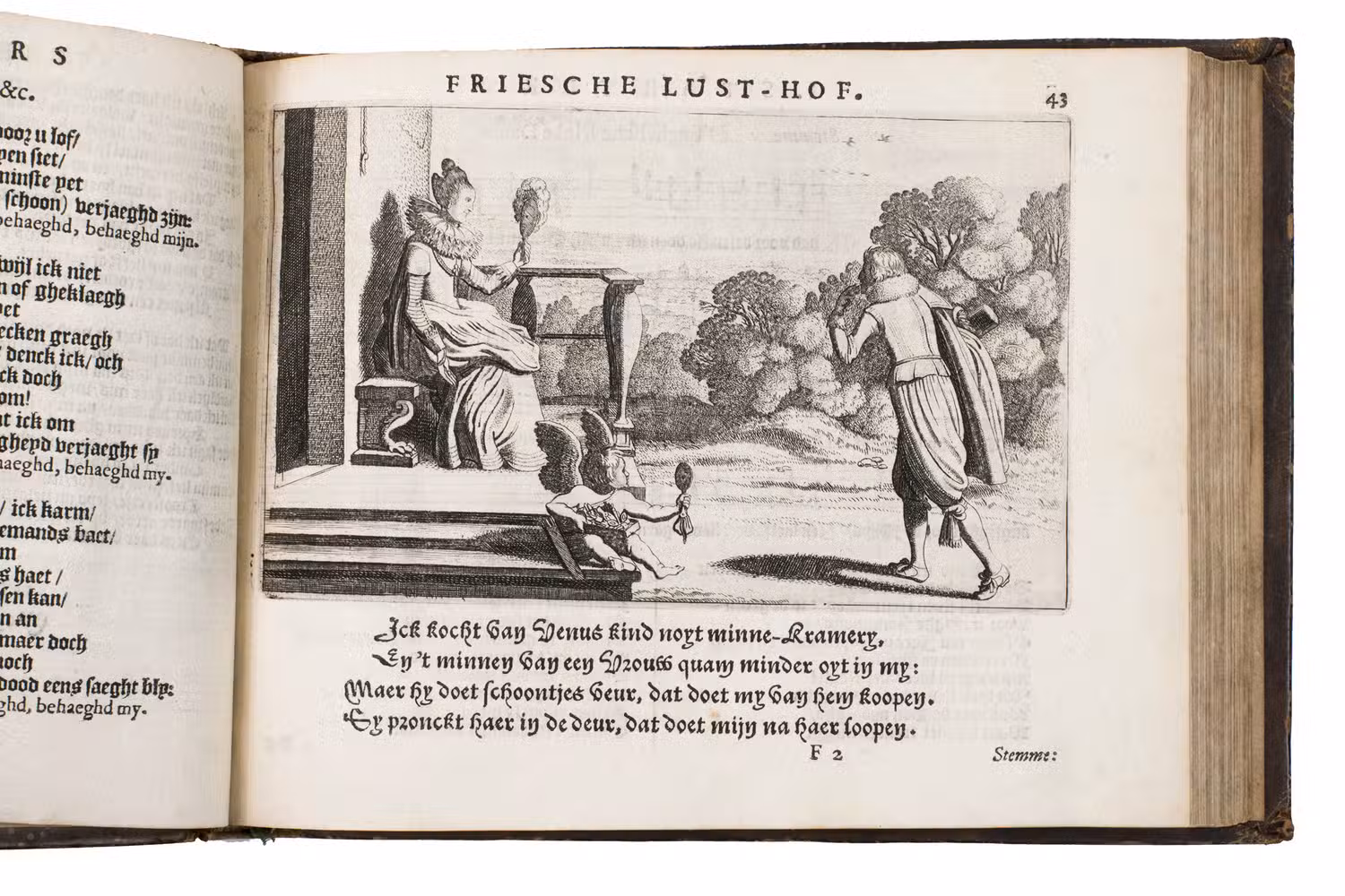 Jan Jansz. Starter, (really John Startutt, 1593-1626), was of English origin, and from 1614 to 1621 bookseller and publisher at Leeuwarden, hence the title Friesche lusthof for his songbook, first published in 1621. Together with Bredero (1585-1618), Starter became one of the most popular poets and playwrights of the early 17th century. He worked together with composer Jacques Vredeman (ca. 1563-1621) in Leeuwarden, who contributed a great deal to the popularity of the songbook. Many of the songs were based on English songs, taken from The first book of songes and ayres (1600) by Robert Jones, and Thomas Deloney's Garland of delight (late 16th century). From other songs the sources are still unknown, including "Is Bommelarire so pritty soo groote geneughd", which is set to the music of the tune "Was Bommelarire so pritty a play". The fine plates by Jan van de Velde (1593-1641), a pupil of Jacob Matham, the step-son of Golzius, beautifully illustrate the songs with pastoral and courtly scenes, several shown at night with only the moon and the stars to lighten the scene.