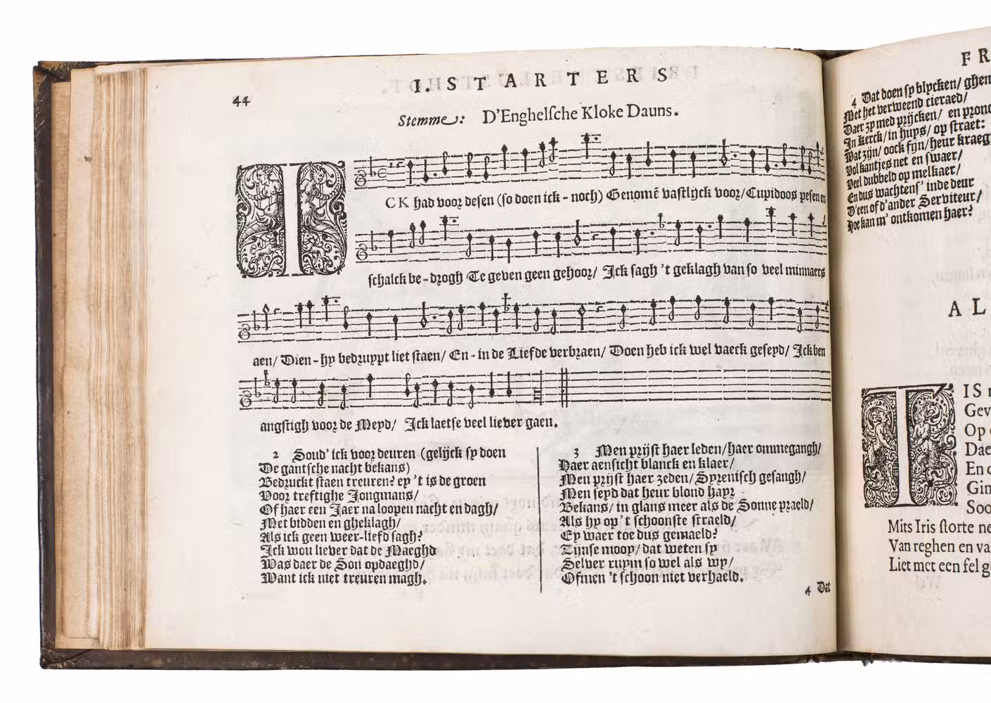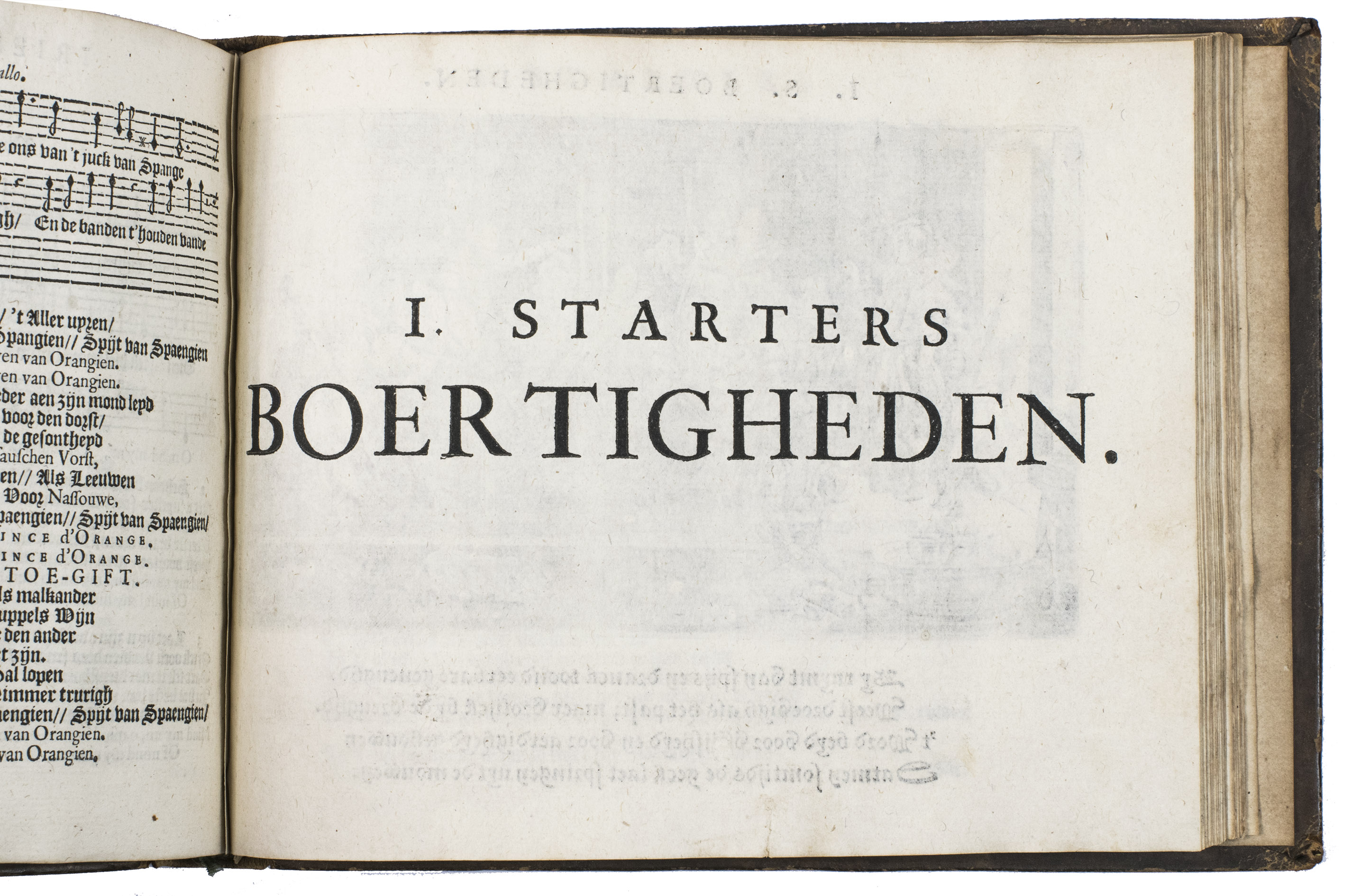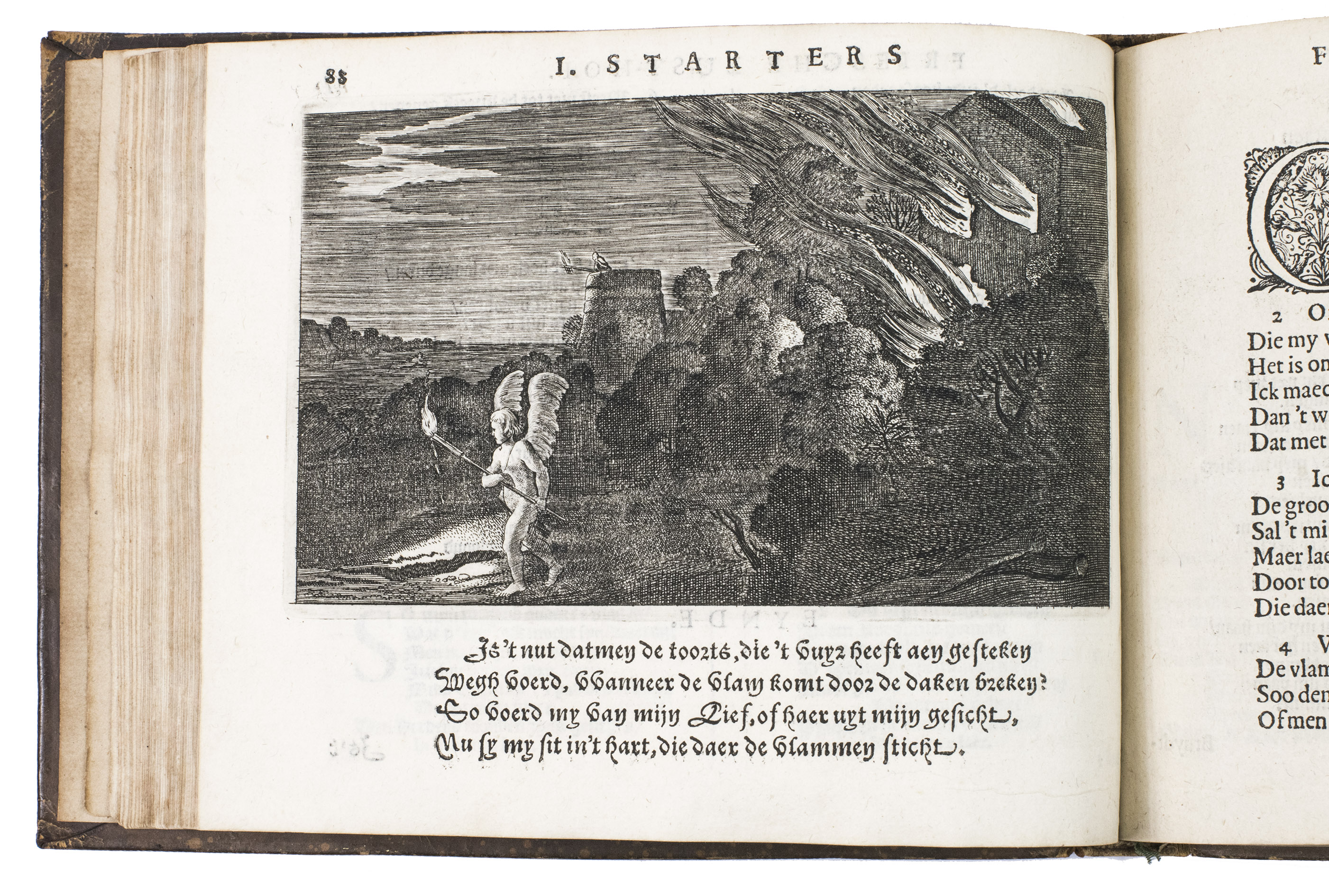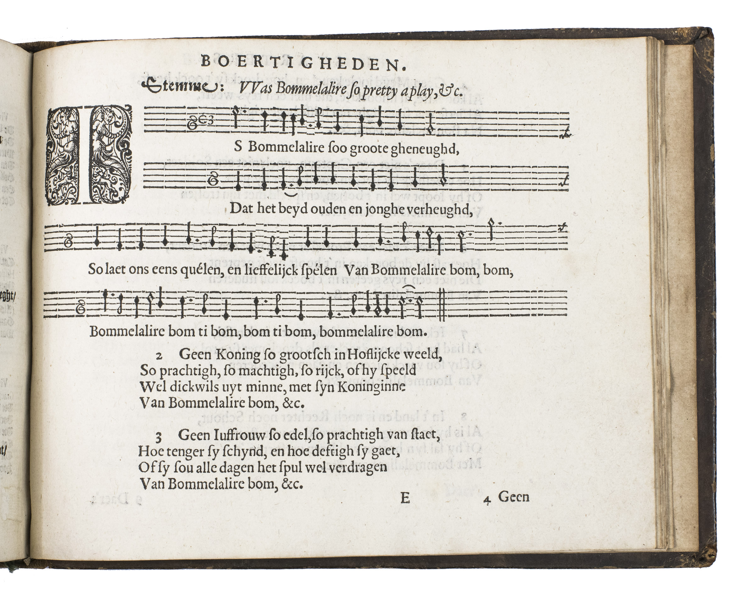 The edges and corners of the boards are very slightly scuffed, the spine is rubbed, affecting the final word of the title. The work is very slightly browned throughout, lacking two blank leaves (2C4 and F4). Otherwise in good condition. Goovaerts 565; Kleerkoper, Starter, p. 36; Scheurleer, Liedboeken, p. 147; STCN 842326928 (5 copies); USTC 1029946 (5 copies); Van Someren 5127a; cf. Brink, J. ten, G.A. Bredero, pp. 159-191; Brouwer, J. H., Jan Jansz, Starter.