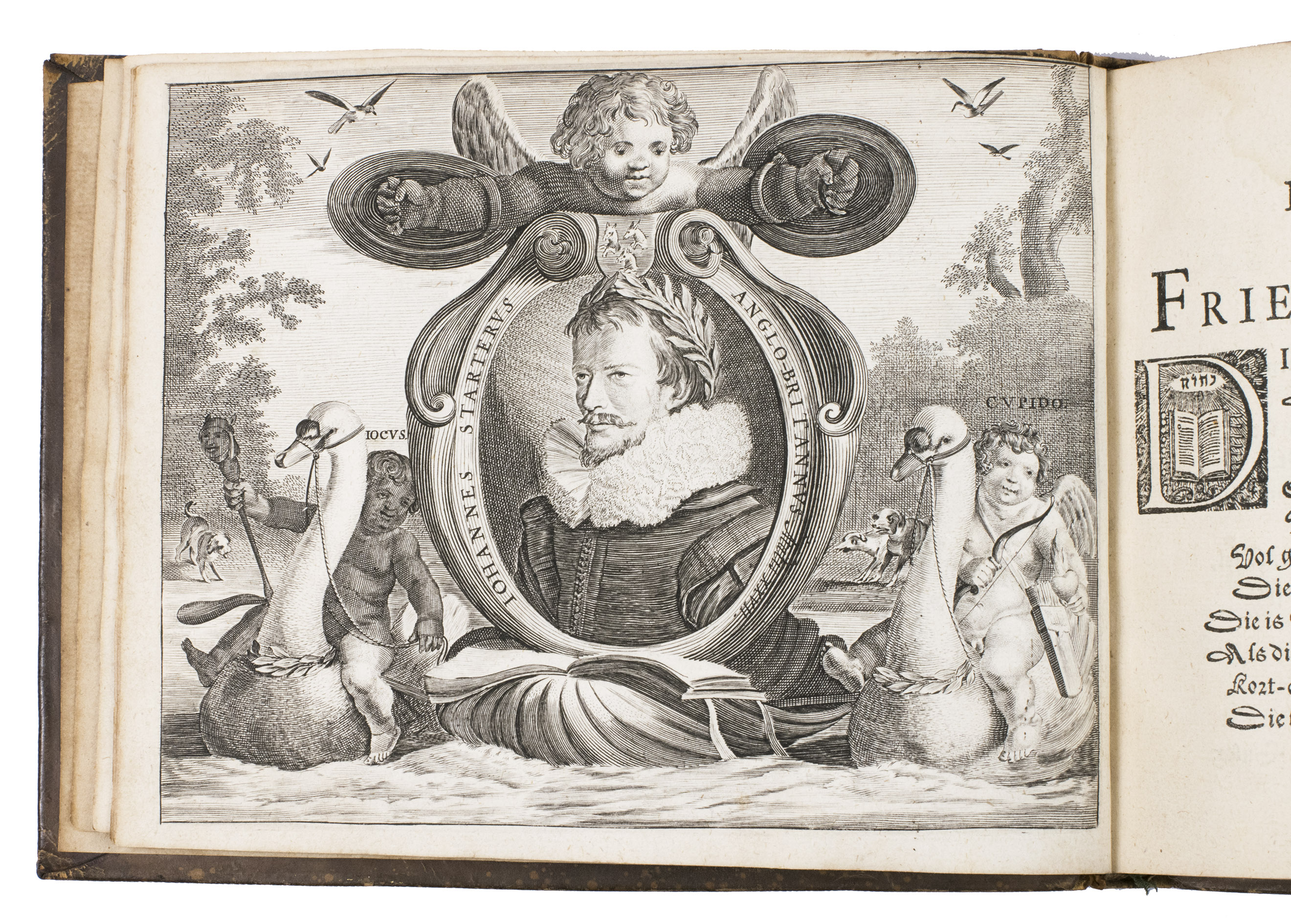 Amsterdam, Widow of Dirck Pietersz. Voscuyl, [1624]. Oblong 4to. With an engraved frontispiece, an engraved portrait of the author, 10 engraved plates in the text, musical annotation, and decorated woodcut initials. 18th-century mottled brown calf. [14], 206, [40] pp.