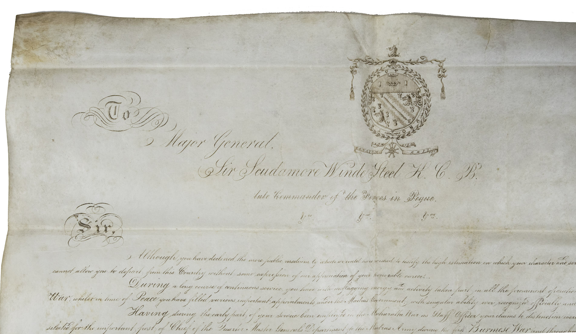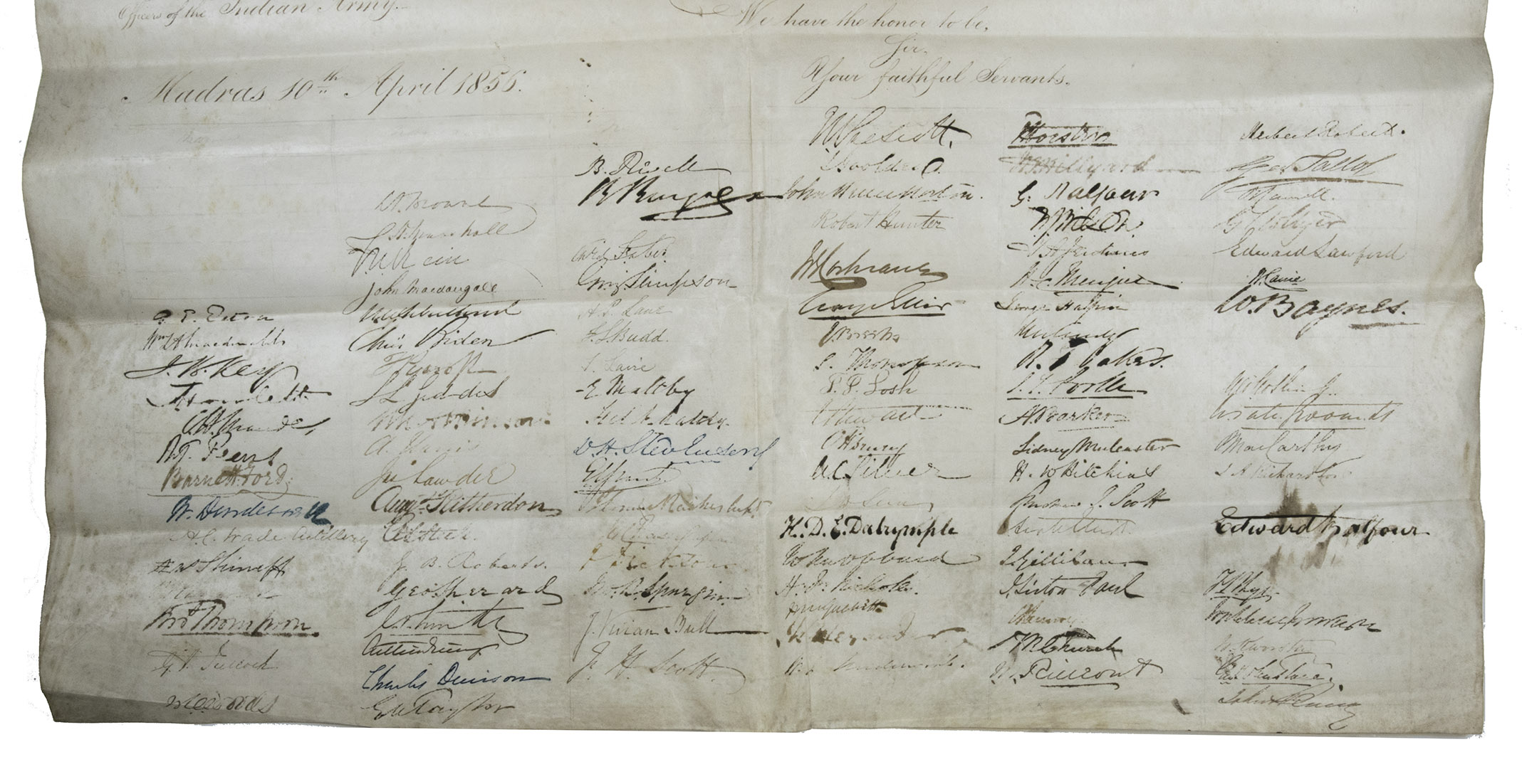 A letter of appreciation by 106 of the most prominent British inhabitants of Madras for Sir Scudamore Winde Steel (1789-1865), presented to him upon his departure from Madras, on 10 April 1856. Steel was seen by his fellows as "one of the most distinguished officers of the Indian Army". After participating in many Indian battles for the East India Company he was promoted to major in 1832 and was given command of the Madras army, which he successfully led during the Second Anglo-Burmese War in 1852-53. For this he was knighted as a Knight Commander of the Order of the Bath, promoted to major general and given the command of the Pegu division and the Martaban provinces in 1854. Not long after, as the present document tells us, he returned to England, where he was promoted to lieutenant general in 1861. The letter is signed by 106 of the most prominent British inhabitants of Madras. Included among the signatures is that of the Scottish surgeon, orientalist and pioneer environmentalist Edward Balfour (1813-1889).