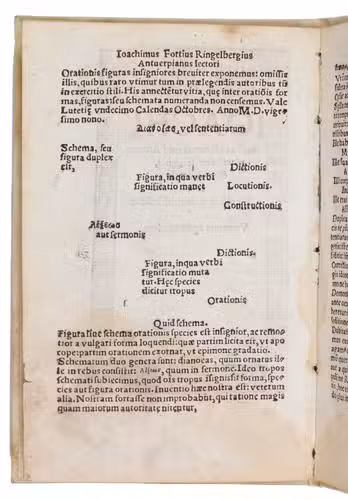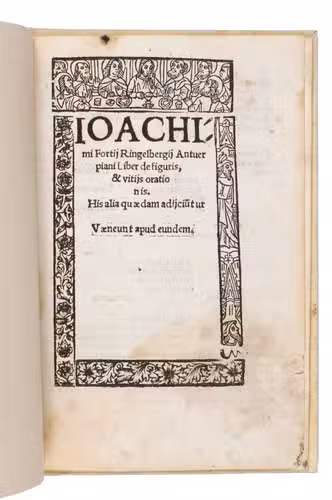 Extremely rare rhetorical and grammatical treatise by the Antwerp humanist Joachim Sterck van Ringelberg (or Joachimus Fortius Ringelbergius, 1500-1536). Ringelberg was a native of Antwerp and an associate of Erasmus. He, studied, and later taught, at the Collegium Trilingue in Leuven between 1516 and 1526. We have found only one copy held at an institution worldwide (at the university library in Freiburg, Germany) and have found no copies in sales records of the last 100 years.