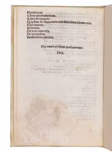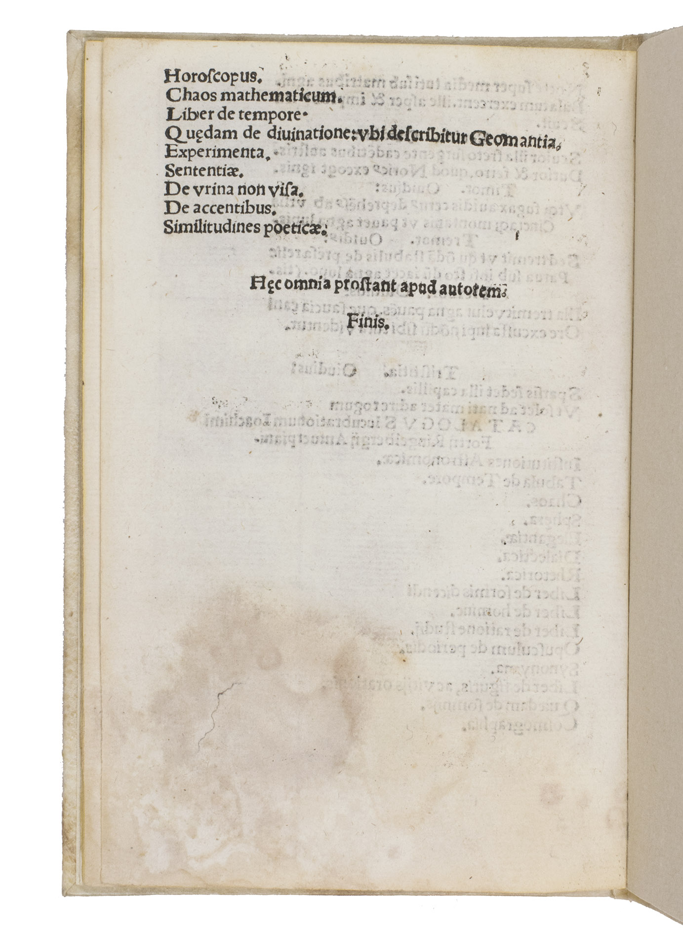 The work is of particular bibliographical interest, as it concludes with a Catalogus lucubrationum Ioachimi Fortij Ringelbergij Antuerpiani, listing twenty-four works by the author, the first being his celebrated Institutiones Astronomicae, and ending with the notice: ("Haec omnia prostant apud autorem"), all works available directly from the author.