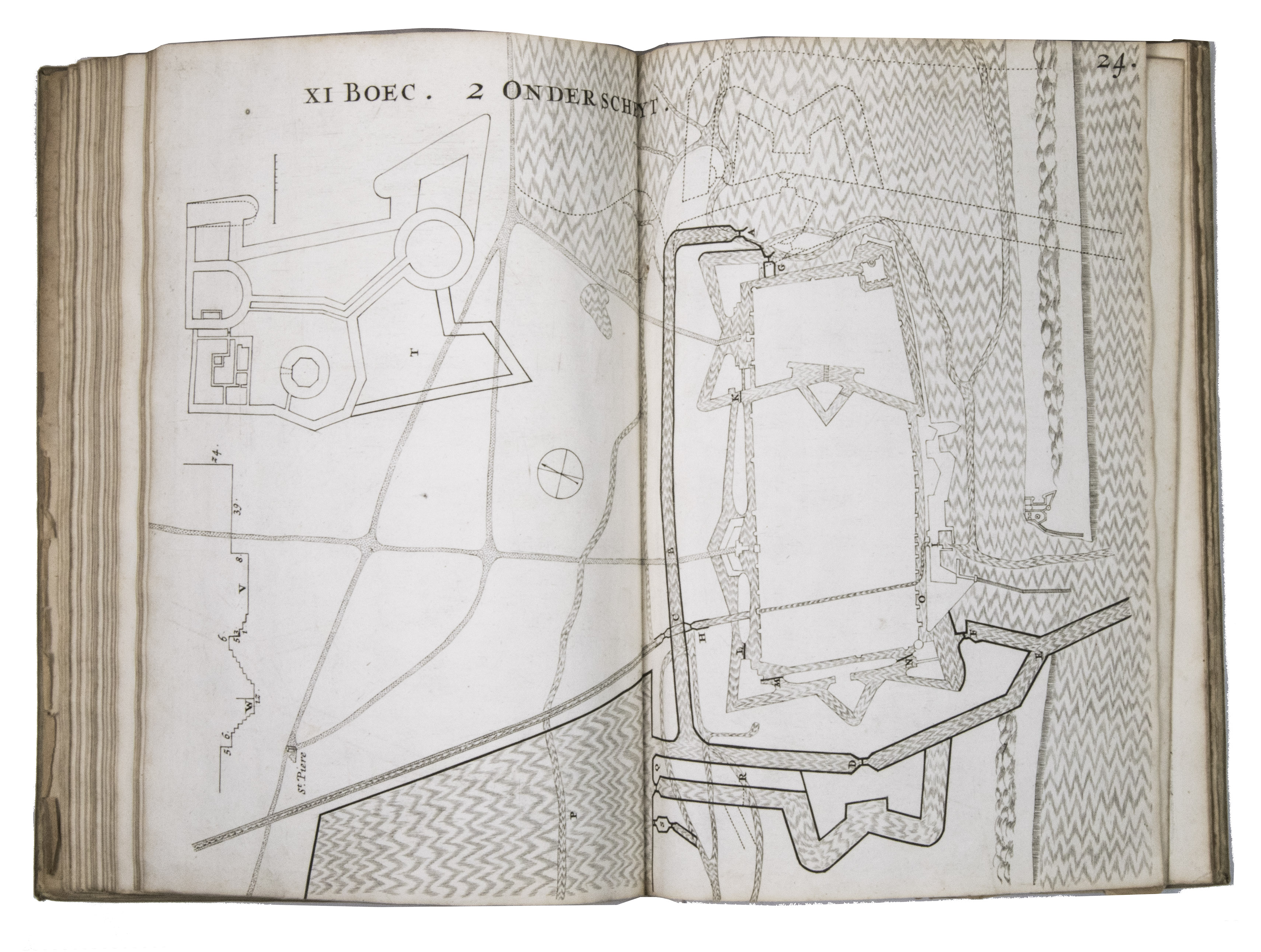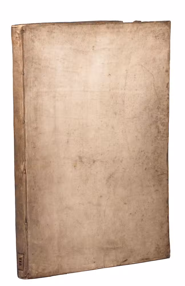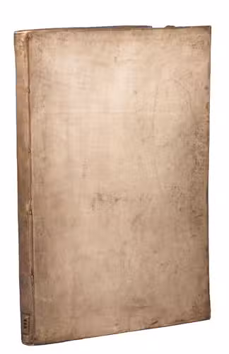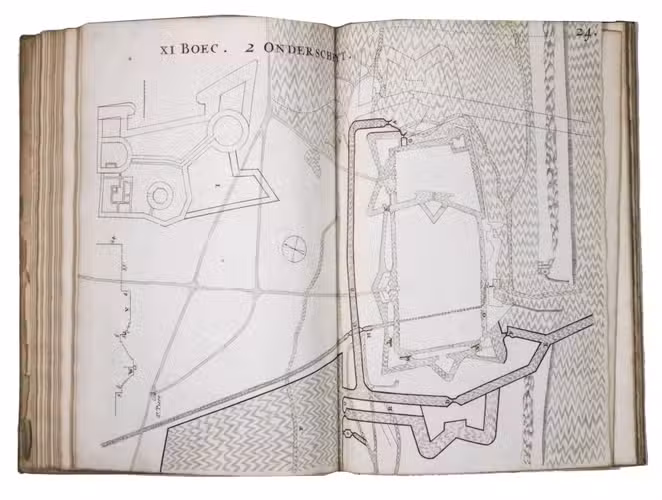 [Leiden, Philippe de Croy], 1668. Folio. With 29 double-page engraved plates, a woodcut device on the title page and a woodcut initial. Contemporary vellum, sewn on 4 supports laced through the joints, with a paper (shelfmark?) label at the foot of the spine ("115"). [2] letterpress ll. and 29 double-page engraved plates.