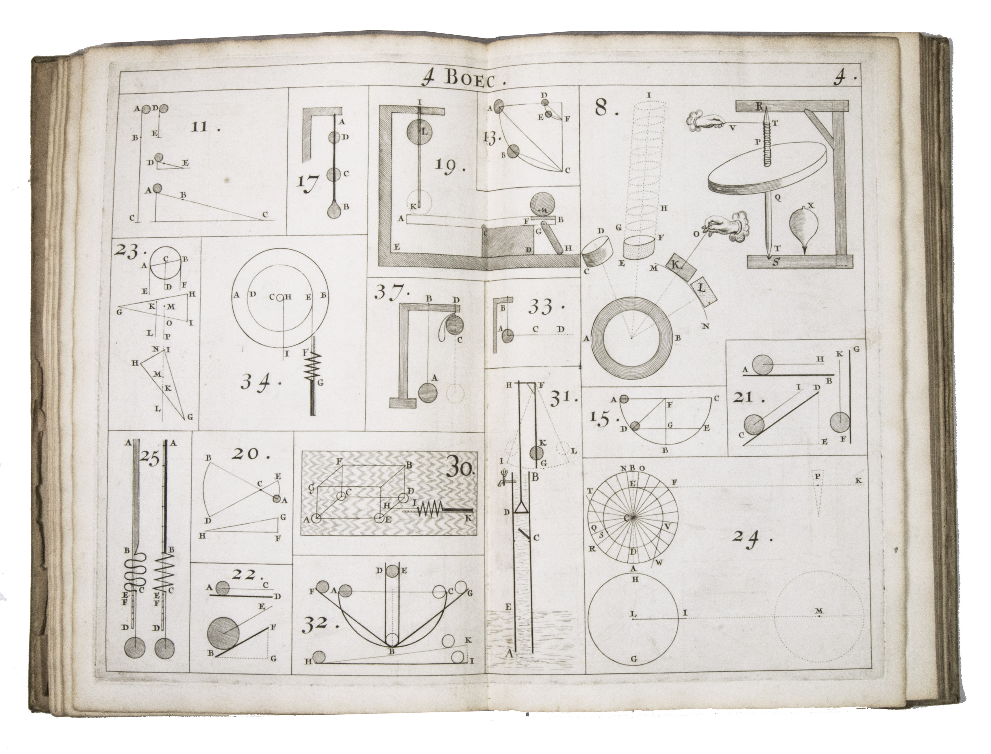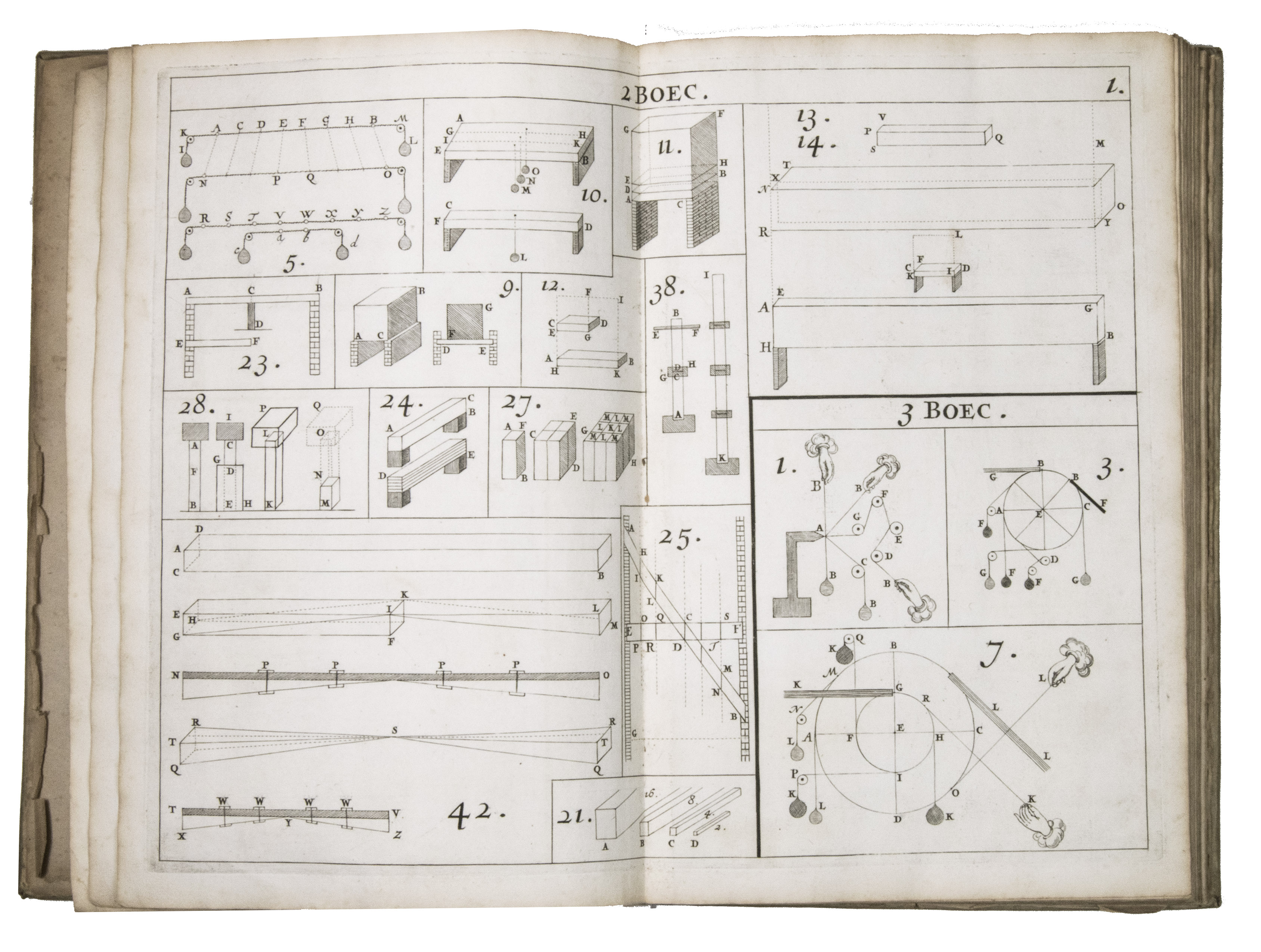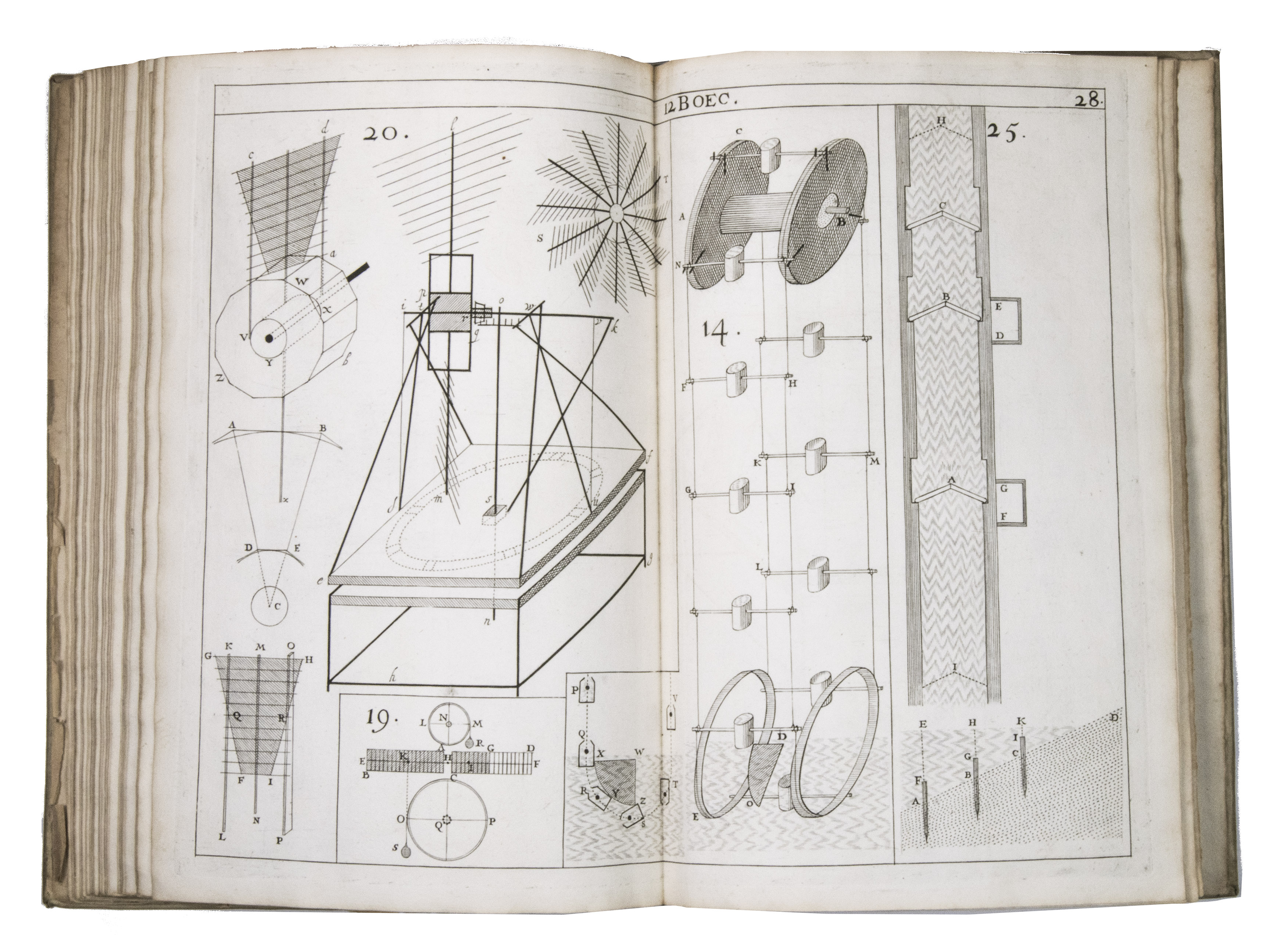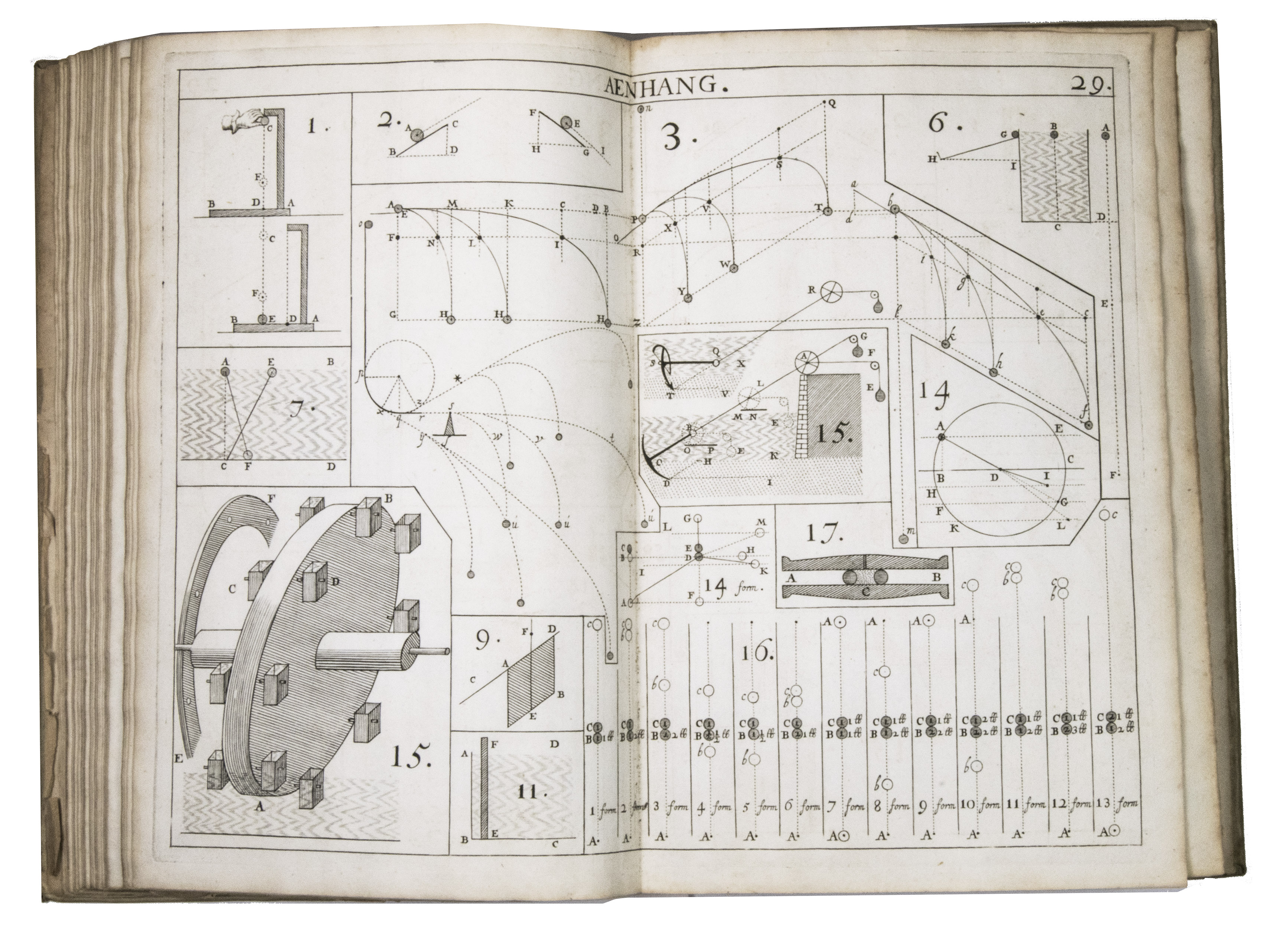 Rare first and only edition of the plate book published as the illustrative companion to Hendrik Stevins (1614-1668) Wisconstich filosofisch bedryf (1667). The work contains 29 double-page engraved plates illustrating a wide range of mechanical and hydraulic devices, including gear mechanisms, water-works, sluices, Archimedean screws, and other technical constructions connected with early modern hydraulic engineering and mechanics.