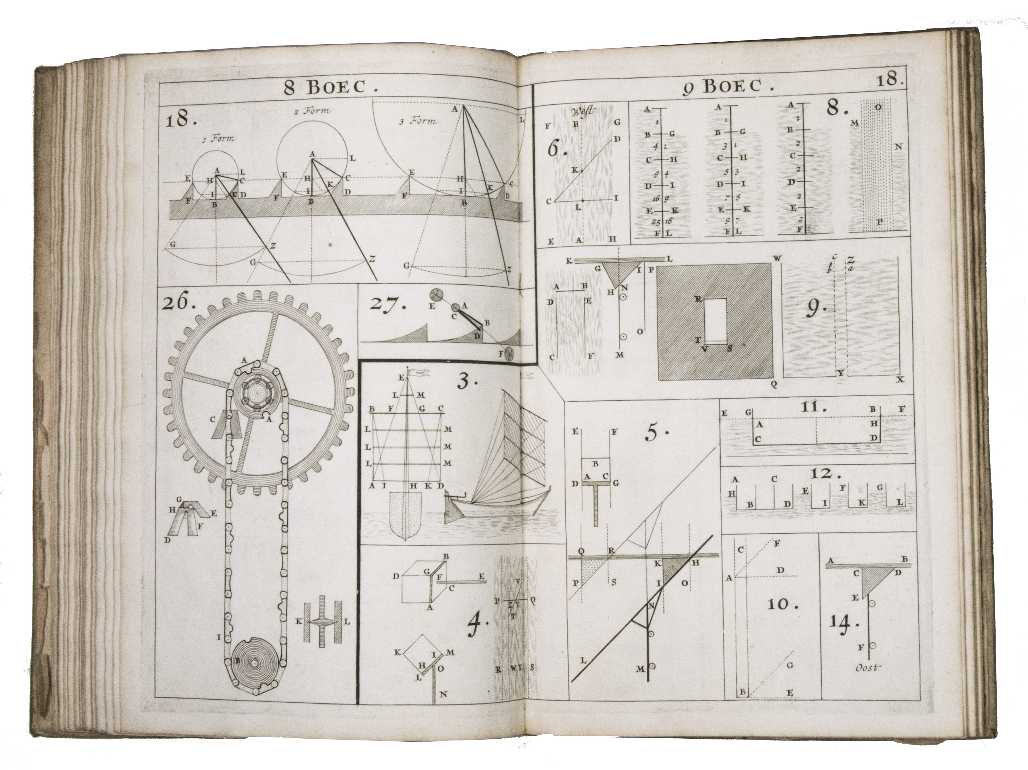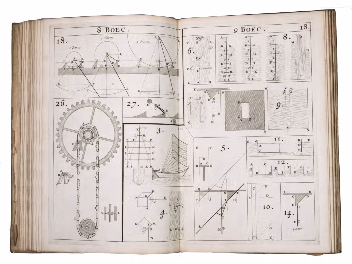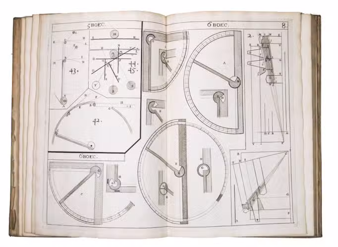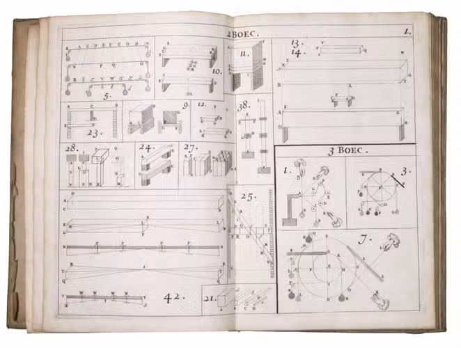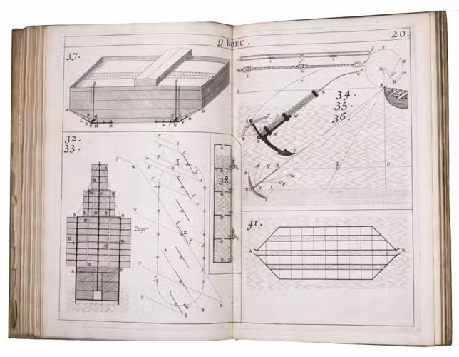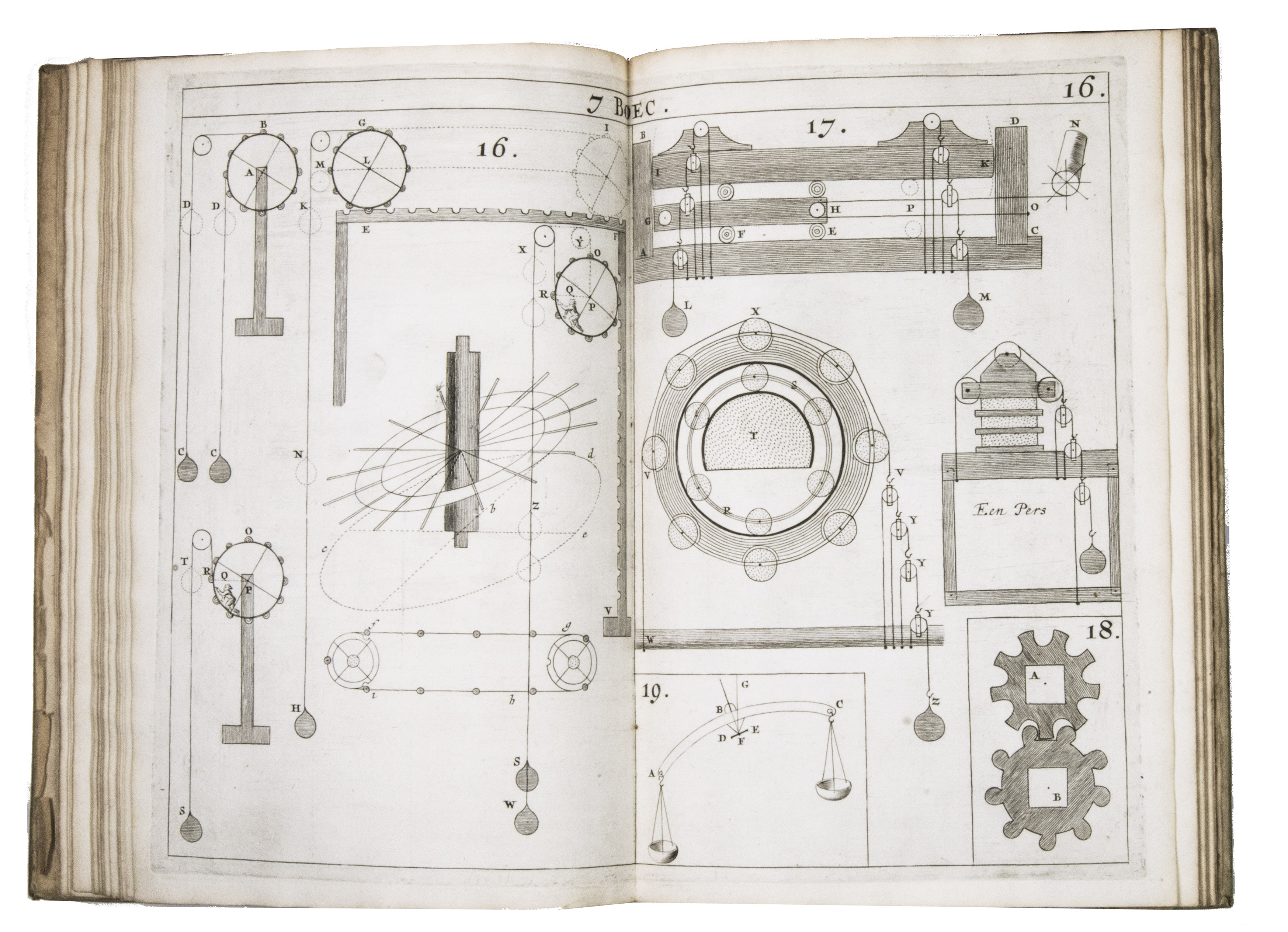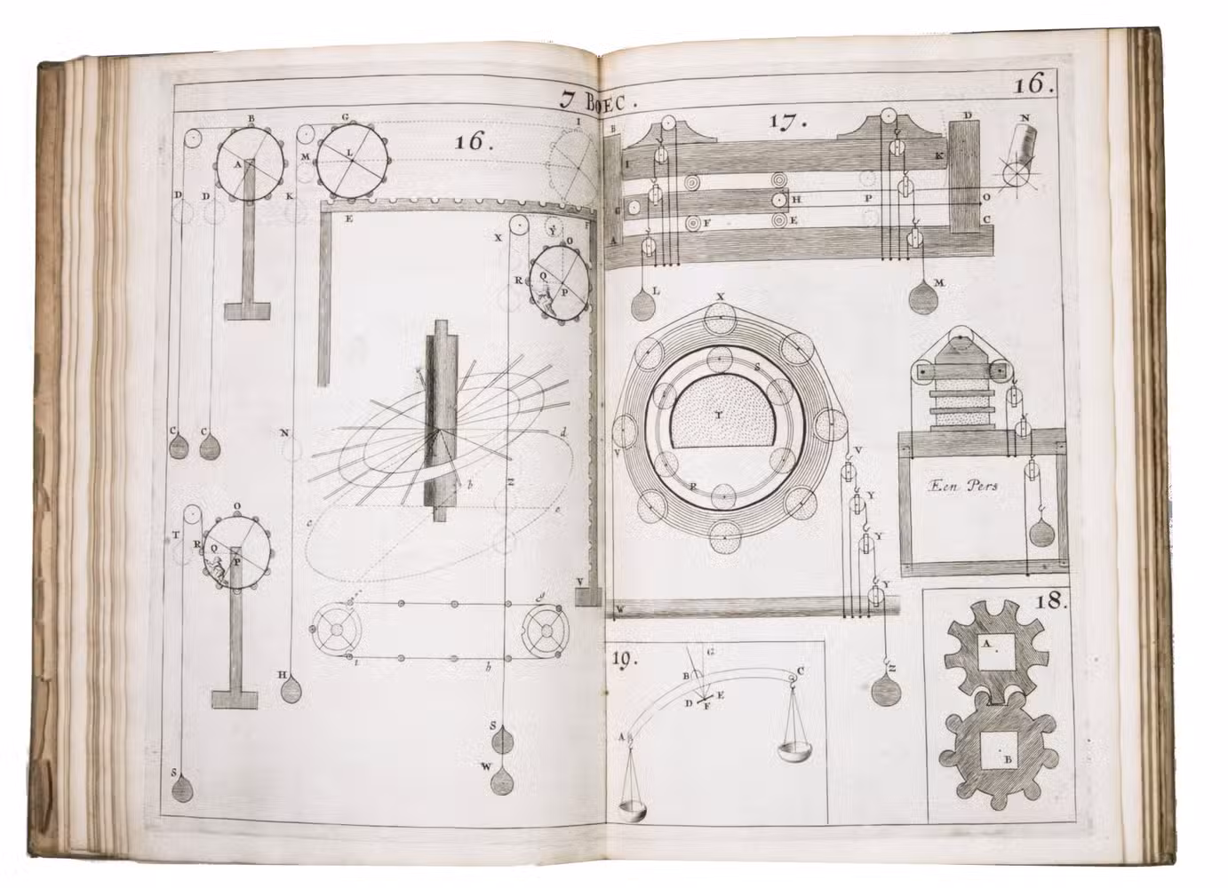 The present work belongs to the final stage of Hendrik Stevins efforts to disseminate this material. Instead of embedding illustrations within the text, he published a separate Plaetboeck containing the engraved figures intended to accompany the treatise. Many of these plates illustrate technical concepts derived from Simon Stevins manuscripts, including treatises on gears, water-mills, and hydraulic engineering. The diagrams show mechanisms for improved mill gearing, hydraulic installations, and other mechanical constructions central to Dutch water management. Such innovations, including improved gear systems for windmills, aimed at increasing the efficiency of pumping water from the polders.