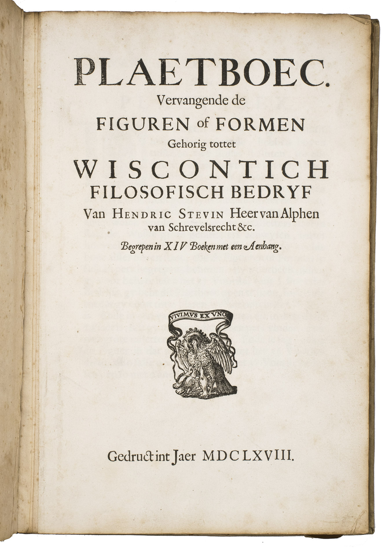 Plaetboec. Vervangende de figuren of formen gehorig tottet wiscontich filosofisch bedryf van Hendric Stevin Heer van Alphen van Schrevelsrecht &c. Begrepen in XIV boeken met een aenhang.
