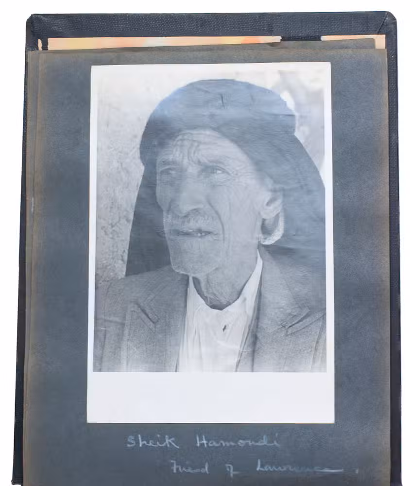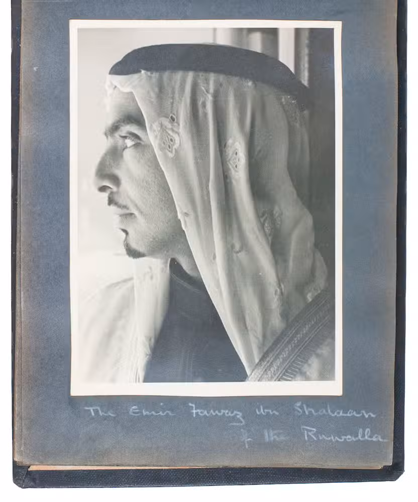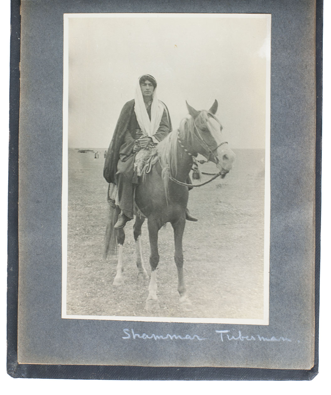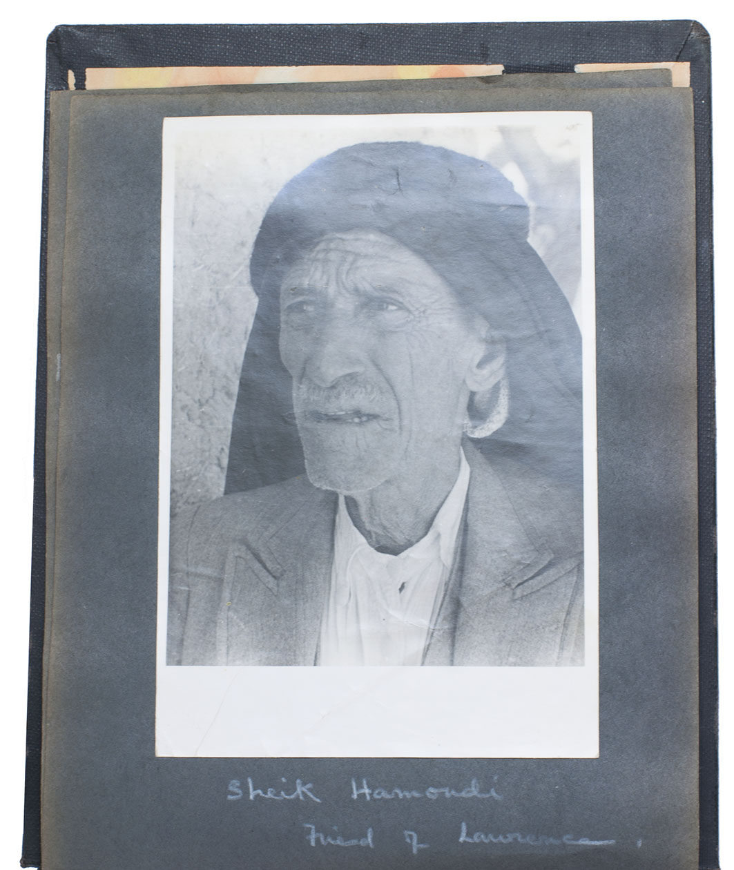 Fascinating collection of 14 photographic portraits showing 13 sheikhs and tribesmen from several tribes in and around Syria, all with captions that usually give the subject's name and tribe. The photos, often highly expressive profile studies, were taken and assembled by Lt. Col. Walter Francis Stirling (1880-1958), T. E. Lawrence's Chief of Staff in 1918. The named tribes are the Shammar (nomadic Bedouins in northern Arabia, Syria and Iraq), Ruwalla (semi-nomadic Bedouins led by the Sha'lan family, also in northern Arabia and Syria), Hadidiyin (nomadic Bedouin sheep herders in Syria and northern Iraq), Walda (Kurds in Syria), Yazidis (Kurds in northern Iraq), Agaidat (Beduoins in Syria) and "Abu Klamin"[?] (not identified). The best known subjects are Fawaz al Sha'lam, Emir of Ruwalla (grandson of Nuri Sha'lan (1847-1842!), who commanded a large portion of the troops that entered Damascus with Faisal in 1918) and Daham al-Hadi, Sheikh of the Shammar. The latter is described as "Paramount Sheikh"of the Shammar (in Iraq), a title granted him by the British in 1920 that he lost when Faisal became King of Iraq in 1921.