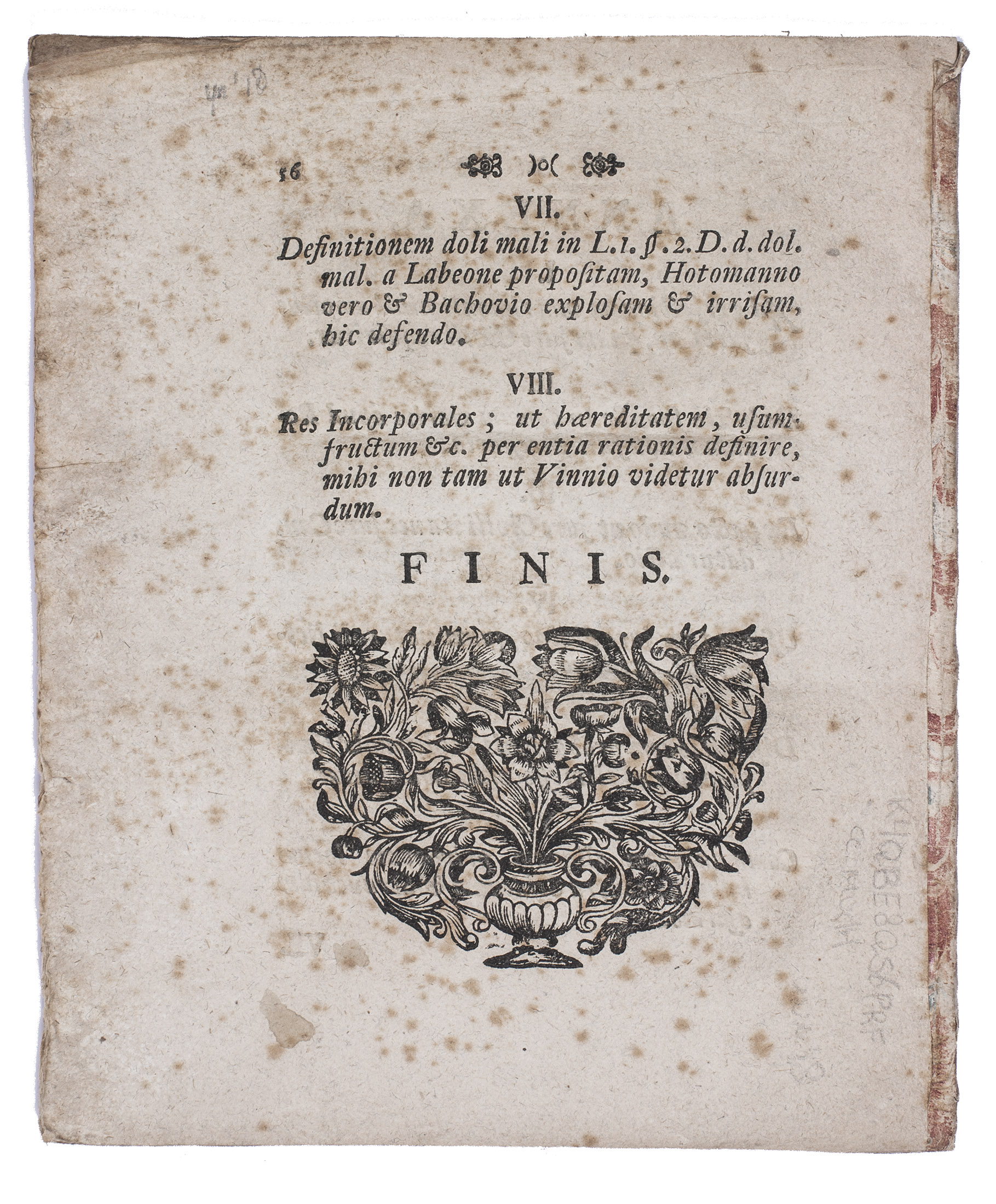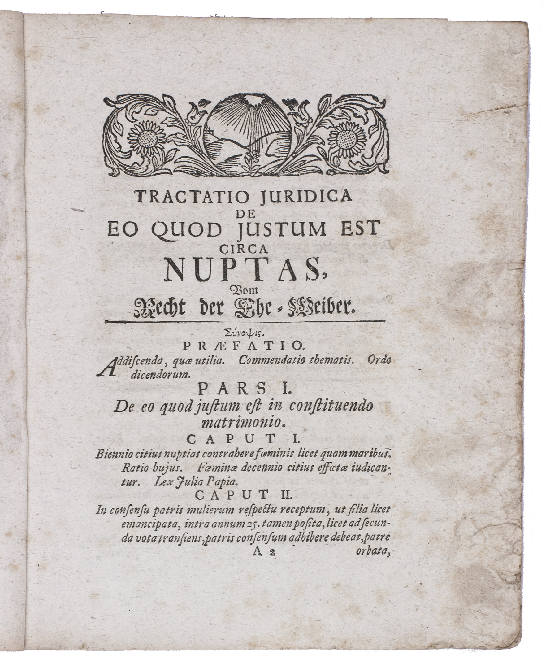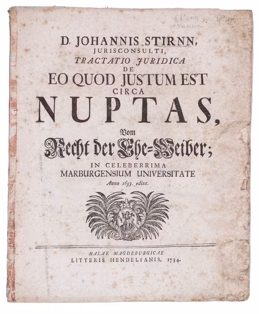 First and only edition of a treatise on law, concerning the rights of married and divorced women, written by the German lawyer Johannes Stirnn and based on his 1693thesis, Disputatio inauguralis iuridica de eo quod iustum est circa nuptas. The text is divided into three parts, which are subdivided into several chapters. The first deals with the period before the wedding day, commenting on the proper age of women to marry, dowries, engagements, and the rights of a woman during her engagement. The second part deals with the roles and rights of men and women within a marriage, heritage agreements and remarriage. The third and last part deals with the dissolution of a marriage: justified and unjustified reasons for divorce, the punishment for unjustified divorce, remarrying after divorce and more.