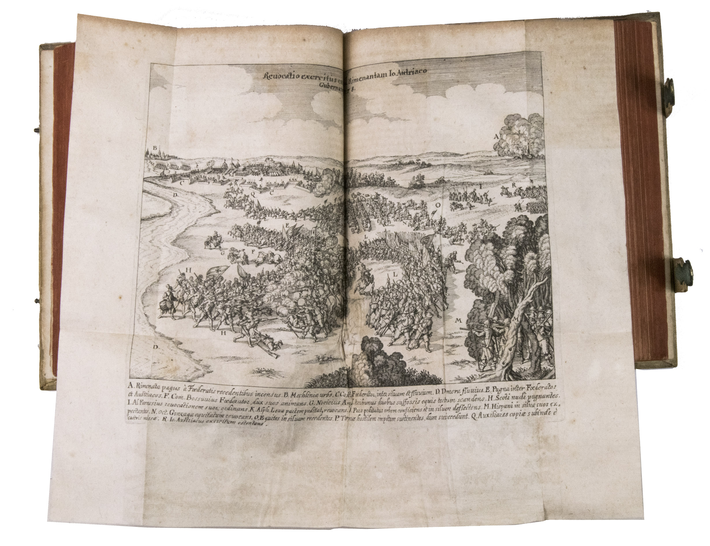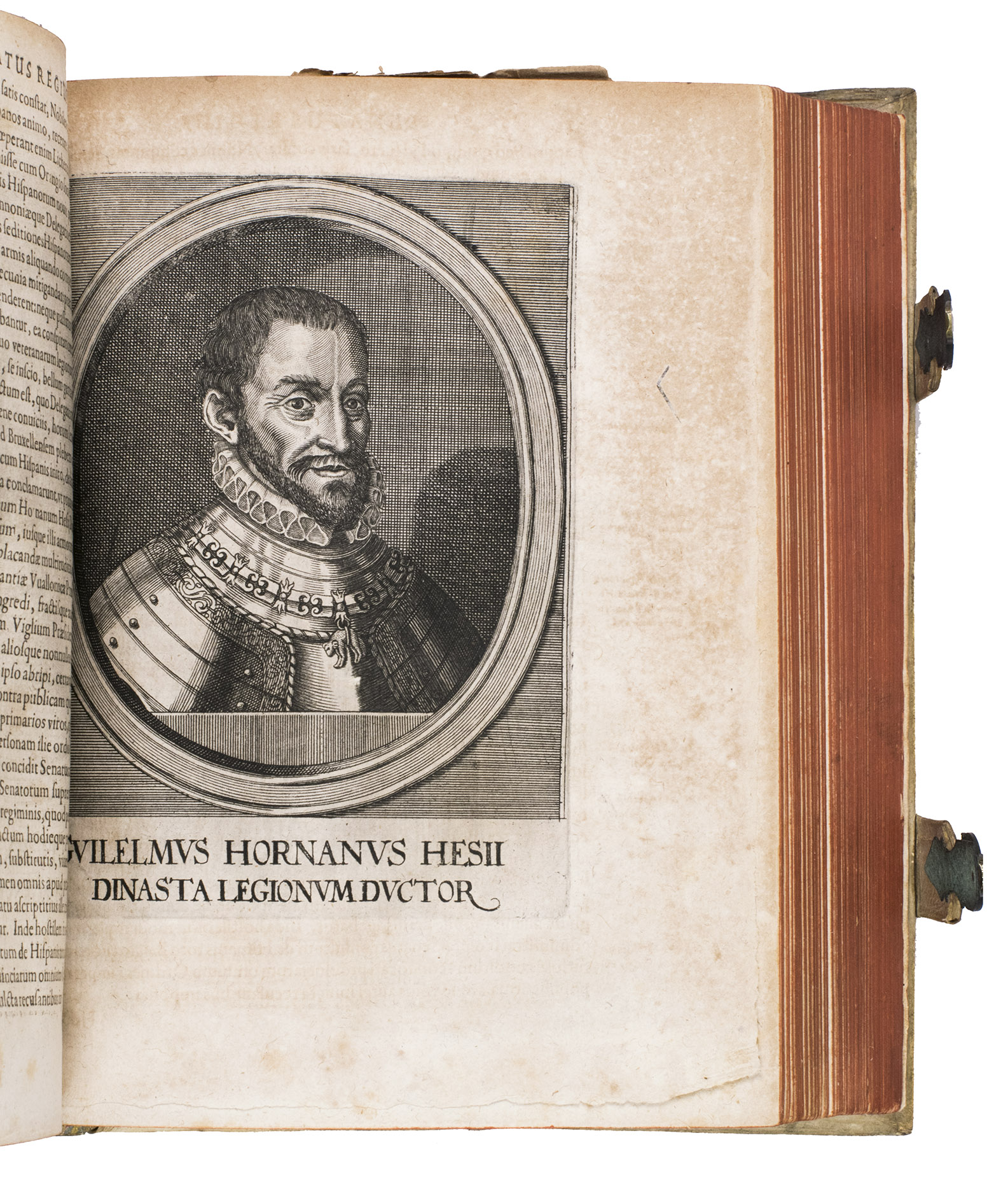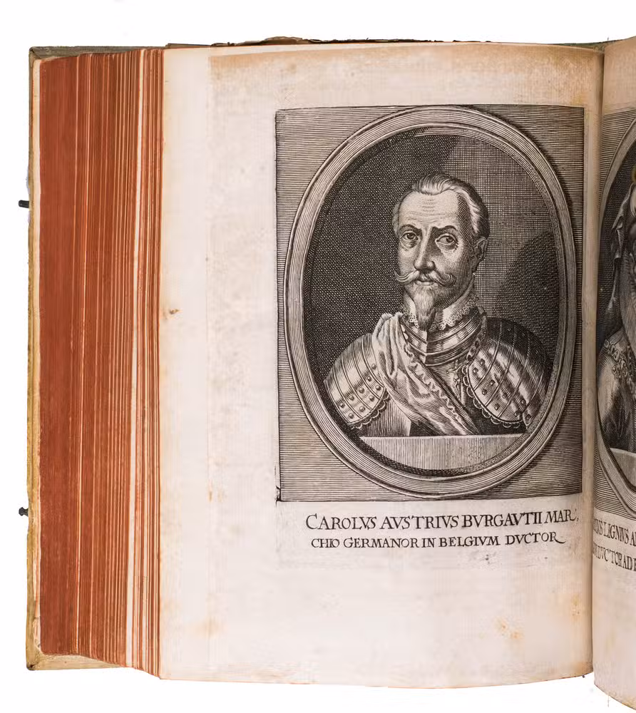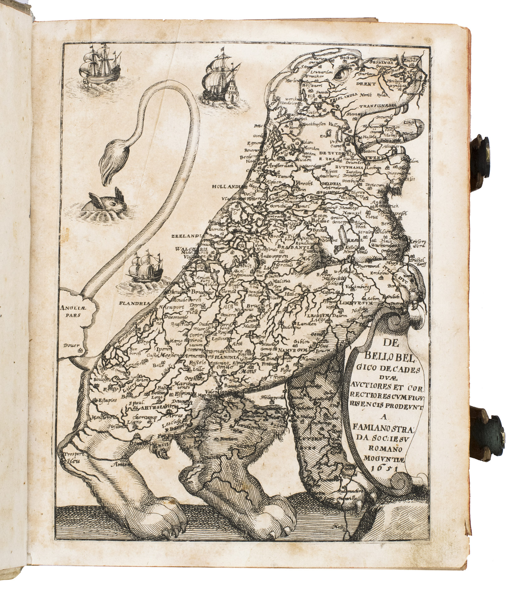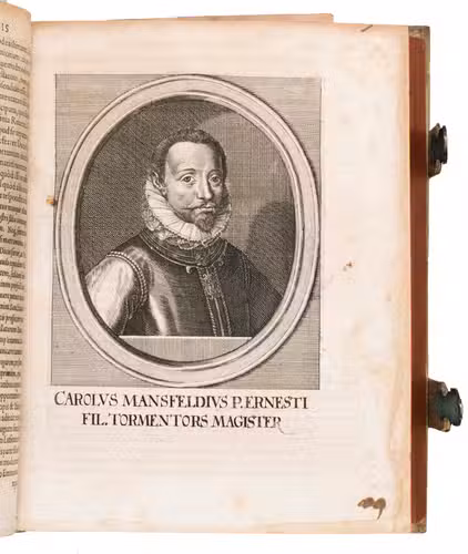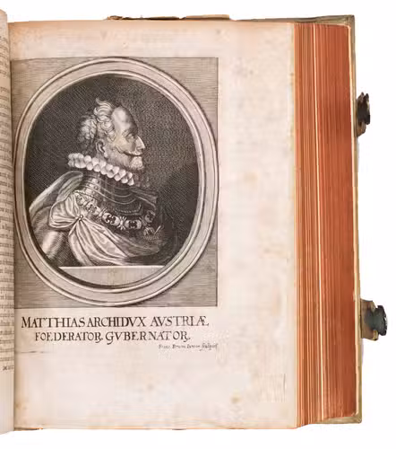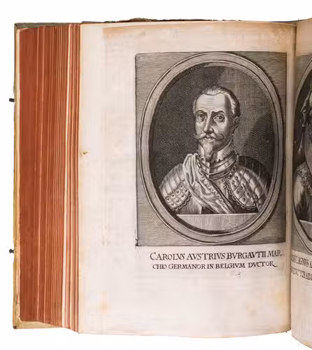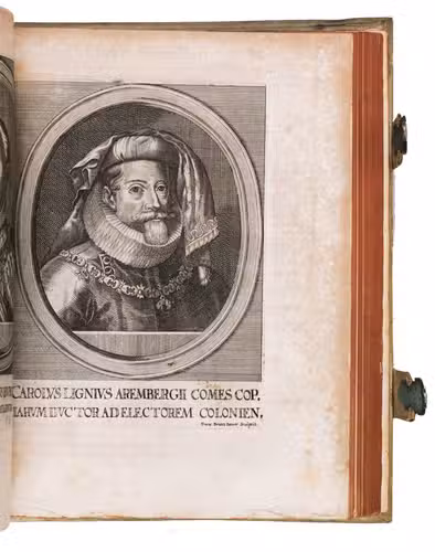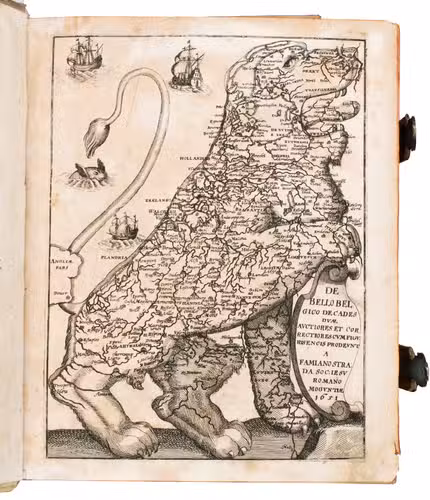 Frankfurt am Main, Johannes Beyer, 1651. 4to. With an engraved Leo Belgicus map as a frontispiece, 26 engraved portraits (one of the author), and 30 folding engraved battle scenes. Contemporary richly blind-tooled pigskin. [8], 778, [104] pp.