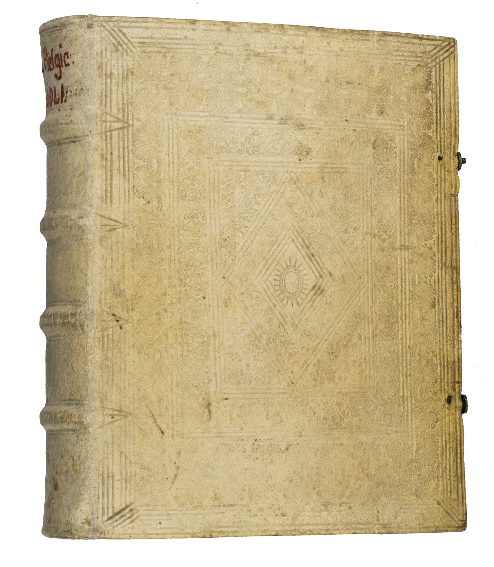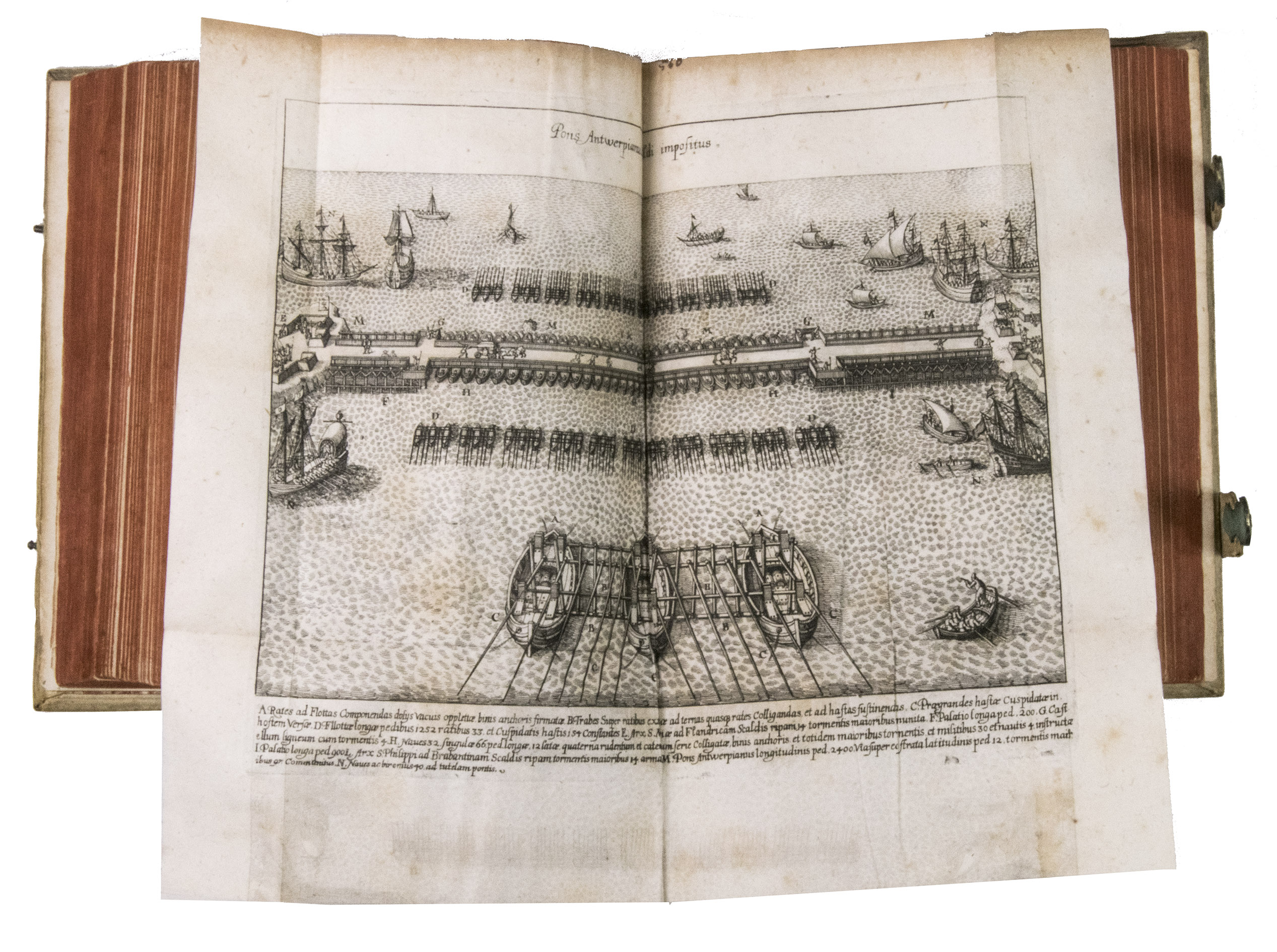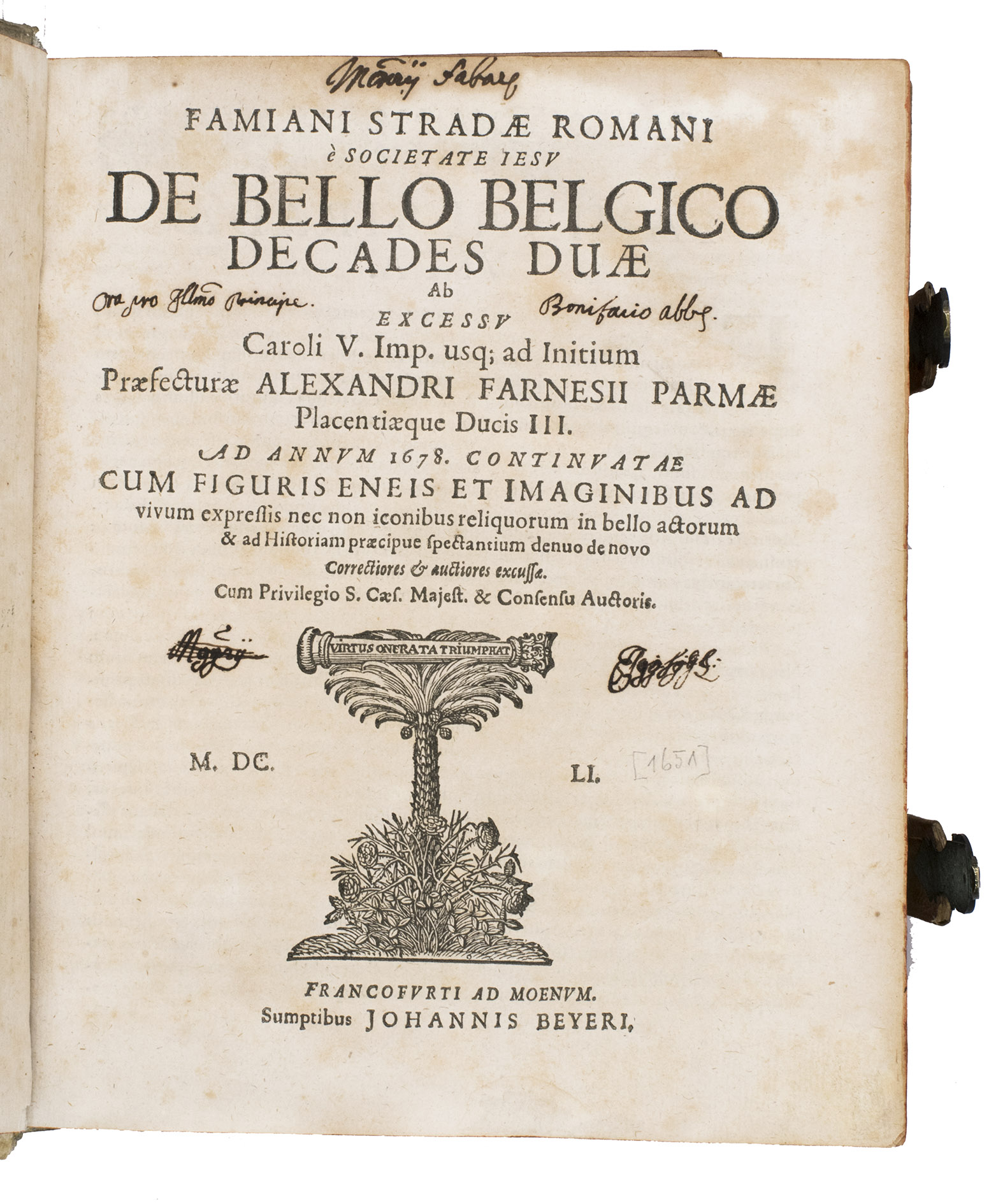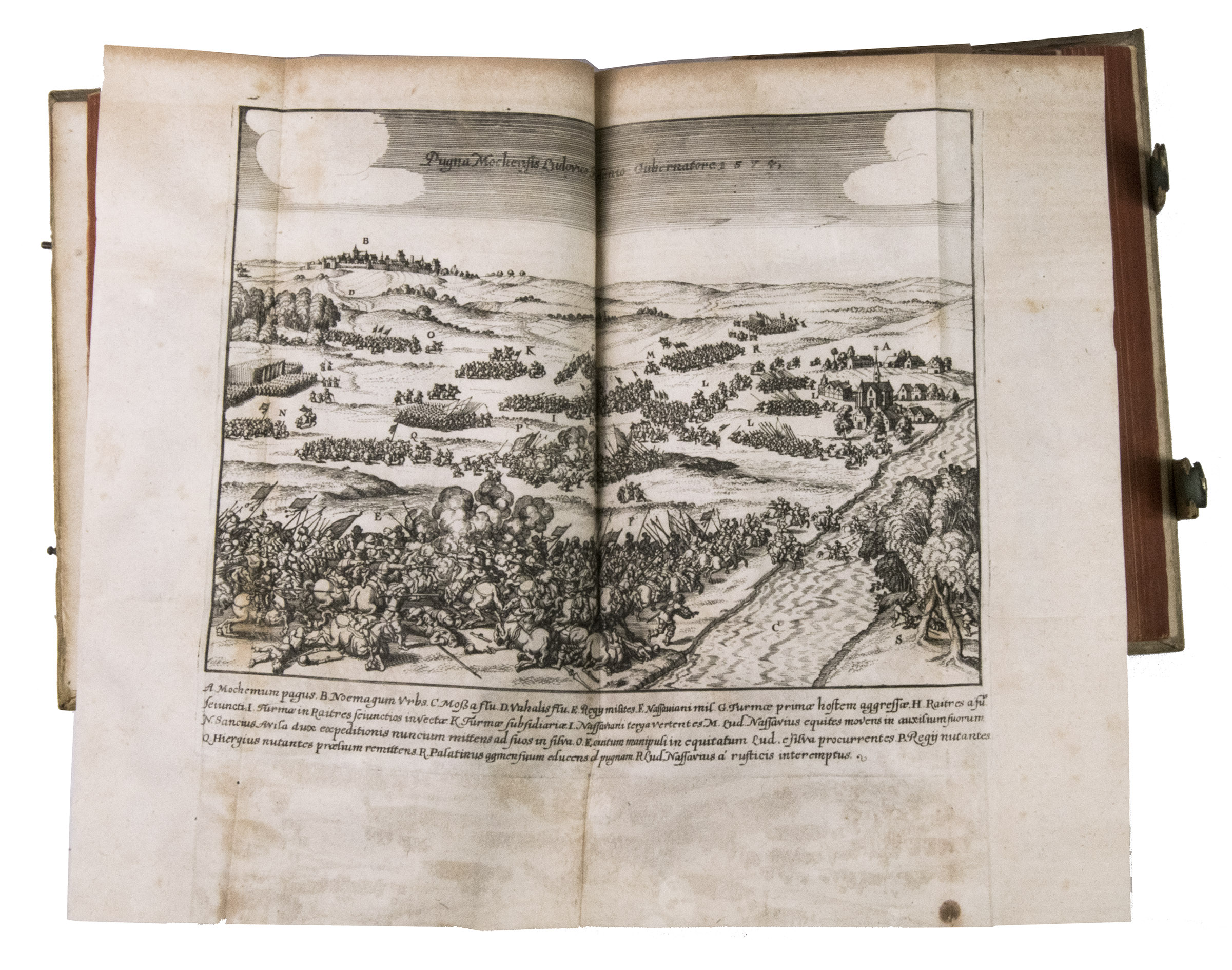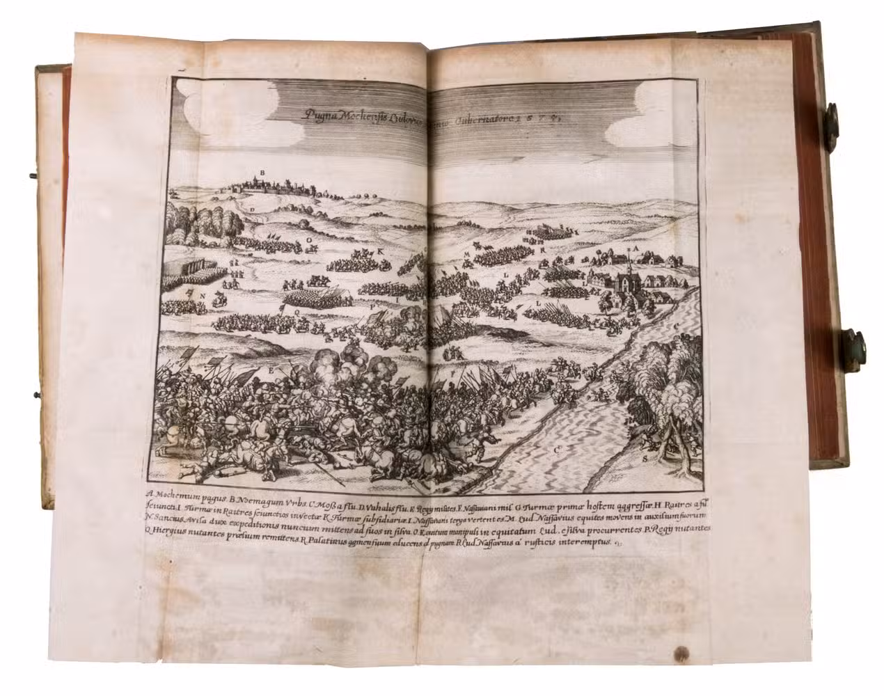 Frankfurt am Main, Johannes Beyer, 1651. 4to. With an engraved Leo Belgicus map as a frontispiece, 26 engraved portraits (one of the author), and 30 folding engraved battle scenes. Contemporary richly blind-tooled pigskin. [8], 778, [104] pp.