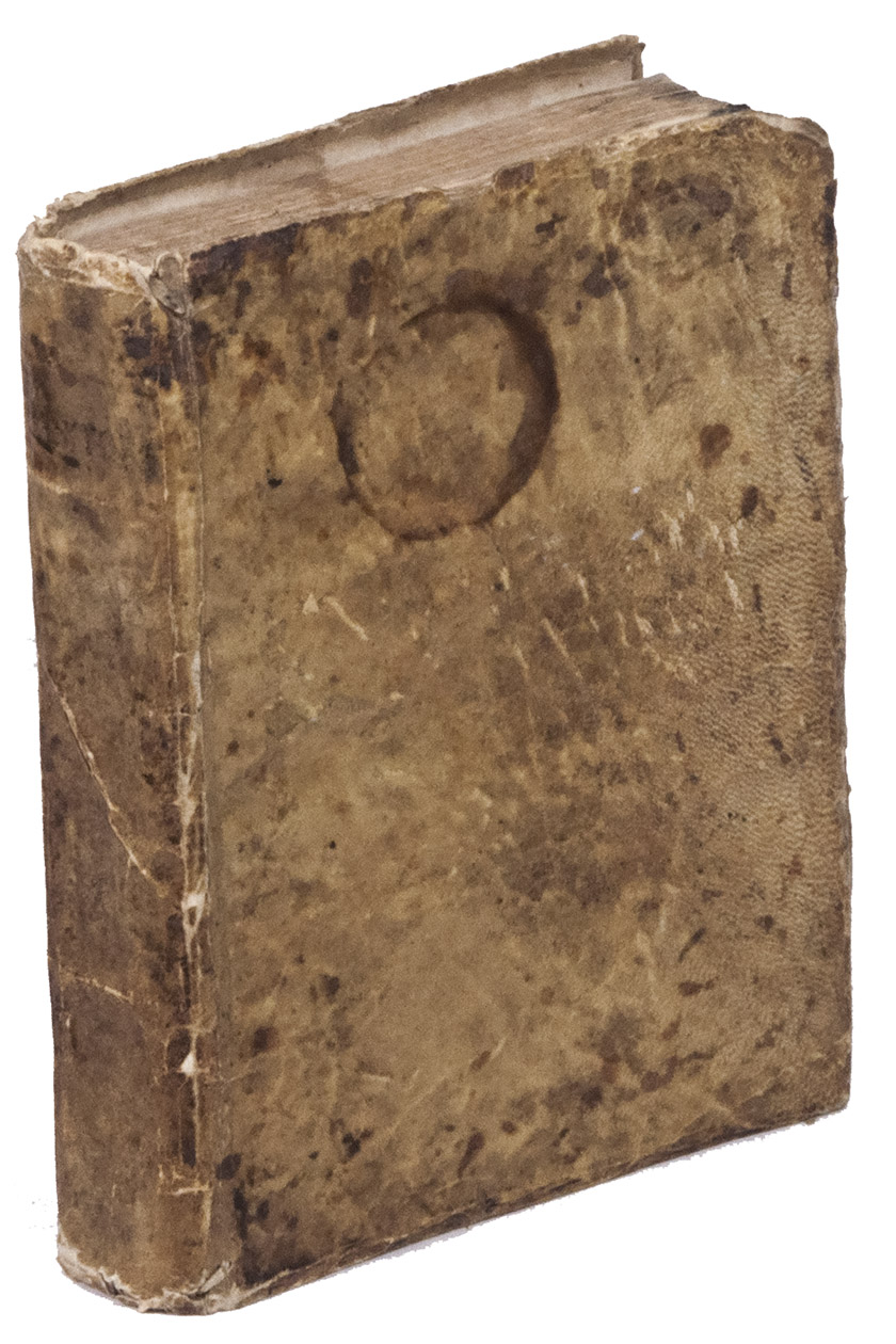 The binding is worn and stained and nearly detached from the book block. Slight foxing throughout, with a large black ink stain to the upper outer corner of the book block, not affecting the text, some worm holes in the gutter margin, not affecting the text. Otherwise in good condition. Palau 196168; WorldCat 1063922766, 433569478, 807715984, 29614101 (8 copies).