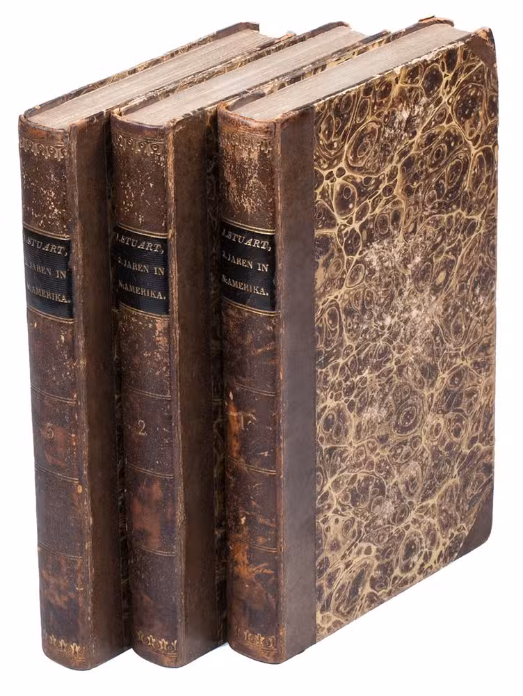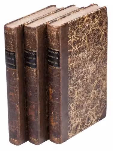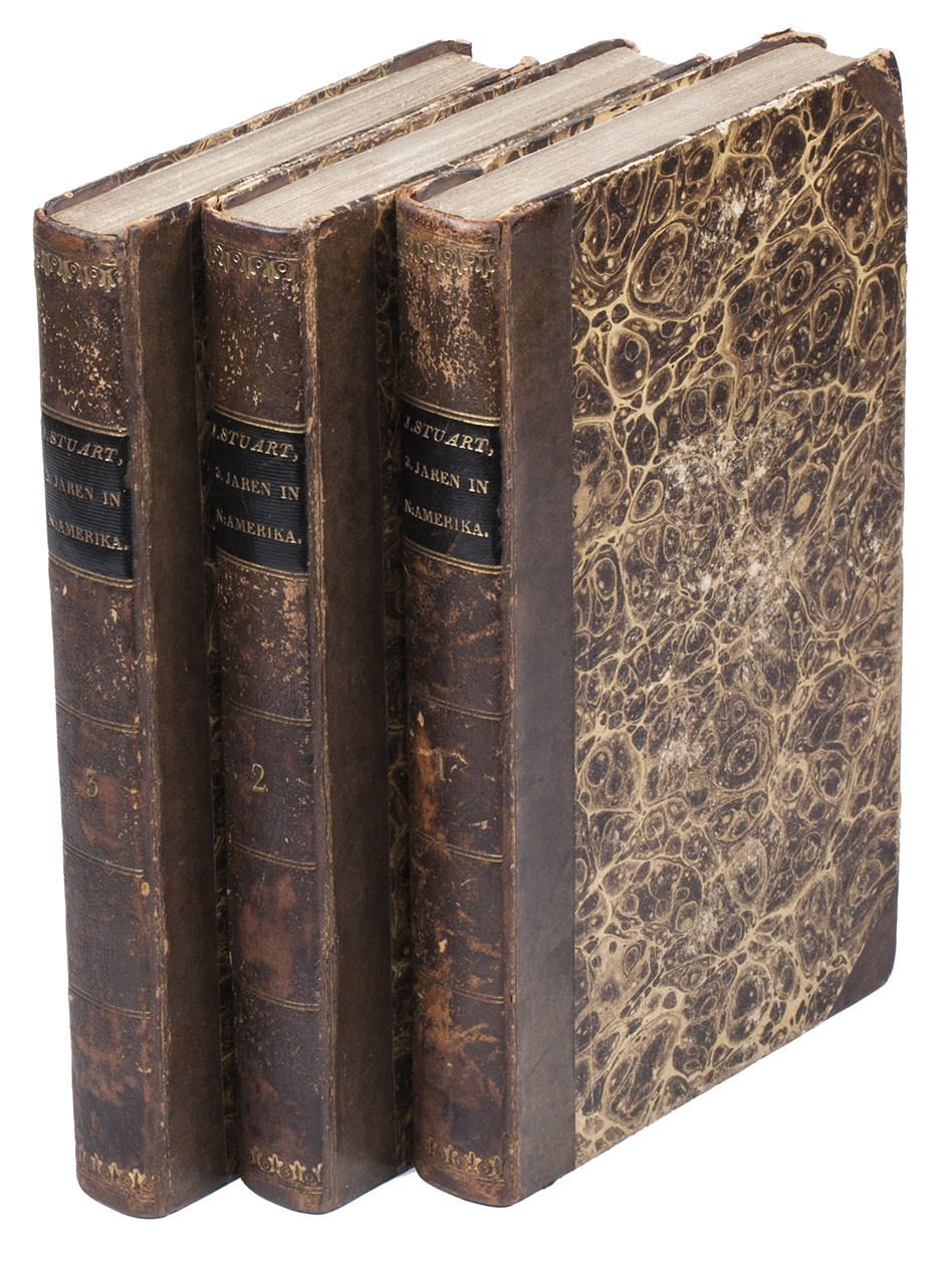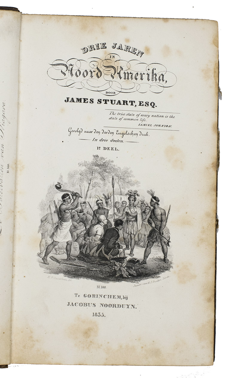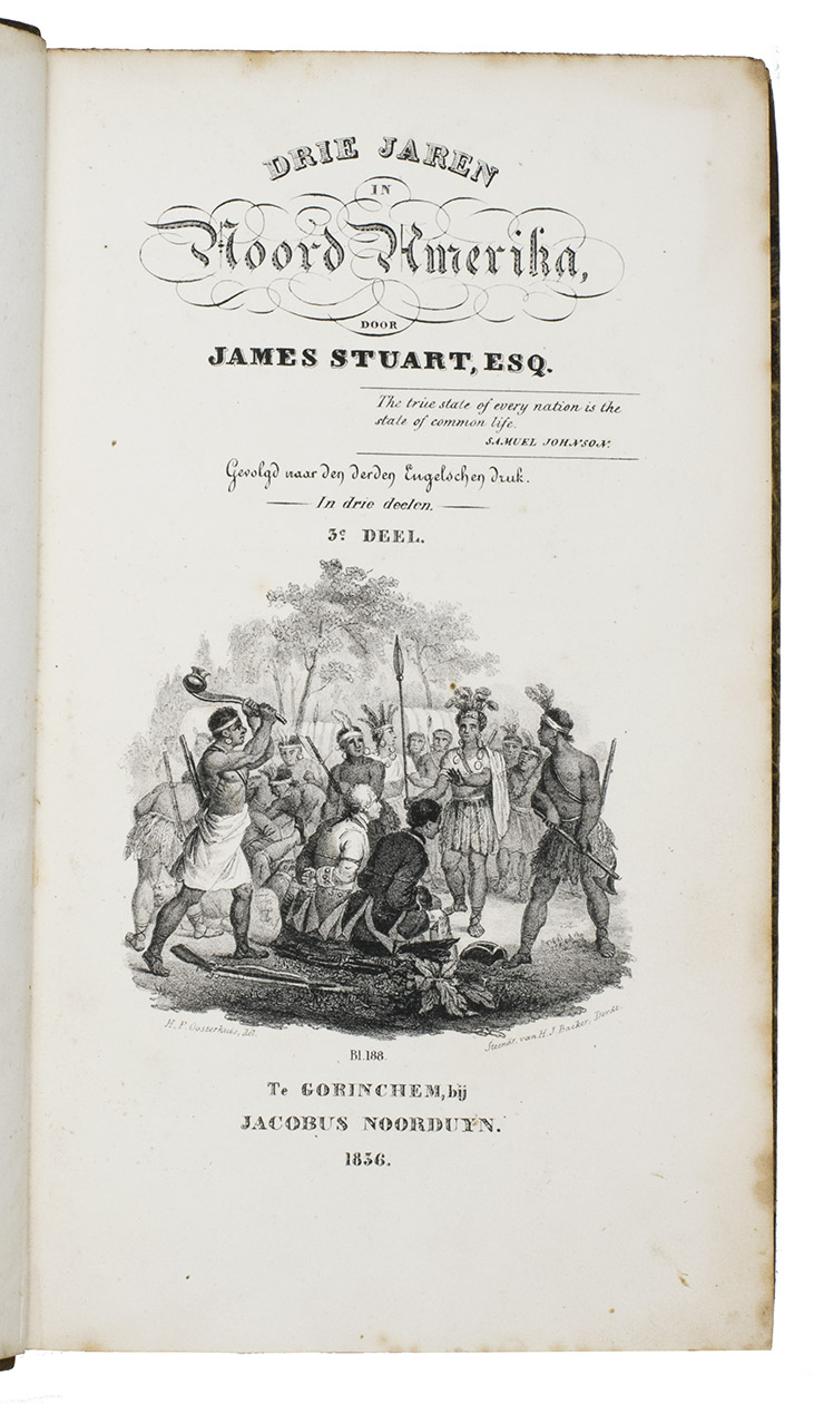 Gorinchem, Jacobus Noorduyn, 1835-1836. 3 volumes. 8vo. With an engraved title-page in each volume, showing indigenous Americans stopping of an execution of two Europeans with a raiding convoy in the background, lithographed by Hilmar Johannes Backer (1804-1845) after a design by Haatje Peters Oosterhuis (1799-1854). Also with a frontispiece showing the Niagara Falls, a lithograph by Hilmar Johannes Backer. Contemporary half calf, brown marbled-paper sides. [2], XVI, 404, [1], [1 blank]; VII, [1 blank], 382; VII, [1 blank], 386, [1], [1 blank] pp.
