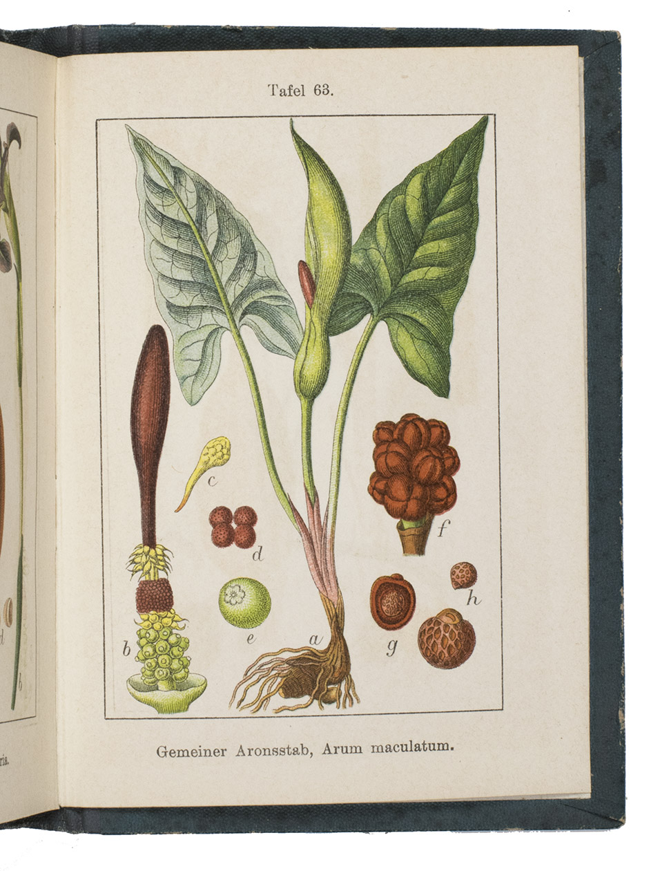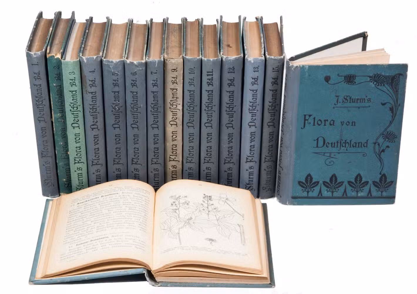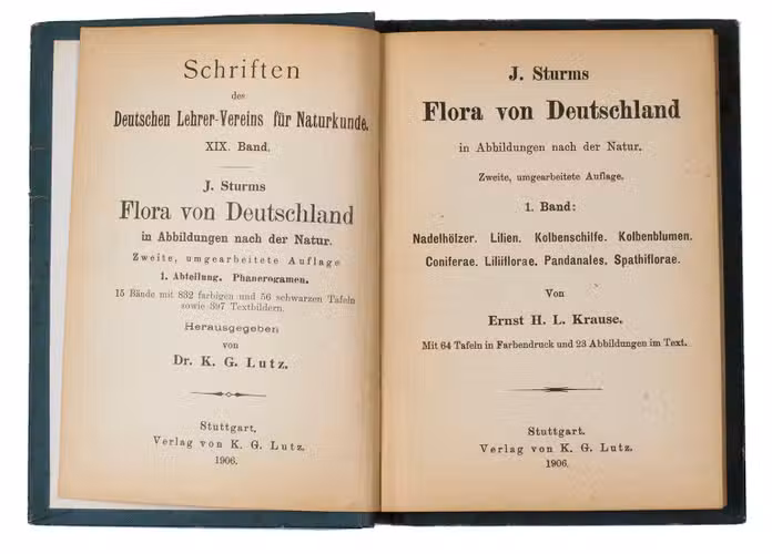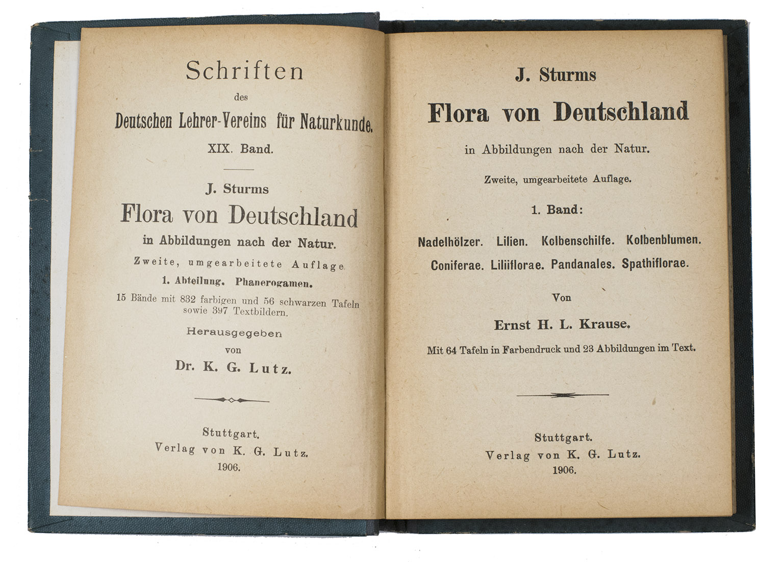 Second, extensively revised edition of the phanerogams volumes of Flora von Deutschland by the German botanical artist and engraver Jacob Sturm (1771-1848), first published at Nürnberg in the years 1798-1862 (some bibliographies say 1855 or 1861) It comprised three parallel series with a total of 36 volumes (Arnold Arboretum and Bradley apparently missed one or two of the last volumes. The three series cover phanerogams (seed plants), cryptogams (spore plants) and fungi. The present second edition, rarely recorded in the literature, covers only the first series: phanerogams. It appeared as volumes 6-21 in the series Schriften der deutschen Lehrer-vereins für Naturkunde, and the text is almost entirely new. The German botanist Ernst Hans Ludwig Krause (1859-1942) seems to have been responsible for this edition and may have written the new text. Each volume describes a different category of seed plant (including trees, bushes and flowers). The 1st volume, for example, describes conifers and lilies, the 2nd and 3rd different kinds of gramineae, the 4th orchids and aquatic herbs and the 8th roses. The 15th volume is an index.