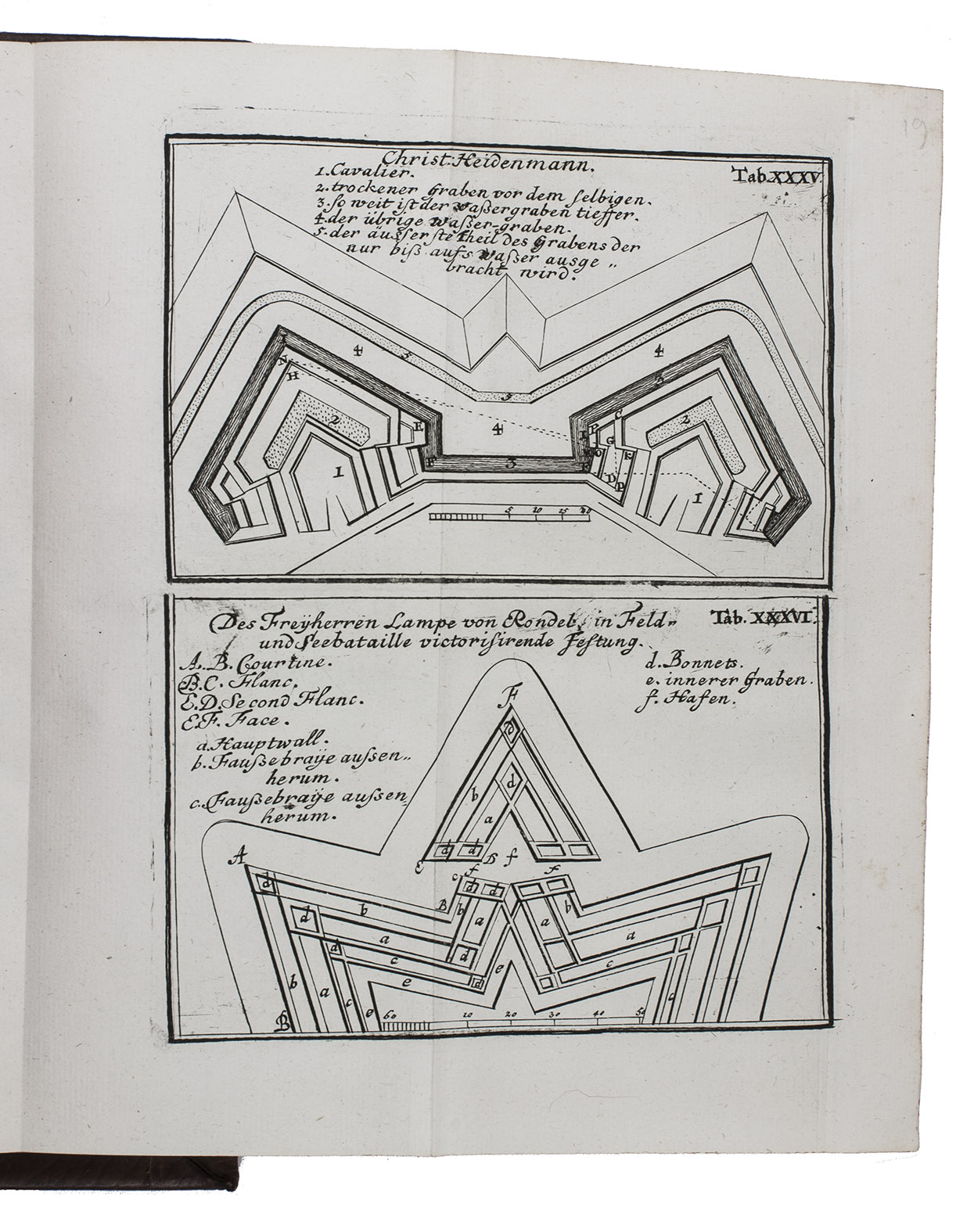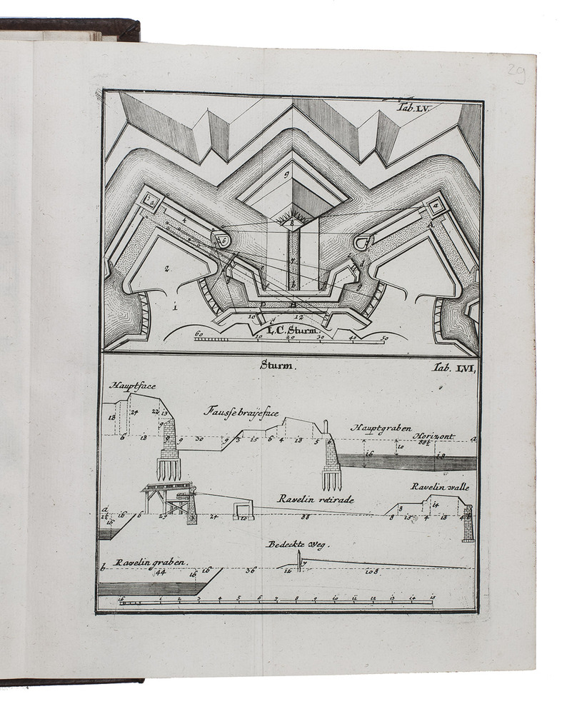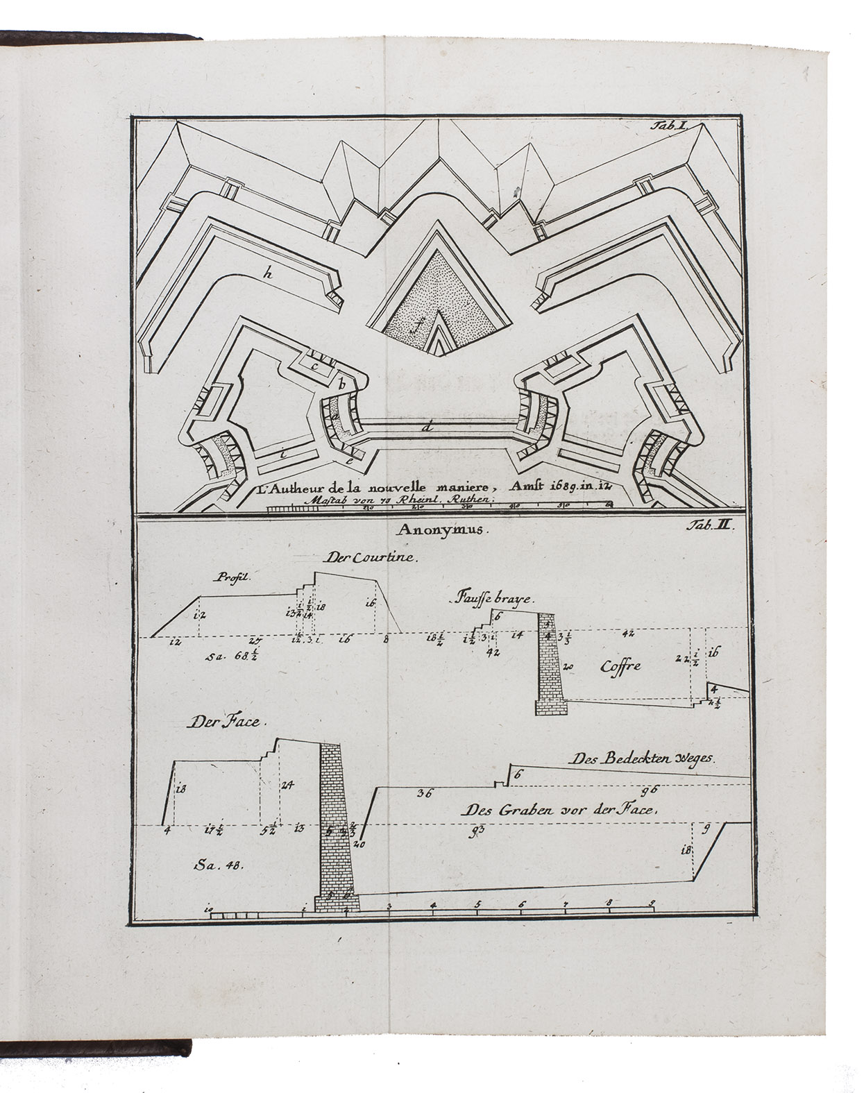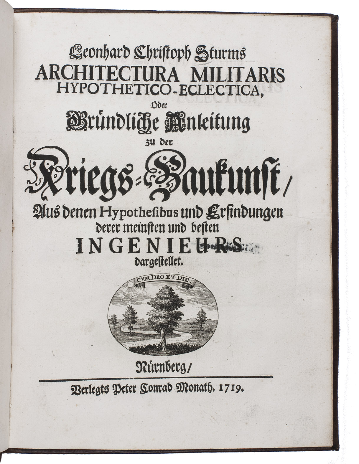 Second edition of a work on military architecture by the German architect and theologian Leonhard Christoph Sturm (1669-1719), "the foremost German architectural theorist of the early 18th century" (Neville). It is written in the form of a dialogue between an engineer and a youth, and divided into "conversations" instead of chapters. They talk about several well-known military engineers and their methods of fortification, including Errard de Bar le Duc, Blondel, Coehoorn, Vauban and many others. The young man poses brief questions and the engineer gives extensive answers, commenting on the advantages and disadvantages of different defence methods. The conversations are clarified in the illustrations, which depict many types of fortifications, often giving details and profiles.