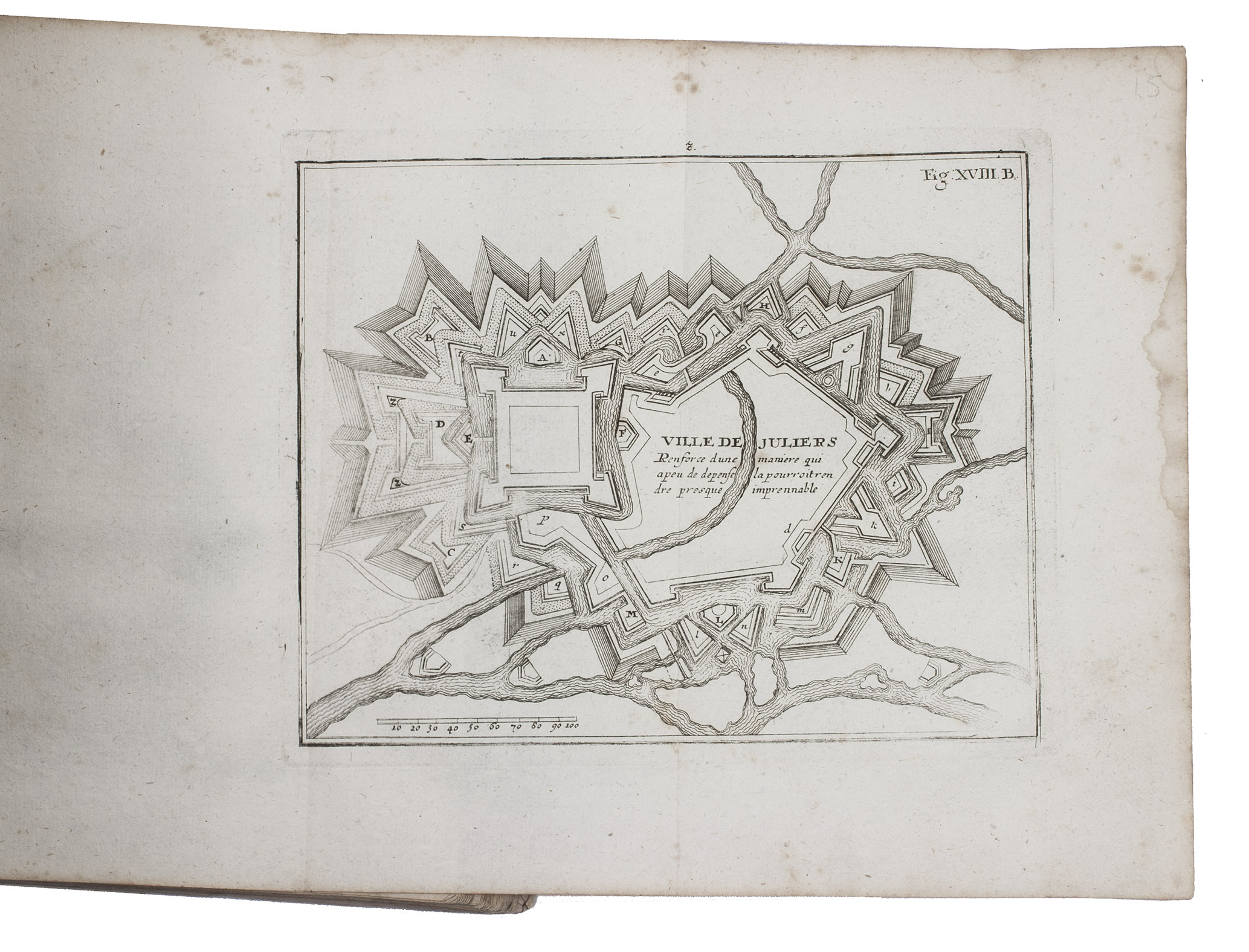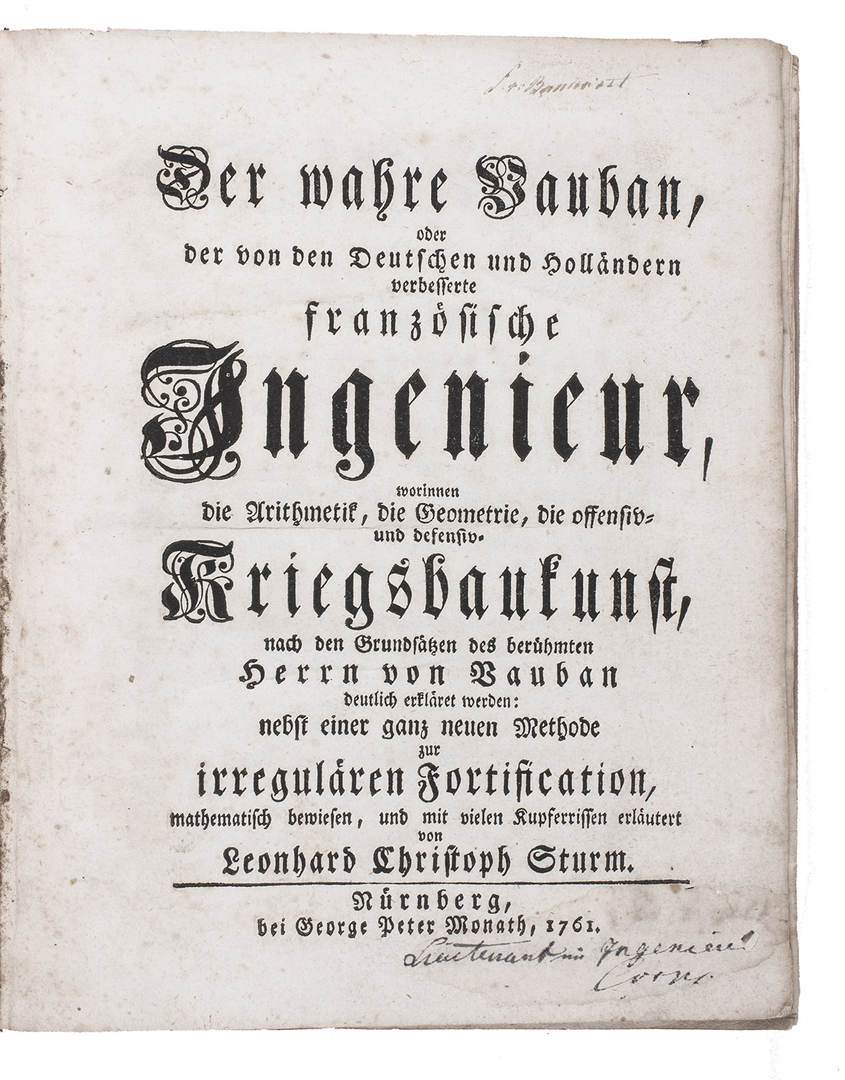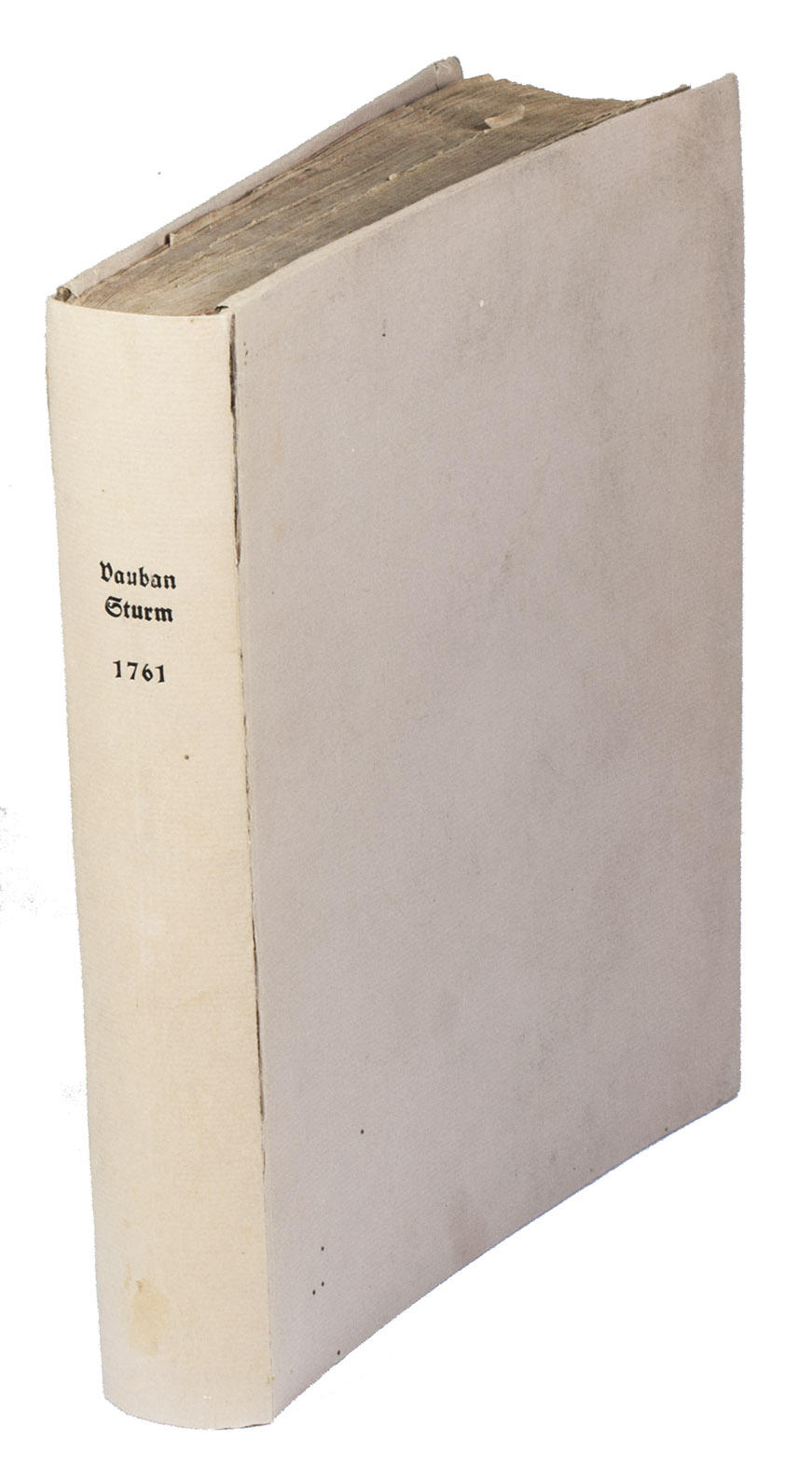 Ad 1: Third edition of a work on the famous French military engineer Sébastien le Prestre de Vauban (1633-1707) by the German philosopher and engineer Leonhard Christoph Sturm (1669-1719). The book is divided into three parts, the first dealing with mathematics and the second the geometry, with some letterpress tables in the text and some geometric figures on 8 engraved plates. The third part deals with the method of fortification according to Vauban, accompanied by 23 plates showing fortresses of various shapes.