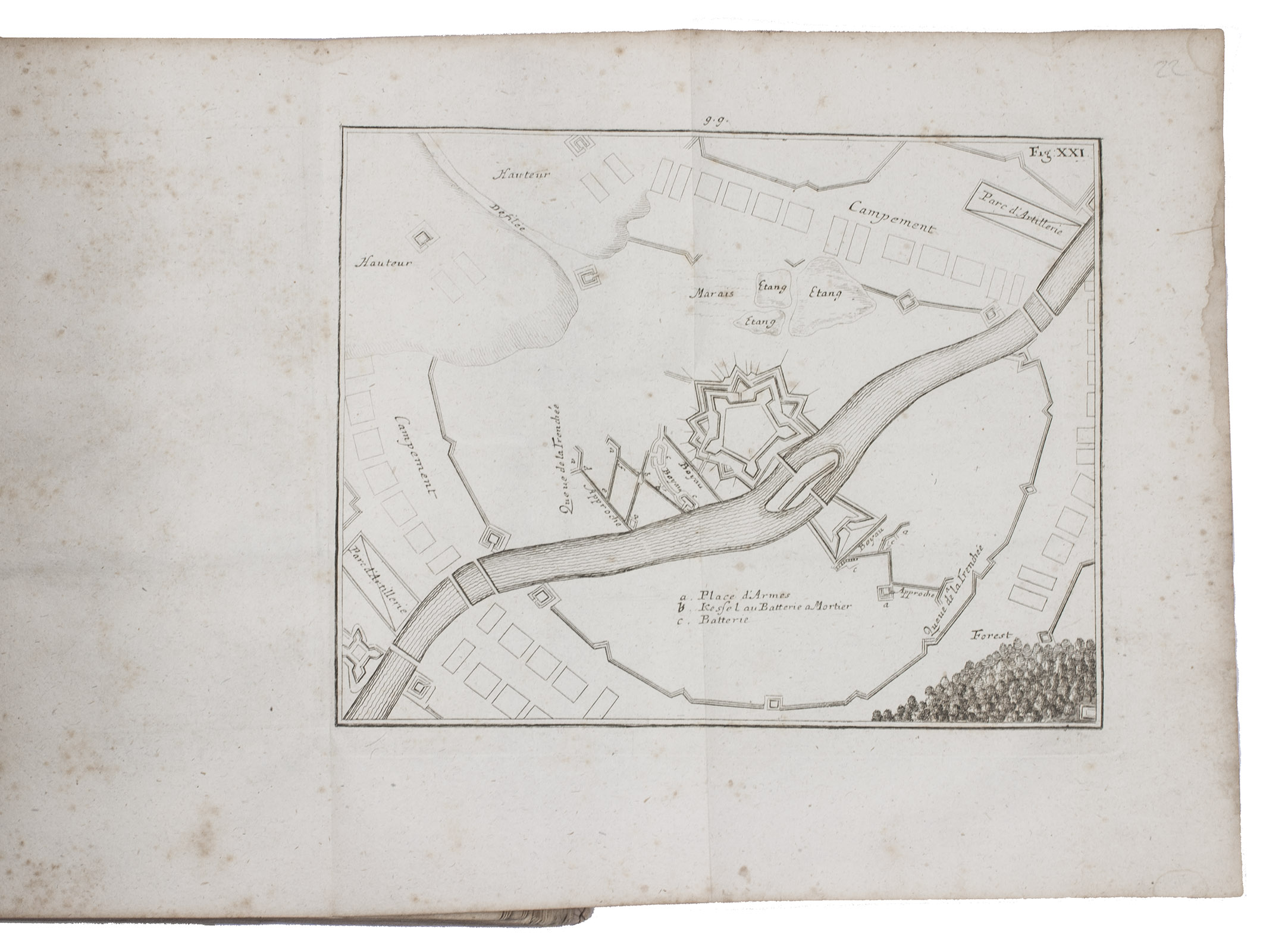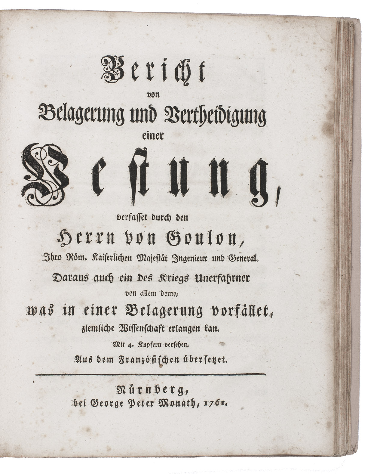 With: (2) GOULON, Louis. Bericht von Belagerung und Vertheidigung einer Festung.Nuremberg, George Peter Monath, 1761. With 4 engraved plates. 2 works in 1 volume. 4to. Modern plain paper boards. [6], 157, [11]; 56 pp.