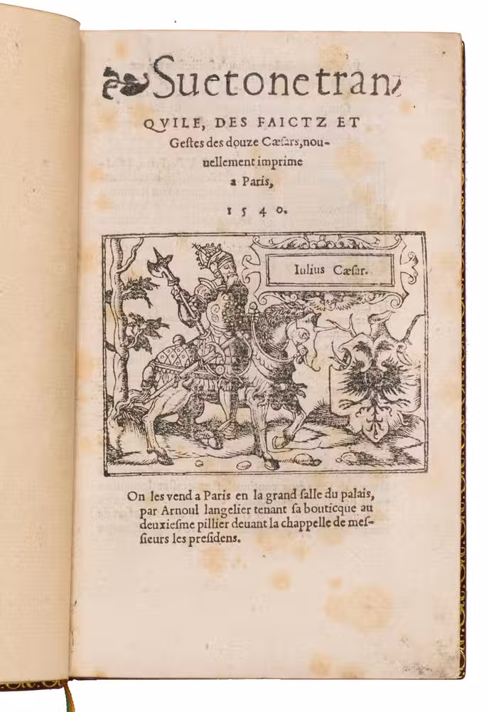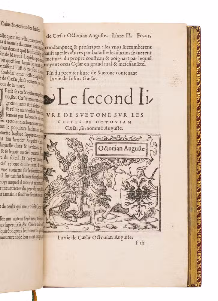 Very rare first Angelier edition of the first translation into French of Suetoniuss main work. This collective biography of the Roman Empire's first leaders includes descriptions of the life of Julius Caesar, Augustus, Tiberius, Caligula, Claudius, Nero, Galba, Otho, Vitellius, Vespasian, Titus, and Domitian, peppered with salient, erotic, and shocking details. The present edition, which is the second overall, follows the first edition of the translation (1520), including the same preface dedicated to Charles de Bourbon, duc de Vendôme, governor of Picardy. A second Angelier edition followed in 1542.