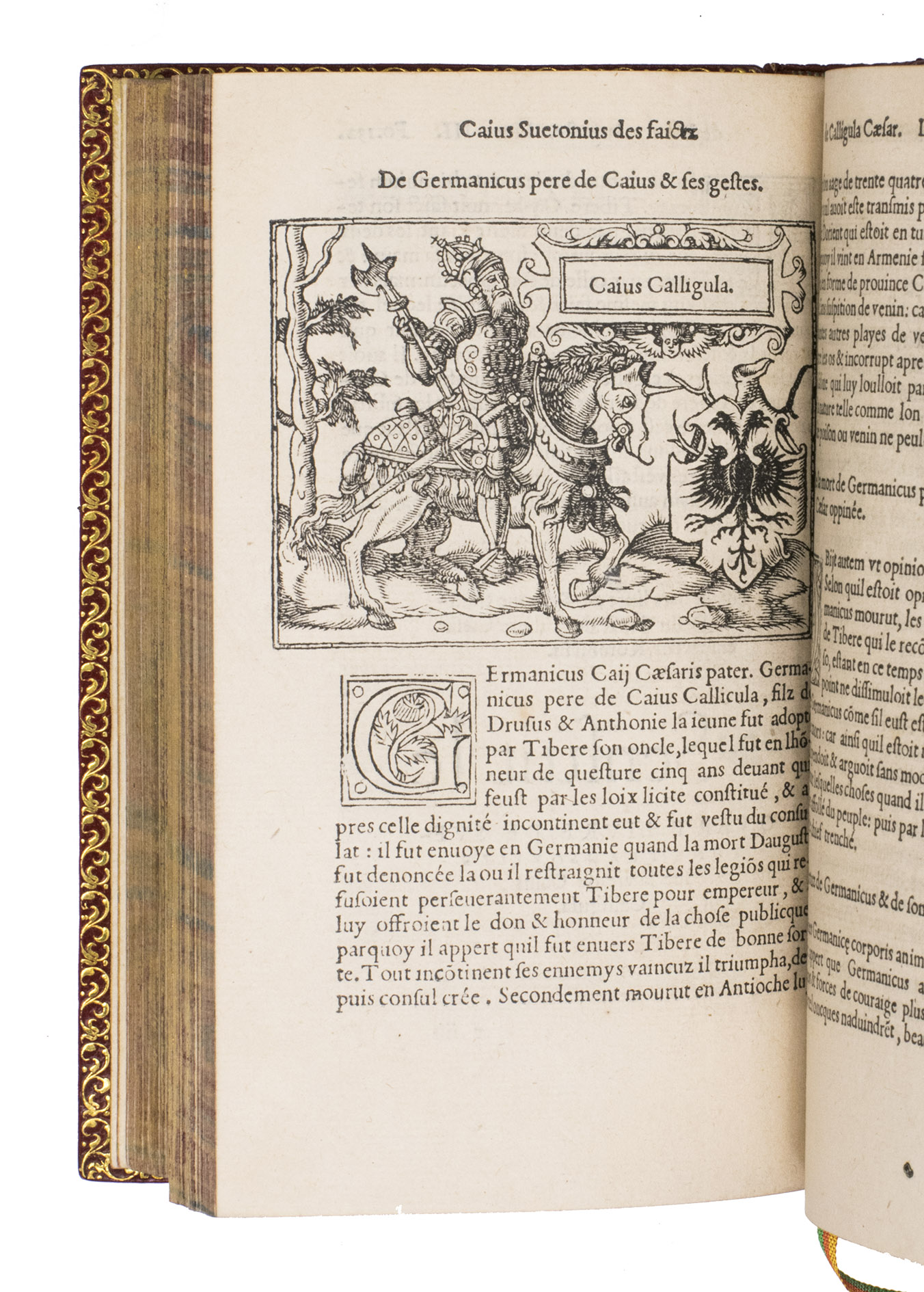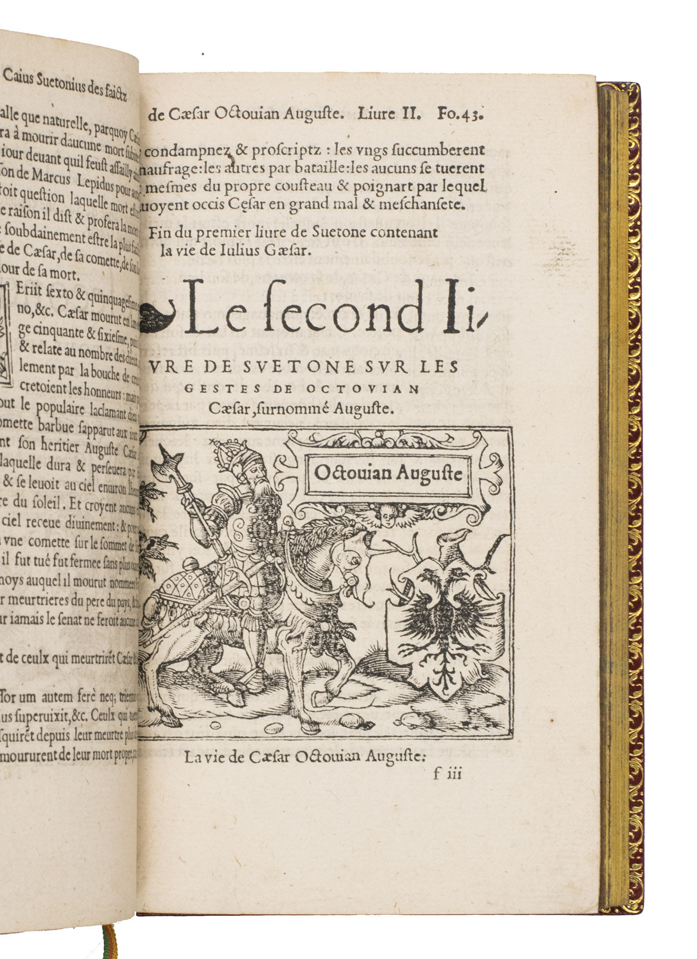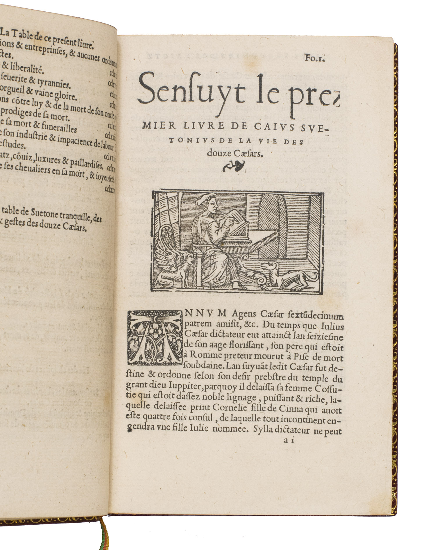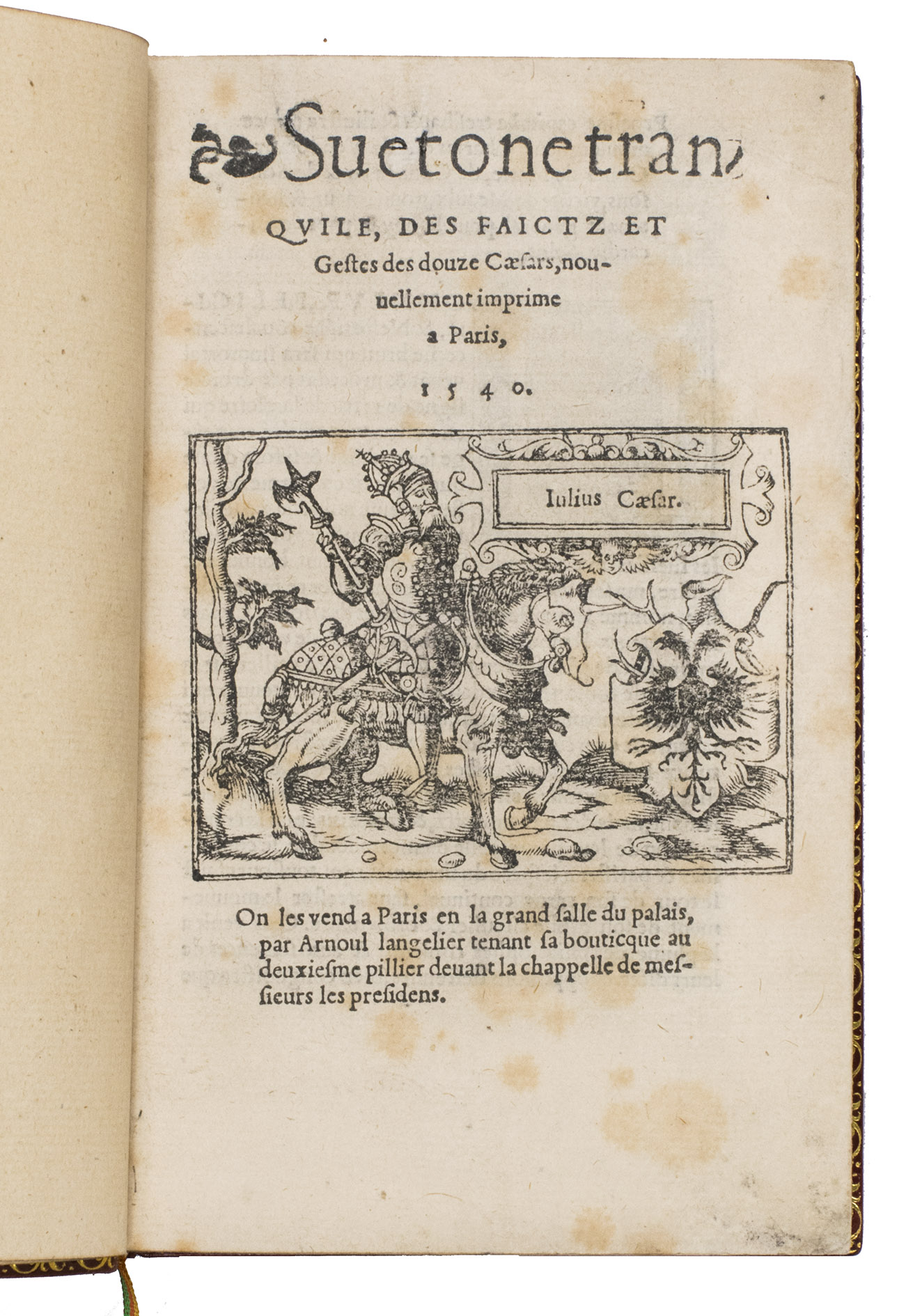 With the gold-stamped signature of René-Victor Chambolle (1834-1898) and Hippolyte Duru (fl. 1843-1863) on the front turn-in. The binding is in excellent condition. The leaves are somewhat browned, the title page is slightly stained, occasional marginal staining. Otherwise in very good condition. Dekesel, S-117; Pettegree and Walsby, French vernacular books, 48585; USTC 37780 (6 copies); cf. Mortimer (Harvard French), no. 505 (1541 ed.); B. Baldwin, Suetonius, biographer of the Caesars (1983); not in Adams.