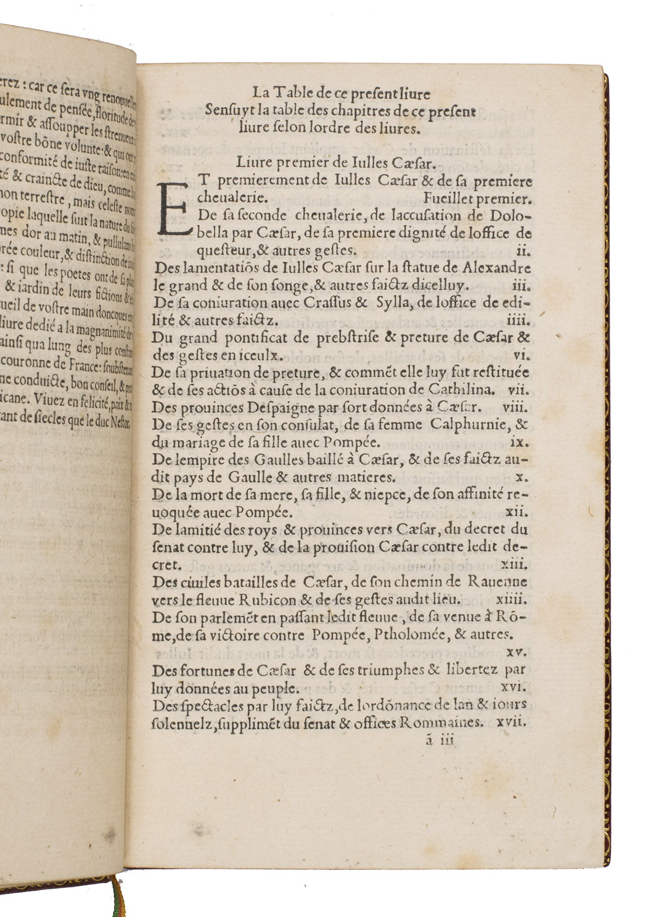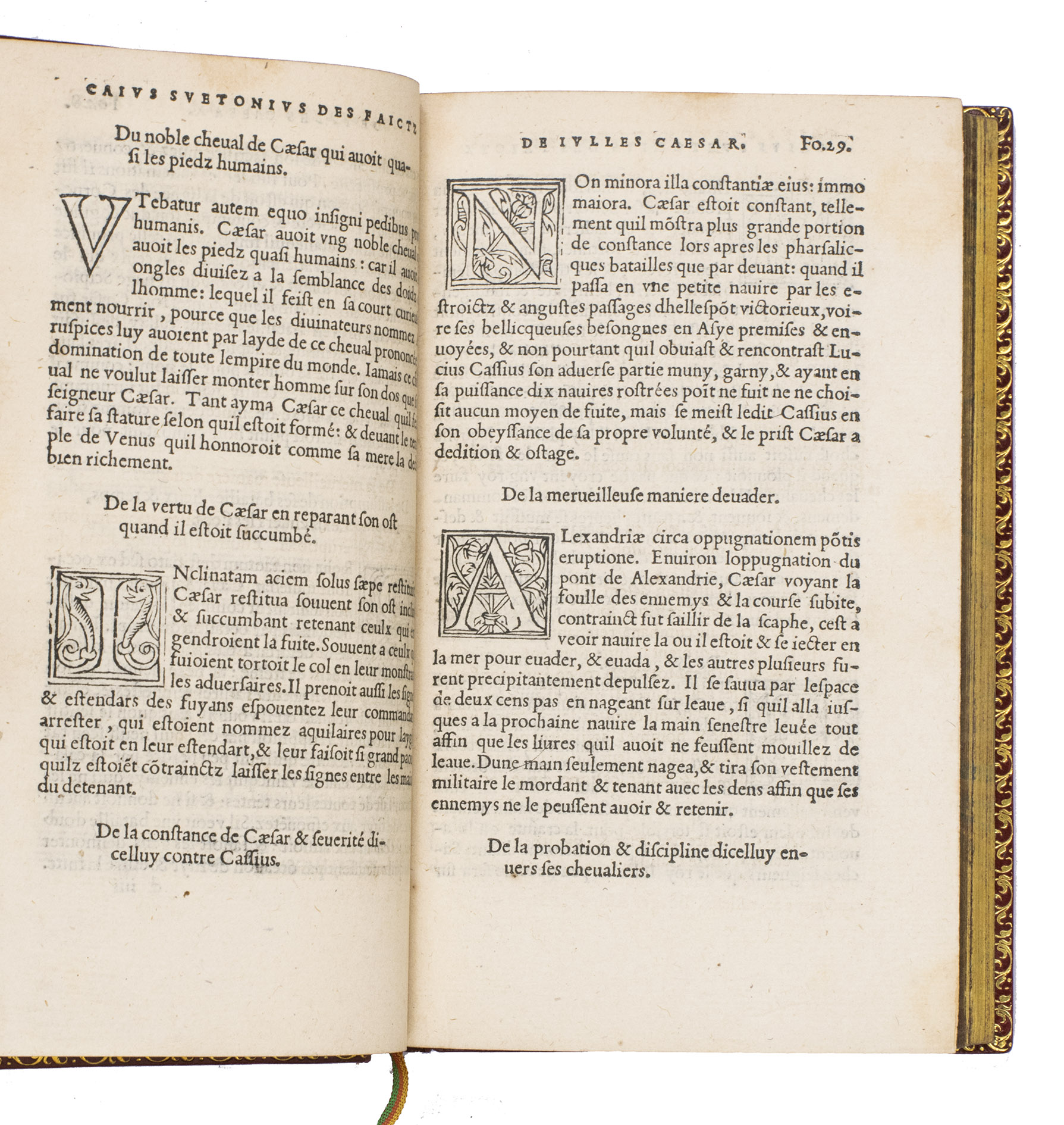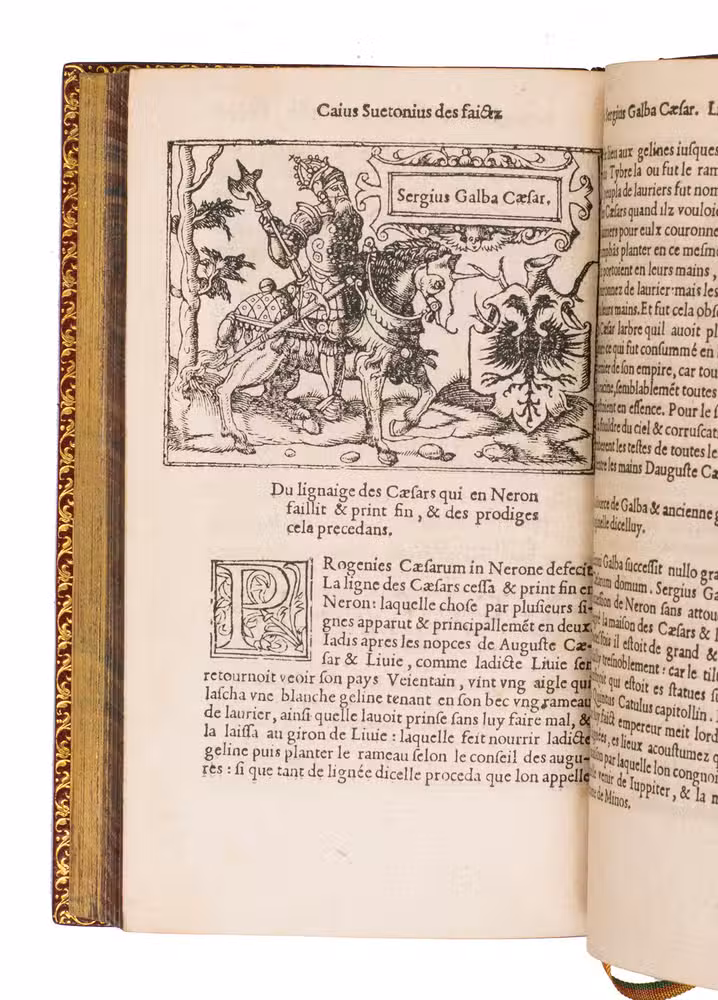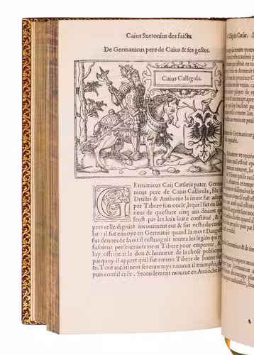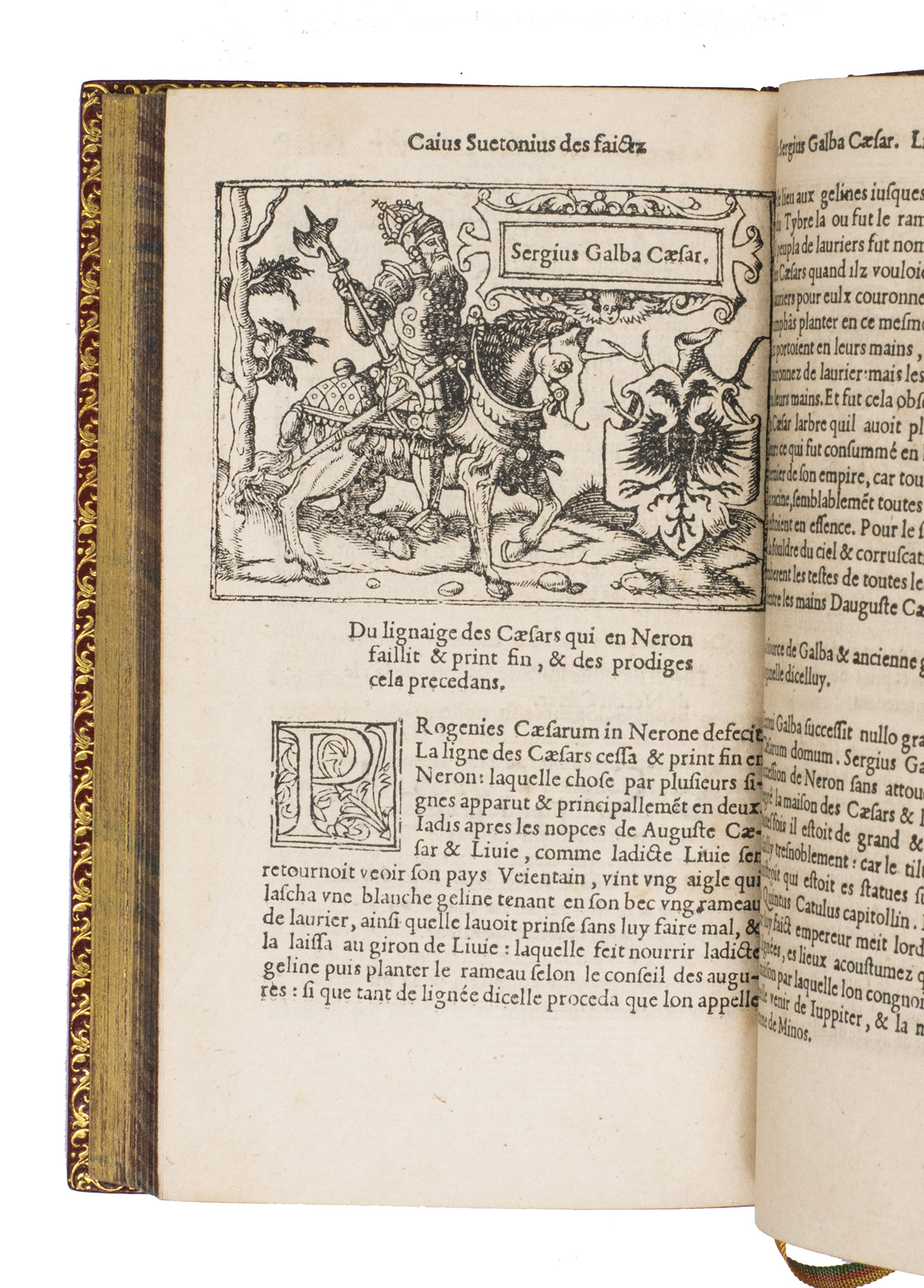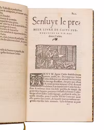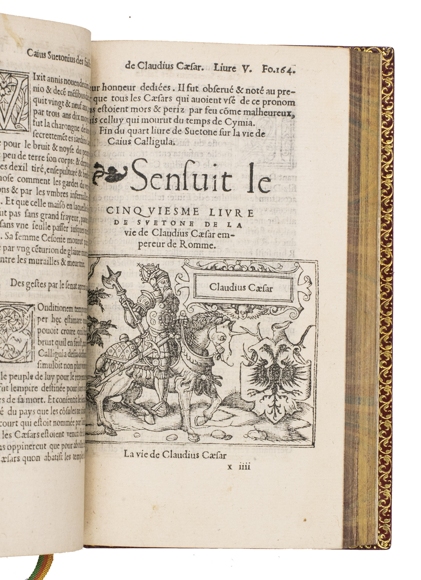 With the gold-stamped signature of René-Victor Chambolle (1834-1898) and Hippolyte Duru (fl. 1843-1863) on the front turn-in. The binding is in excellent condition. The leaves are somewhat browned, the title page is slightly stained, occasional marginal staining. Otherwise in very good condition. Dekesel, S-117; Pettegree and Walsby, French vernacular books, 48585; USTC 37780 (6 copies); cf. Mortimer (Harvard French), no. 505 (1541 ed.); B. Baldwin, Suetonius, biographer of the Caesars (1983); not in Adams.