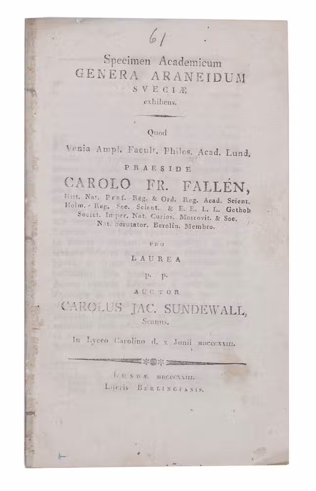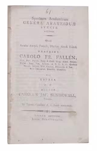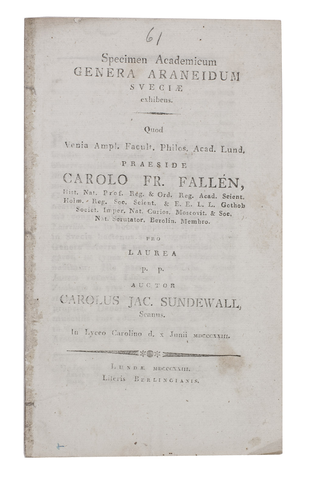 Well known classification of Swedish spiders. Dissertation of Sundevall, with Fallén as praeses.