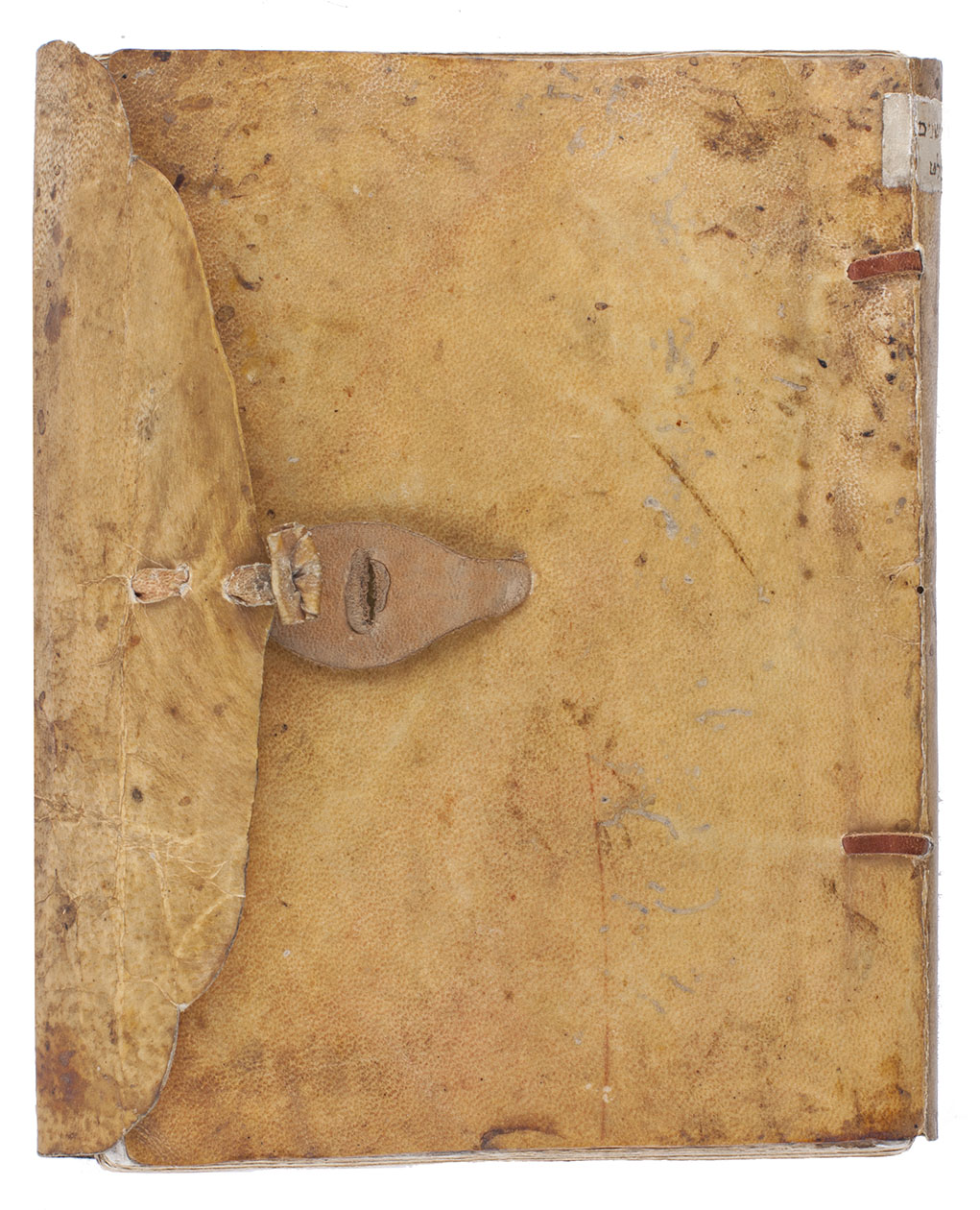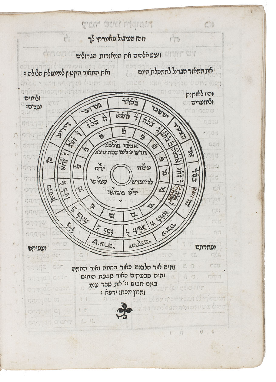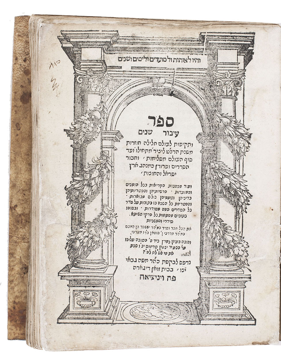 Venice, Giovanni di Gara, [5]339 [= 1578/79]. Small 4to (19.5 x 15 cm). With the title set in an elaborate woodcut architectural arch and 6 round woodcut calendrical or astrological diagrams with text. Set entirely in Hebrew type, the main text in semi-cursive (rabbinical) and the headings in meruba, each of the two styles in at least 3 sizes. Contemporary limp sheepskin wrap-around cover with flap and fastened with strap. 136 ll., including the blank leaf [108].