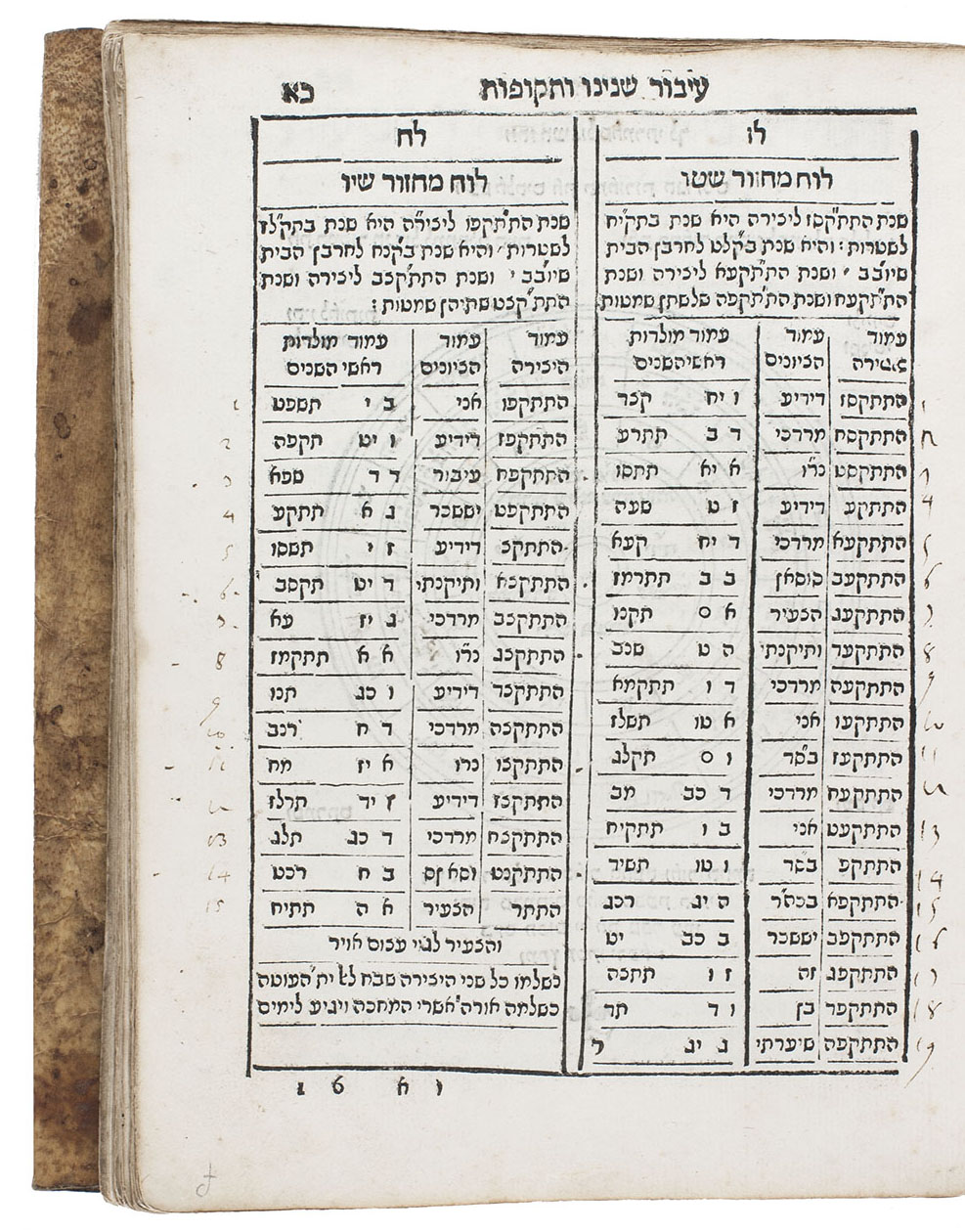 Rare second (first authorised) edition, by far the best, of an extremely important work on Jewish calendrical calculations, also in relation to the liturgy, choice of readings, customs and dates for holidays. In addition to being a seminal work on the calendar and chronology, it records customs and liturgical practices (minhagim) of the ancient Jewish communities of Palestine (including even lore about the weather), whose traditions were already threatened and in many cases were soon to be lost as a result of the influx of Sephardic Jews after their expulsion from Spain in 1492 and Portugal in 1497. It also includes similar information about the communities in northern Africa, as well as astrological and astronomical information.