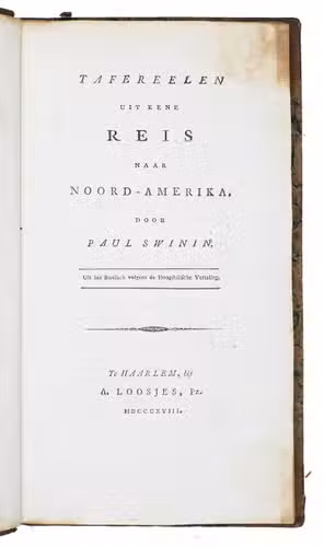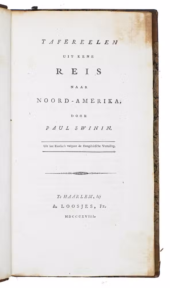 The great Russian author Pavel Petrovic Svinyin or Svin'in, here westernized to "Paul Swinin", is best known for his Sketches of Russia, published in the West under the name "Suinine". The identity of the Dutch translator of the present work is unknown. It gives an interesting "picturesque" travel account of the United States spanning the year 1813 and provides five main accounts covering different subjects: a statistical survey; a religious overview with descriptions of the several Christian communities (naming Methodists, Quakers, Shakers, Baptists and more); a description of the different types of steamboats used in North America; a biography of the French general Jean Victor Moreau, who lived in exile in the United States from 1805 to 1812; and a description of the dancing rituals of indigenous American "Indians", naming the Osage, Arkansas, Sioux and Saki tribes, which the Russian author interestingly compares with tribes in the Caucasus.