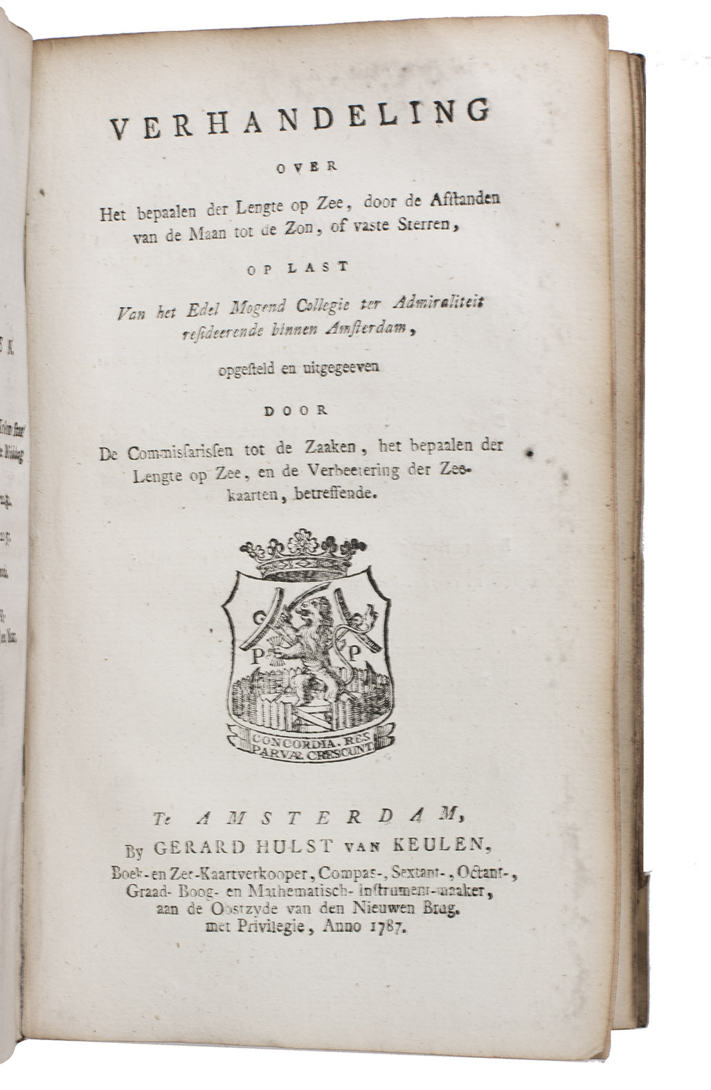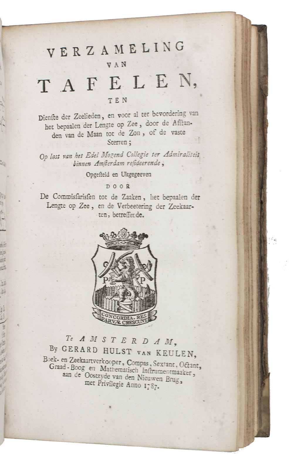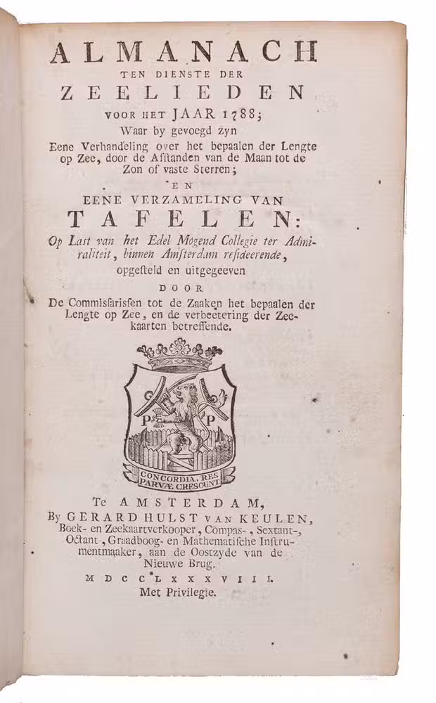 First edition of an almanac for the use of seamen, in three parts, published by order of the board of the Amsterdam Admiralty by the Committee for the establishment of longitude at sea and the improvement of nautical charts, in which committee Van Swinden played a leading role. The almanac is based on the English Nautical almanac and includes everything that can be of use to seamen, including a separate part on the calculation of longitude at sea and a part with letterpress tables necessary for the calculations. Although John Harrison had already demonstrated the accuracy of his chronometer in the 1760s they were still not in widespread use and the present works calculate longitude from very precise measurements of the position of the moon.