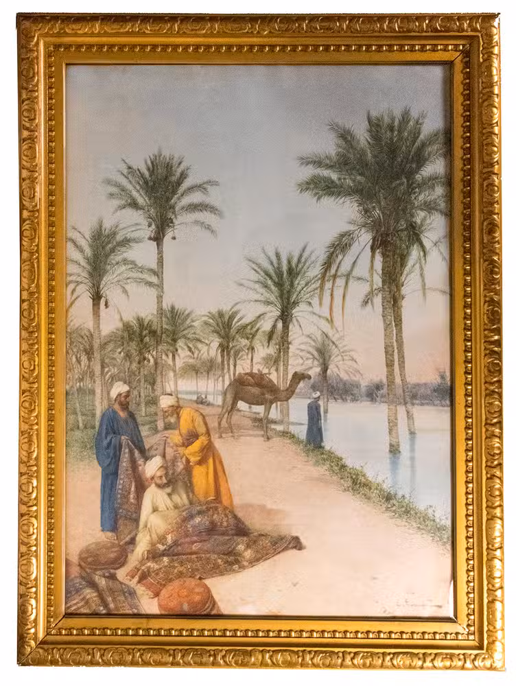 Attractive watercolour painting by the Italian orientalist painter Enrico Tarenghi (1848-1938), it shows three bearded men with carpets and two poufs. One of them is clearly the seller, another is inspecting the wares and the third is sitting on the ground rolling up one of the carpets. In the background a wide river (generally assumed to be the Nile), a dromedary and dozens of palm trees.
