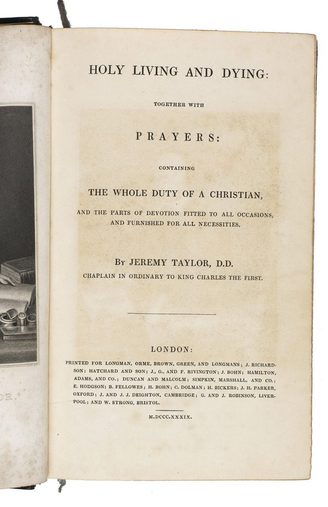 Rare edition of one of the most famous English prose works of the 17th century, in a beautifully contemporary gold-tooled binding with gauffered edges. The work is a compilation of two titles on virtuous living and dying, and is a great example of Anglican spirituality. The present edition is quite scarce, as we have not been able to find it in any sales records.