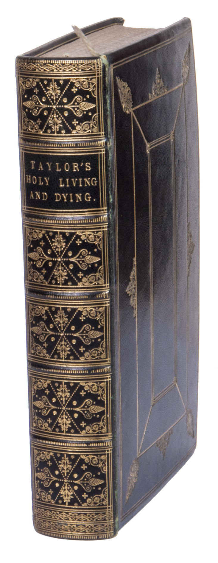 The work combines The rule and exercises of holy living (1650) and The rule and exercises of holy dying (1651) by Jeremy Taylor (1613-1667), an Anglican bishop. However, he was also an author who was revered for his poetic style of writing, and is considered one of the masters of 17th-century English literature. He wrote mostly religious or devotional texts, and his works on holy living and dying are his most well-known. They were incredibly popular, with a new edition being printed every few years after they were first published. The present copy is a later edition, but it must have been a treasured book. It has been beautifully bound by Wheeler, an otherwise unknown bookbinder who was likely British, and kept in the library of a member of the Everingham family.