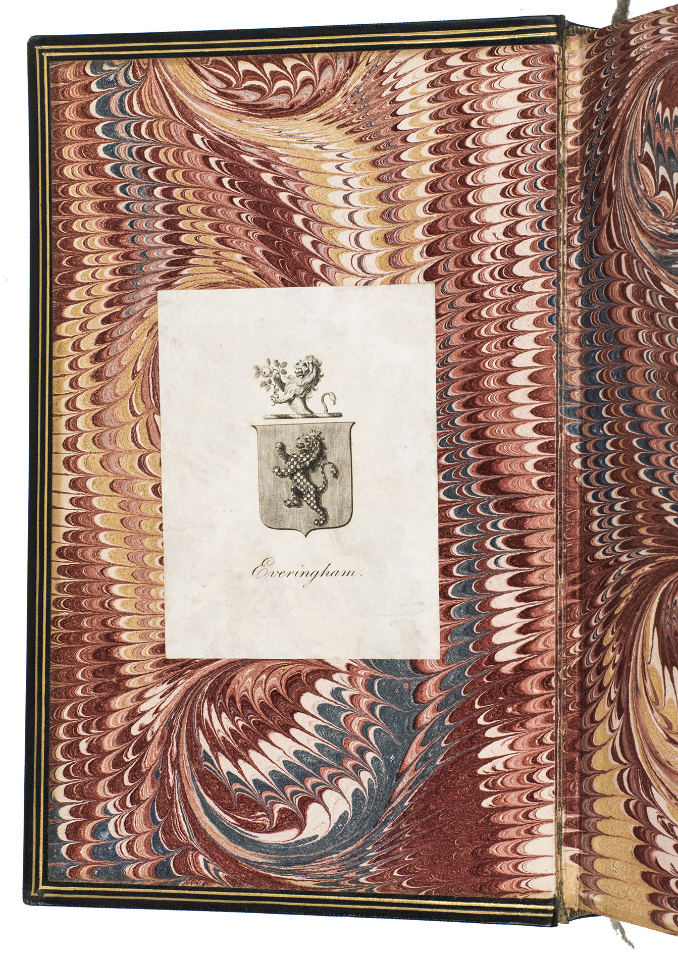 With the bookplate of the Everingham family mounted on the front pastedown, and a bookbinder's stamp ("Bound by Wheeler") on the verso of the first free flyleaf. The edges of the boards are slightly scuffed, with a few scratches on the back board, the hinges are slightly weakened, but the structural integrity of the binding is still intact. The plate is slightly foxed, the title page is somewhat browned, the reading ribbon has broken, but otherwise internally very clean. Overall in good condition. WorldCat 5339039.