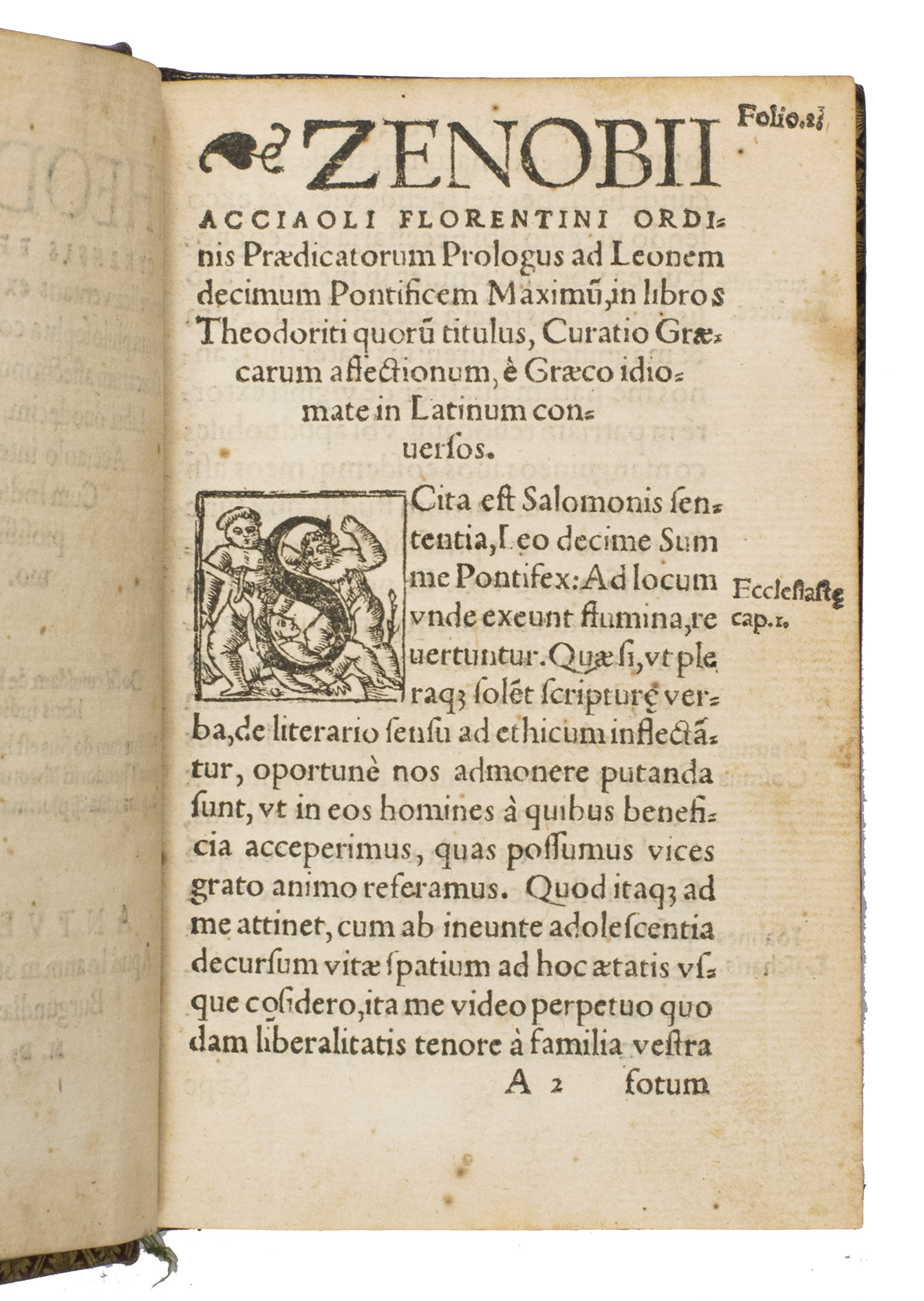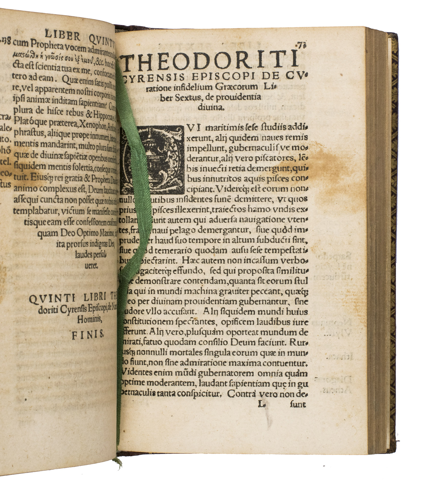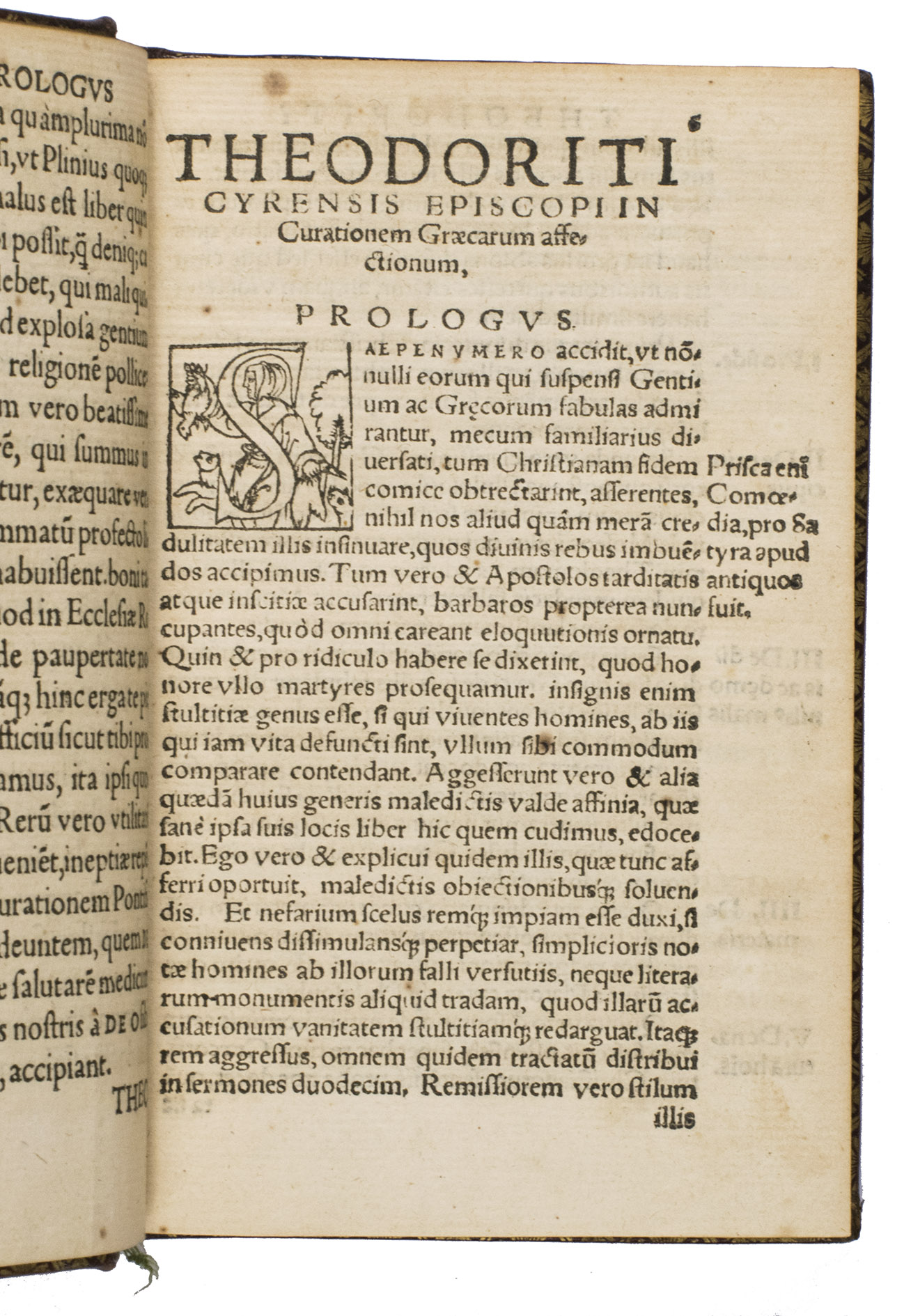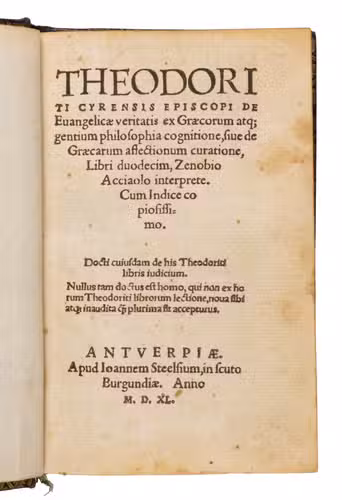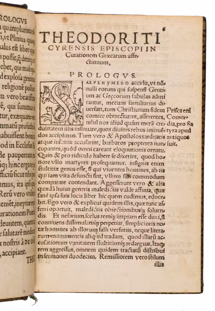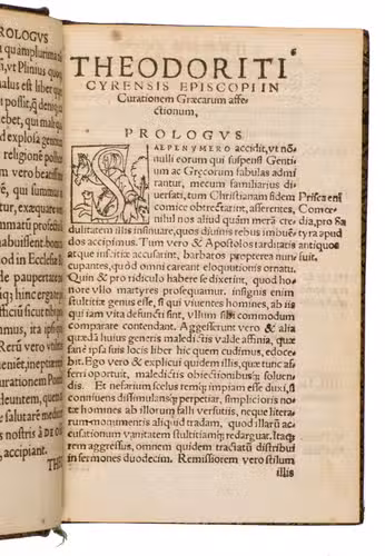 Second edition of the first Latin translation (1519) of Graecarum affectionum curatio, Theodorets (393-457) celebrated apologetic work composed against the last defenders of Hellenism. Intended as a vigorous piece of Christian propaganda, the treatise seeks to demonstrate the truth of the Gospel from within the philosophical tradition of the Greeks and other ancient peoples. Remarkably, the original Greek text did not appear in print until 1592, making Zenobio Acciaiuolis (1415-1478) Latin version the principal vehicle through which Western scholars encountered the work for much of the 16th century.