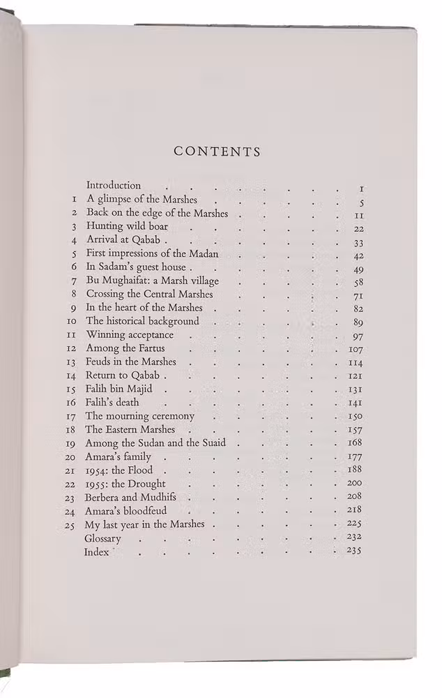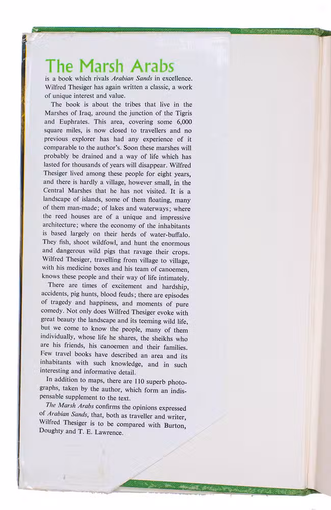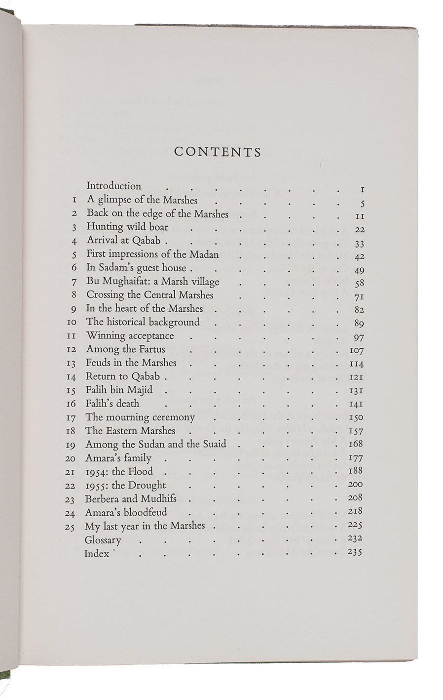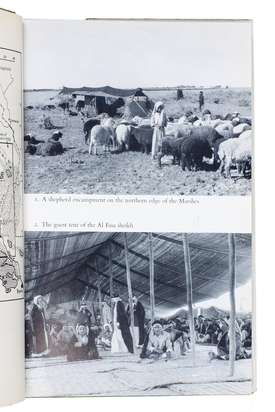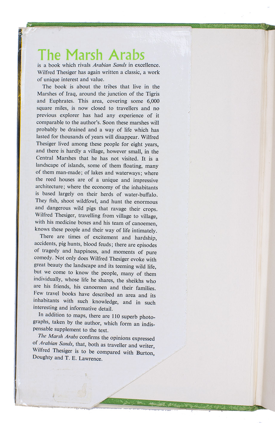 First edition, second impression, of an account of the Arabs living in the marshes of southern Iraq, written by Wilfred Thesiger (1910-2003), who stayed with them from 1951 to 1958. "From my recollections, helped by my diaries, I have tried to give a picture of the marshes and of the people who live there. Recent political upheavals in Iraq have closed this area to visitors. Soon the marshes will probably be drained; when this happens, a way of life that has lasted for thousands of years will disappear" (introduction). In 25 chapters Thesiger describes his experience in the marshes. They are illustrated with over a 100 photographs showing the people, their homes, boats, horses and kettle, and some common activities like fishing, preparing food and making homes and buildings out of water reed. Thesiger also wrote Arabian sands, published in 1959.