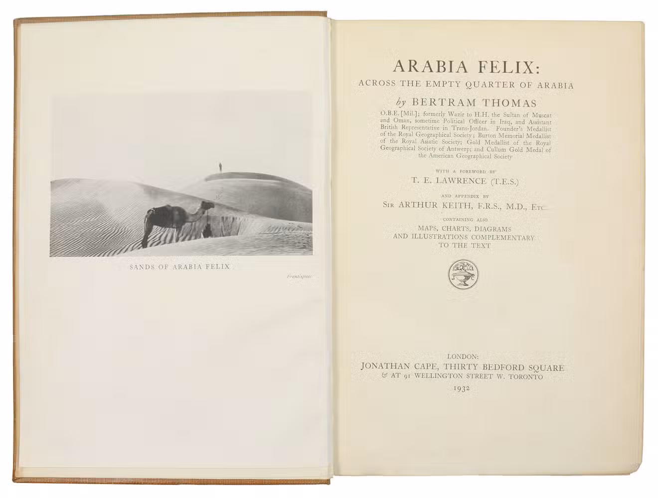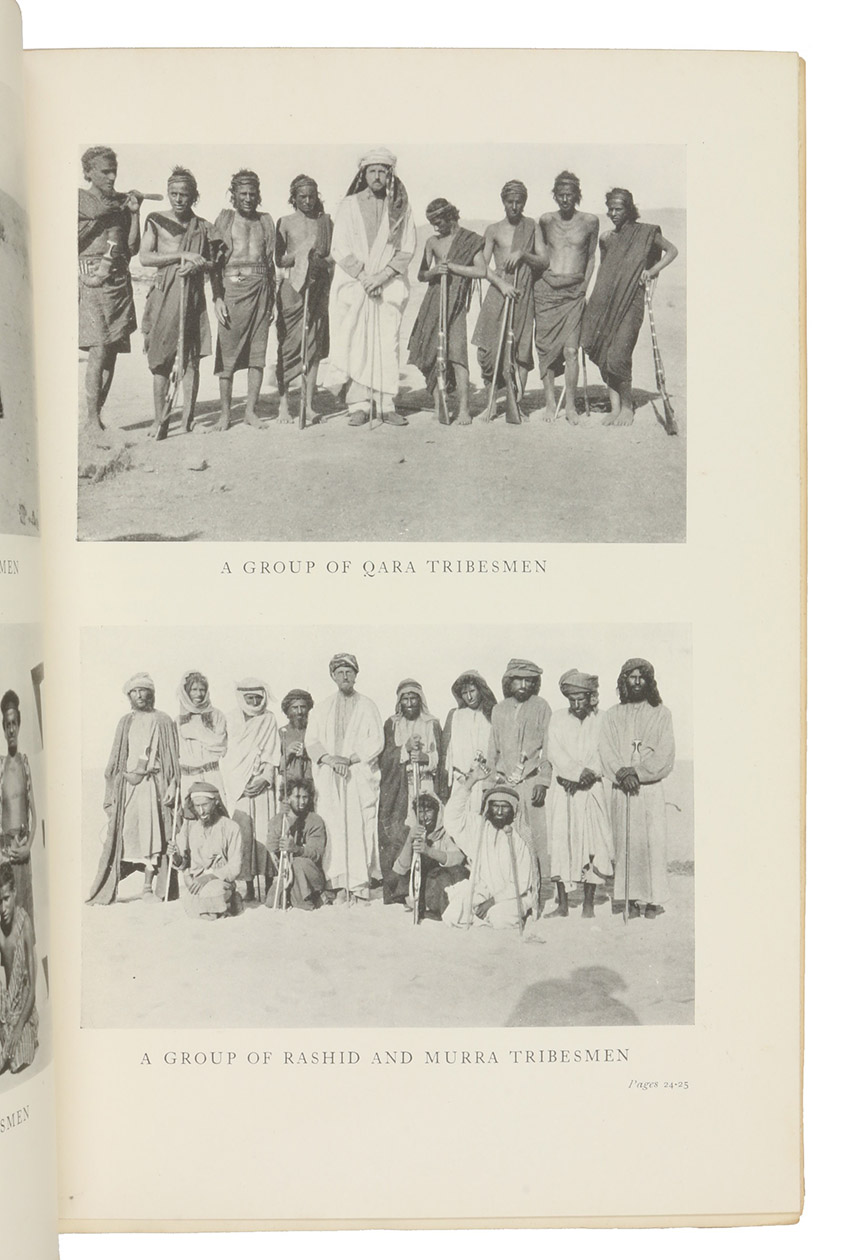 First edition, published simultaneously with the New York one. The preface was contributed by T. E. Lawrence. Among the many photographic illustrations is one of the earliest portraits of the Qatar royal family (facing p. 298). "In this book, Bertram Thomas relates some aspects of his journey in which he crossed the Rub' al Khali (Empty Quarter) from Oman to Qatar, and provides geographical information about the peninsula of Qatar, especially the southern part. He also recorded his observations of the region stretching from the Gulf of Salwa to Al-Rayyan, where he met Sheikh Abdullah bin Jassim al Thani, Emir of Qatar at the time (1930). The book includes photographs he took of Sheikh Abdullah, Mohamed bin Abdul-Latif bin Mani', and his brother Saleh bin Abdul-Latif bin Mani'. He gives some concise information about Al-Nuaija, Doha towers, and the castle" (Fikri).