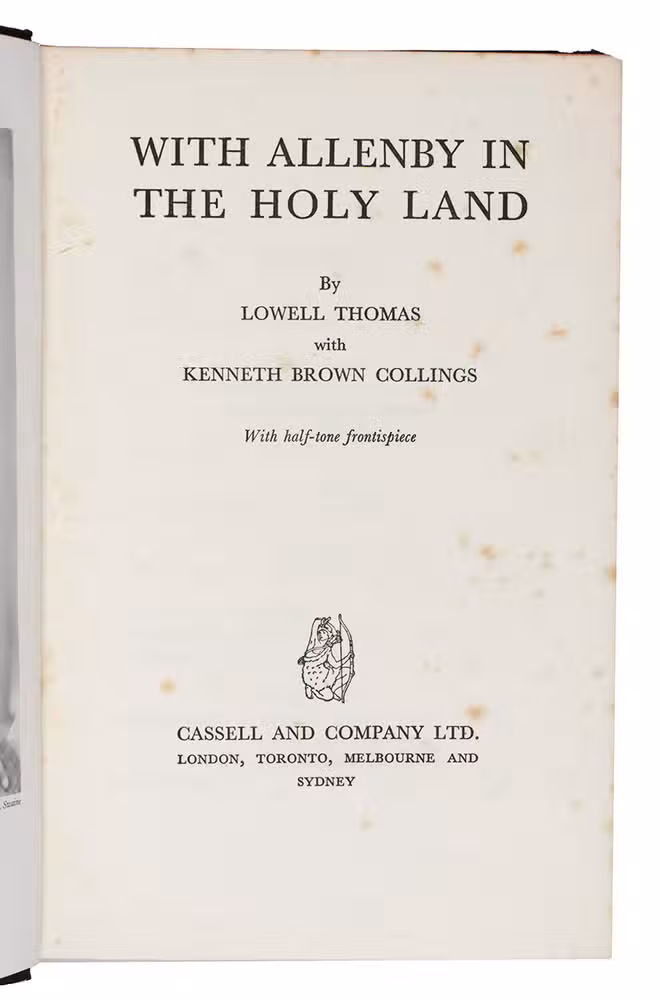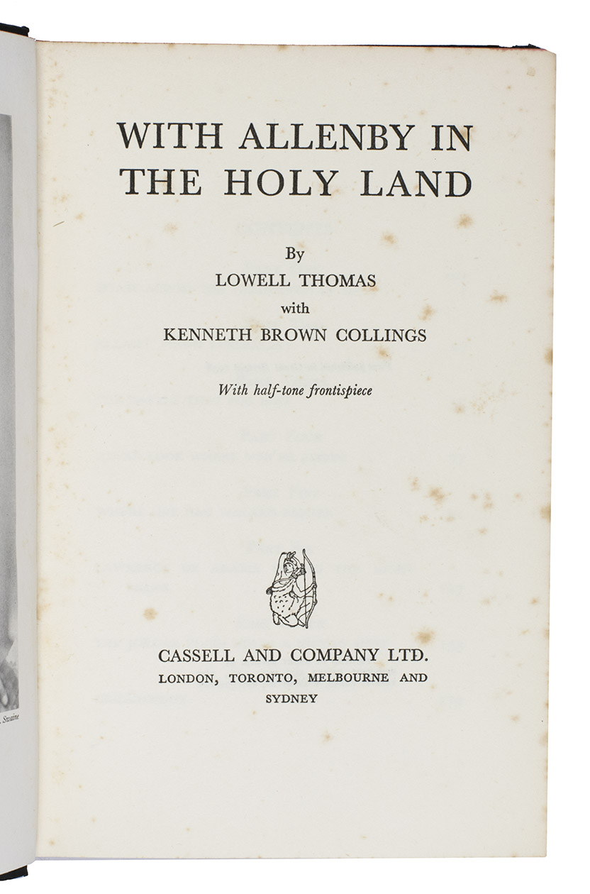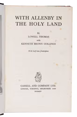 First edition of a biography of General Sir Edmund Allenby (later, Field Marshal and Viscount, 1861-1936). The work treats his Arabian period as commander of the cavalry division in Palestine during the First World War. Allenby made his name in Palestine. He rebuilt the Egyptian Expeditionary Force, established up-to-date Western Front standards of operations, and restored the force's confidence and morale. Allenby's forces defeated the Turks at the final Battle of Megiddo (September-October 1918) to occupy Transjordan, Syria, and Lebanon. Afterwards, he became high commissioner in Egypt. The present biography is largely based on accounts of figures connected to Allenby, such as T.E. Lawrence "of Arabia". Lowell Jackson Thomas (1892-1981) was an American writer, actor, broadcaster, and traveller.