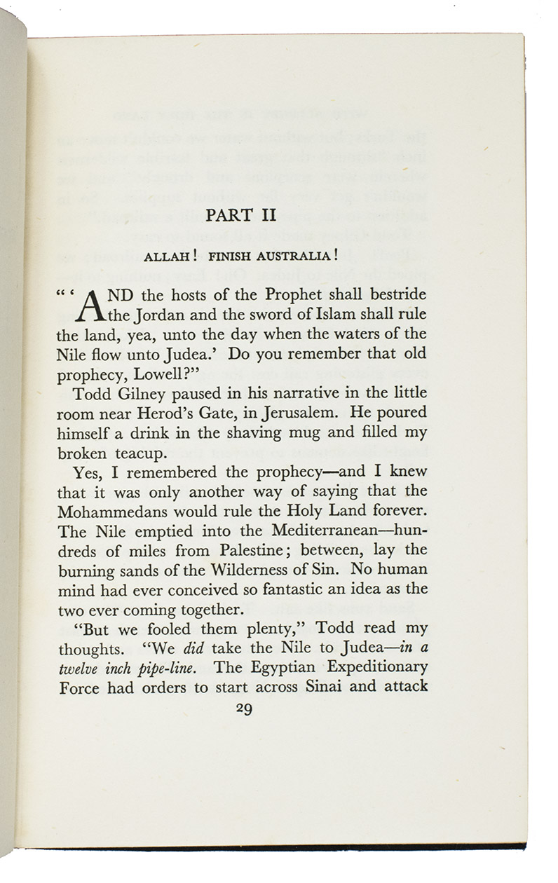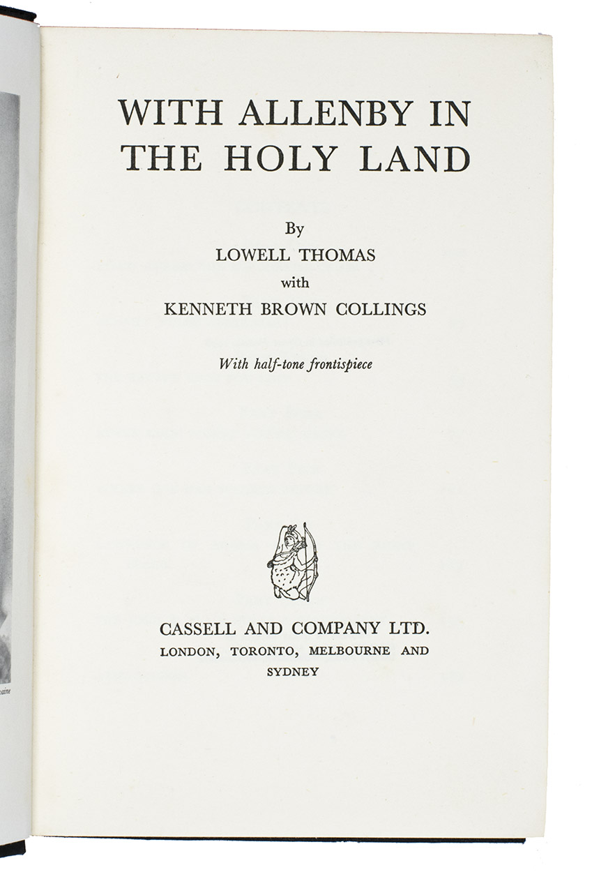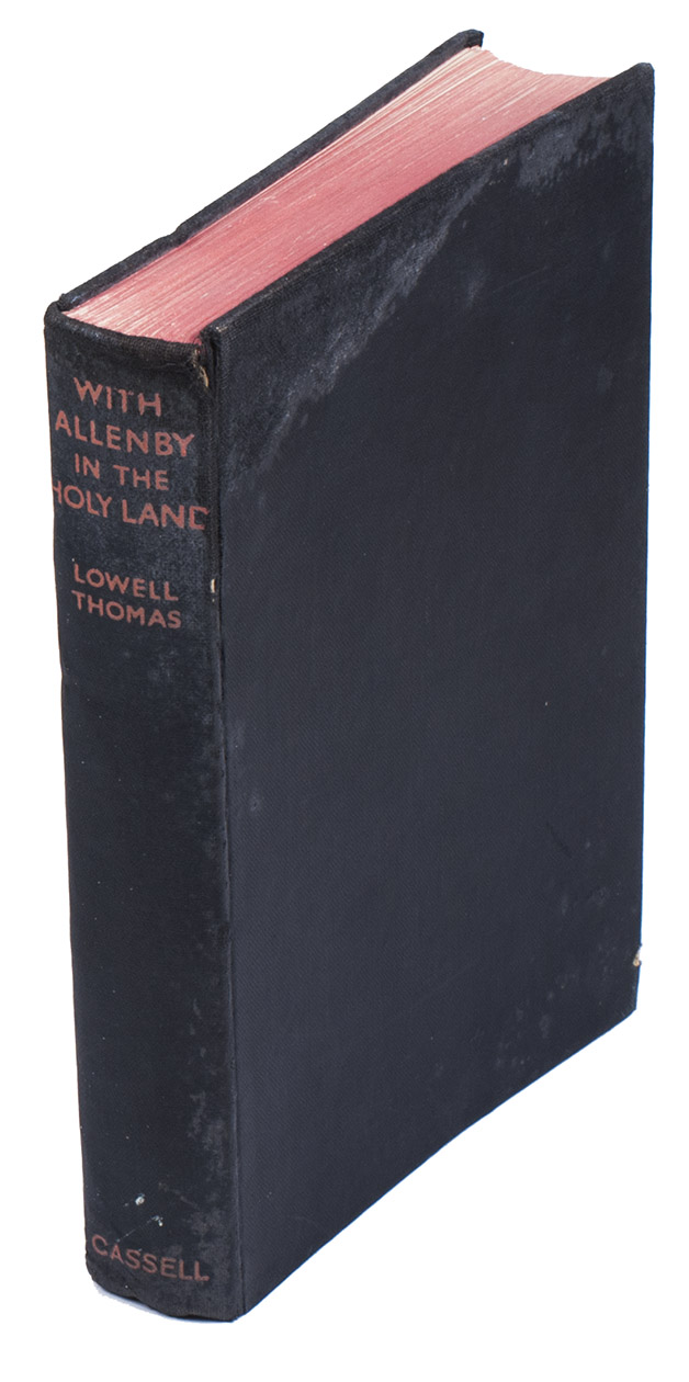 First edition of a biography of General Sir Edmund Allenby (later, Field Marshal and Viscount, 1861-1936). The work treats his Arabian period as commander of the cavalry division in Palestine during the First World War. Allenby made his name in Palestine. He rebuilt the Egyptian Expeditionary Force, established up-to-date Western Front standards of operations, and restored the force's confidence and morale. Allenby's forces defeated the Turks at the final Battle of Megiddo (September-October 1918) to occupy Transjordan, Syria, and Lebanon. Afterwards, he became high commissioner in Egypt. The present biography is largely based on accounts of figures connected to Allenby, such as T.E. Lawrence "of Arabia". Lowell Jackson Thomas (1892-1981) was an American writer, actor, broadcaster, and traveller.