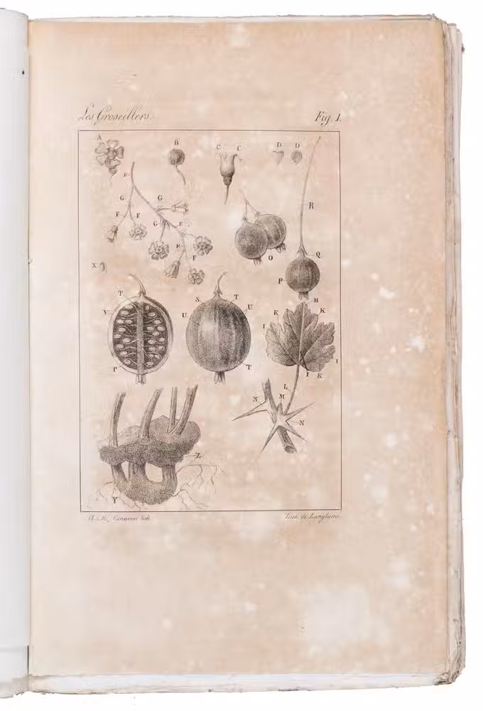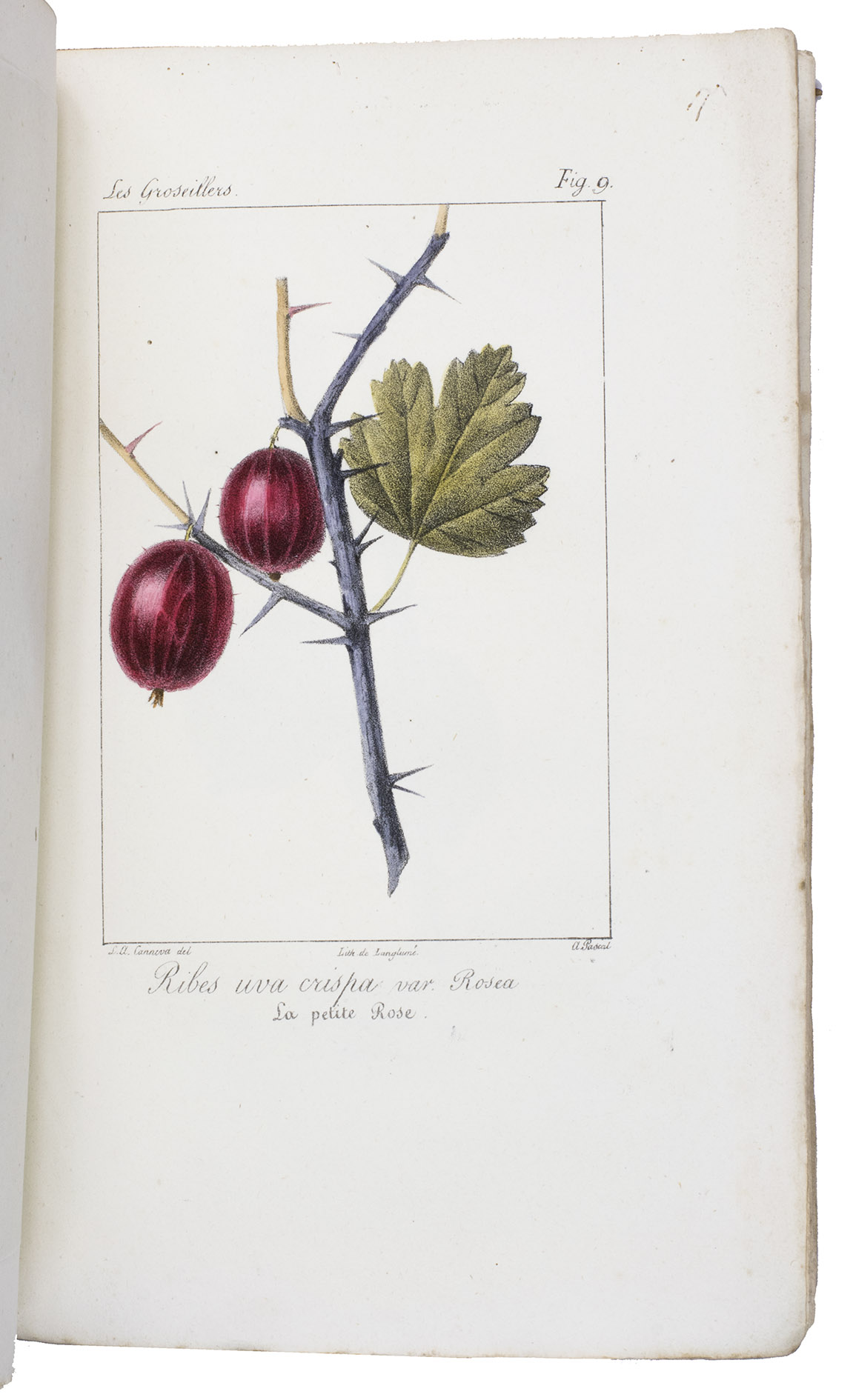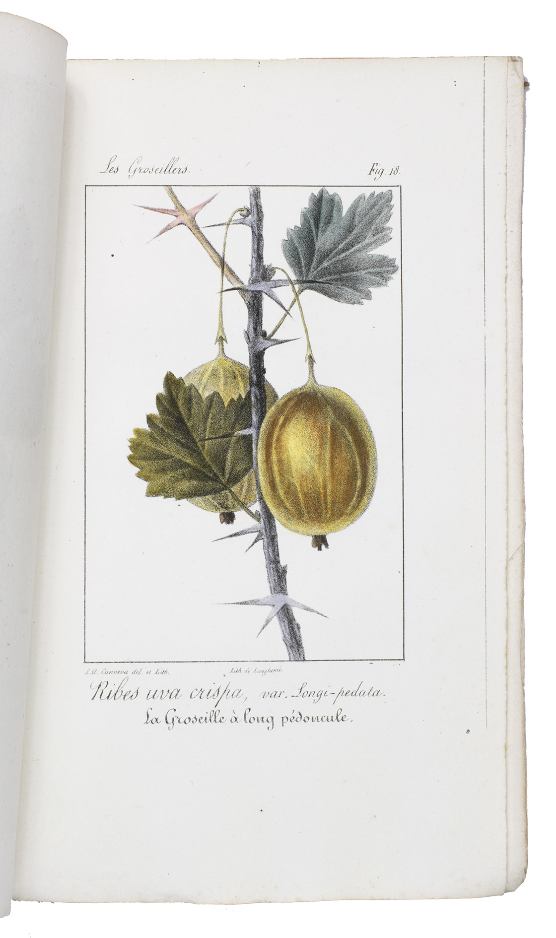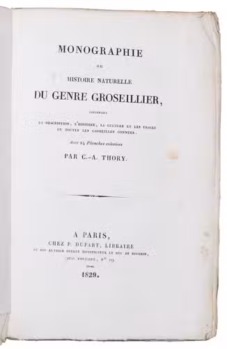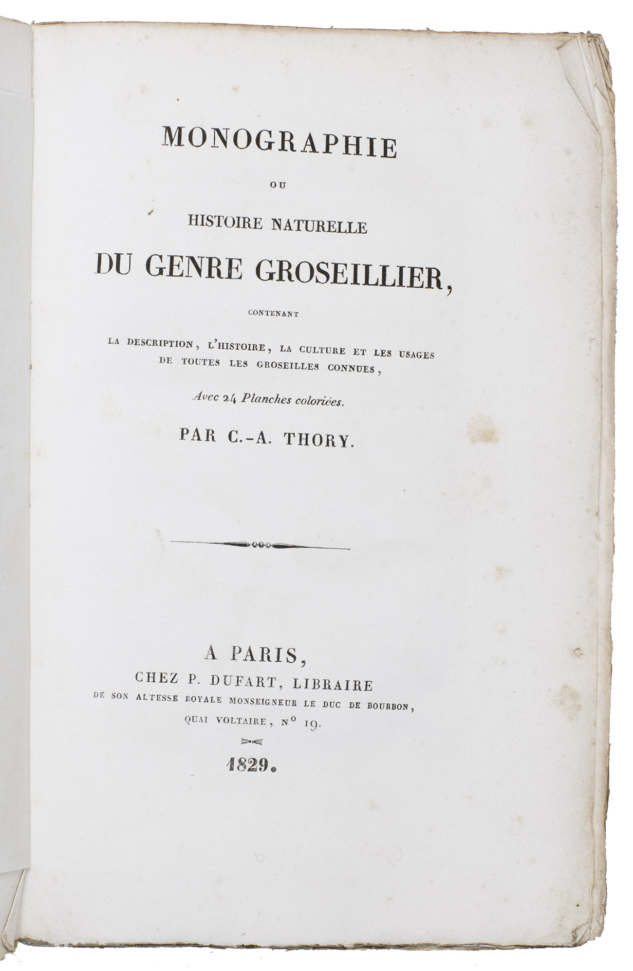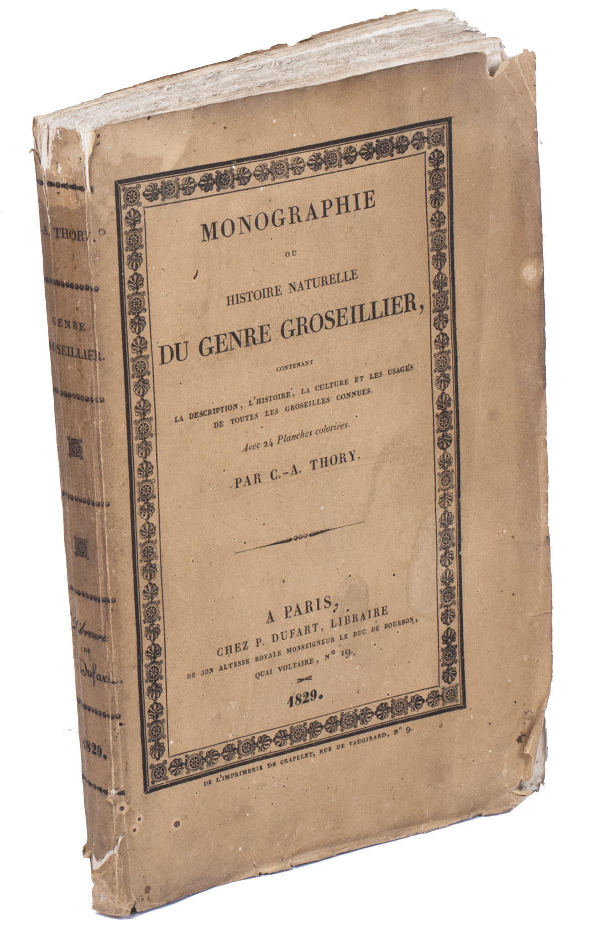 Rare first edition of a specialist work on currants and gooseberries by Claude Antoine Thory (1759-1827). With a description of the characteristics of various species and their growing, together with recipes on ice cream, jams, syrups, wines, conserves etc. Thory was a French writer, naturalist, and collector of roses, who mainly is known for having written the descriptive text for Pierre-Joseph Redouté's excellent illustrations of roses (Les Roses, décrites et classées selon leur ordre naturel).