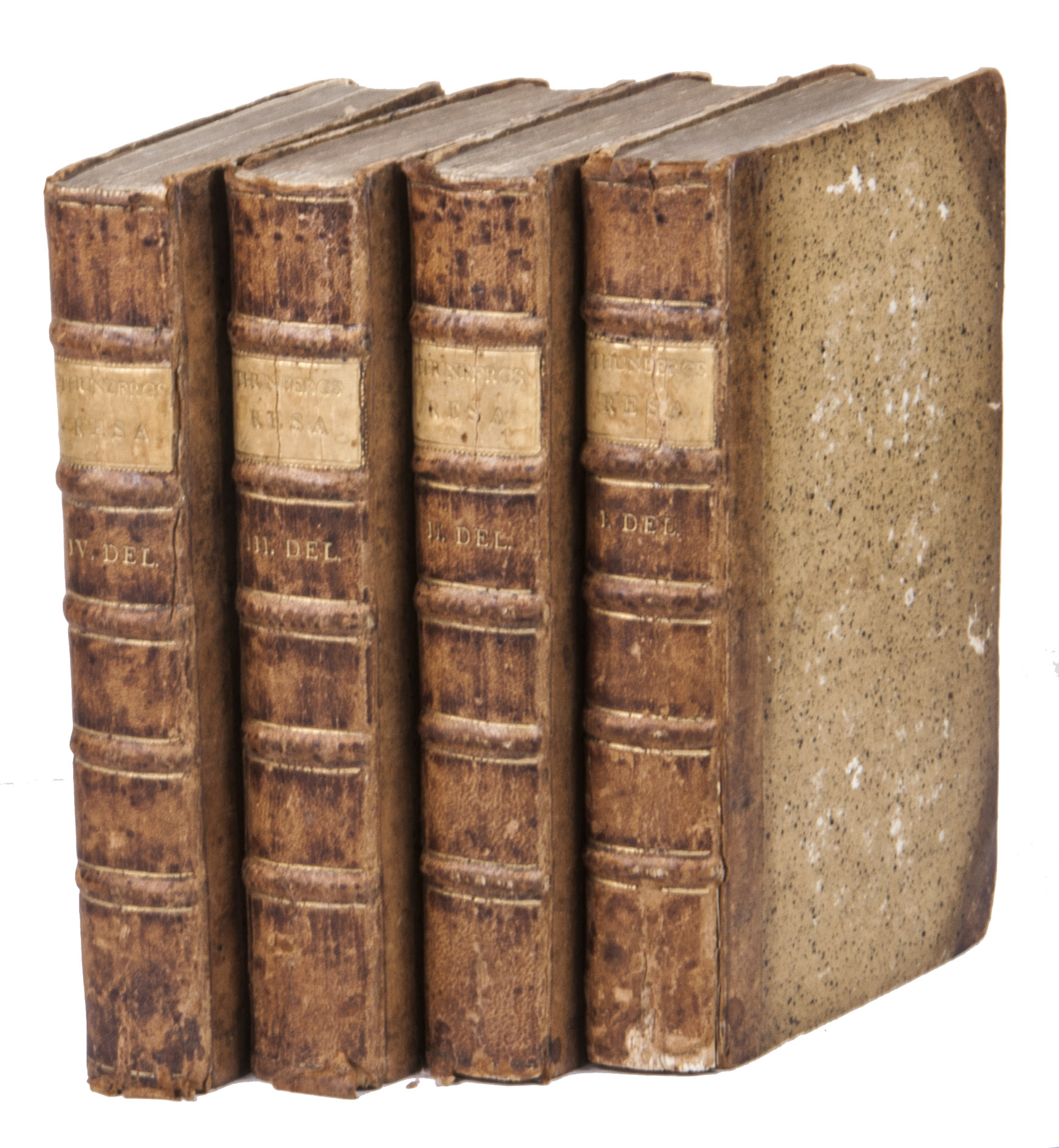 Uppsala, tryckt hos directeur. Joh. Edman, 1788-1793. 4 volumes. 8vo. With 11 engraved plates (1 folding, 9 full page, and 1 in the text). Contemporary or slightly later gold-tooled quarter brown calf, with a beige morocco title label on the spine, lettered in gold, a volume number lettered in gold underneath, sprinkled paper sides, blue sprinkled edges. [26], 389, [1]; [32], 384; [14], "414" [= 402]; [36], "341" [= 339], [1 blank] pp.