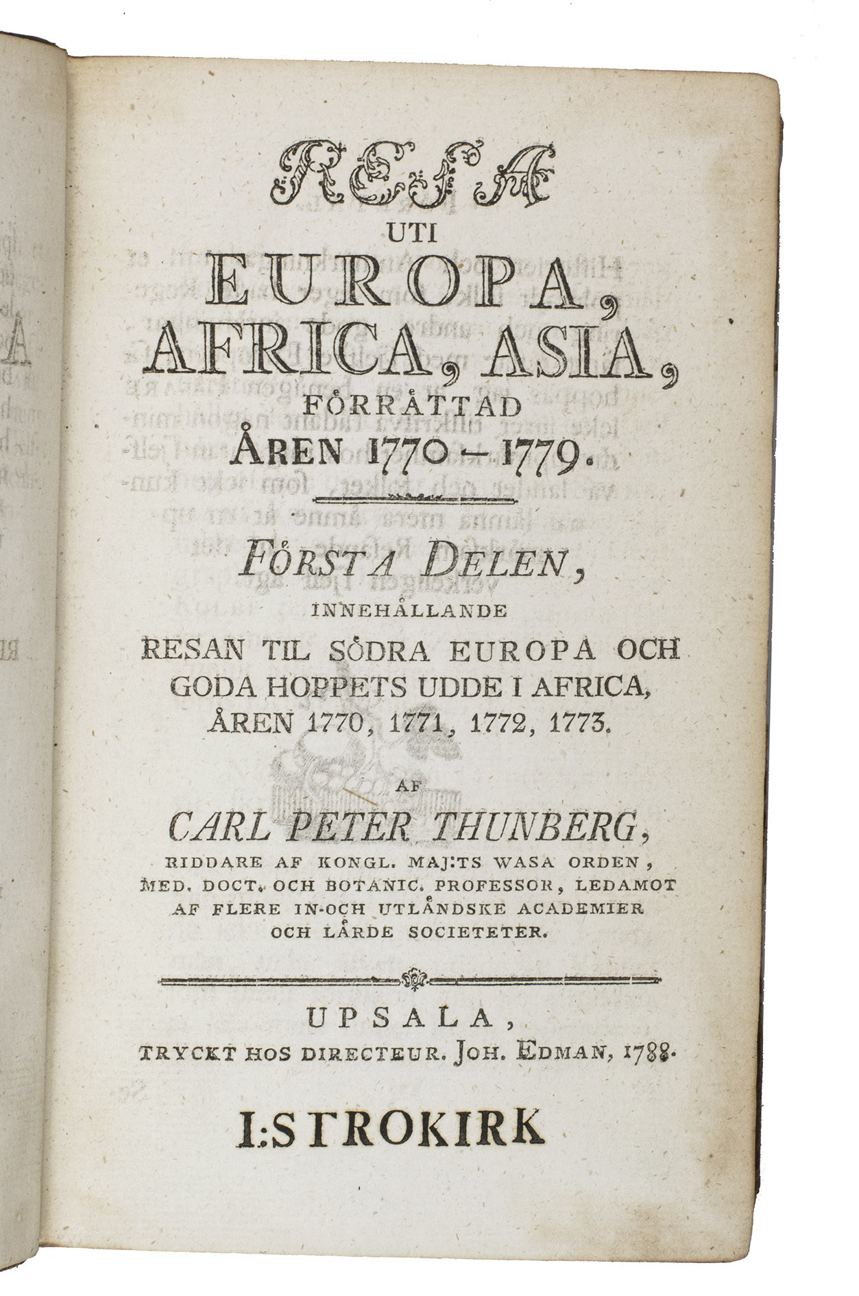 First edition of a famous voyage to South Africa, Indonesia, Japan, and Ceylon in the years 1770 to 1779, to collect botanical specimen. The work documents the author's botanical and zoological discoveries, of which many were new to science, and also contains "material of great ethnographical interest" (DSB).
