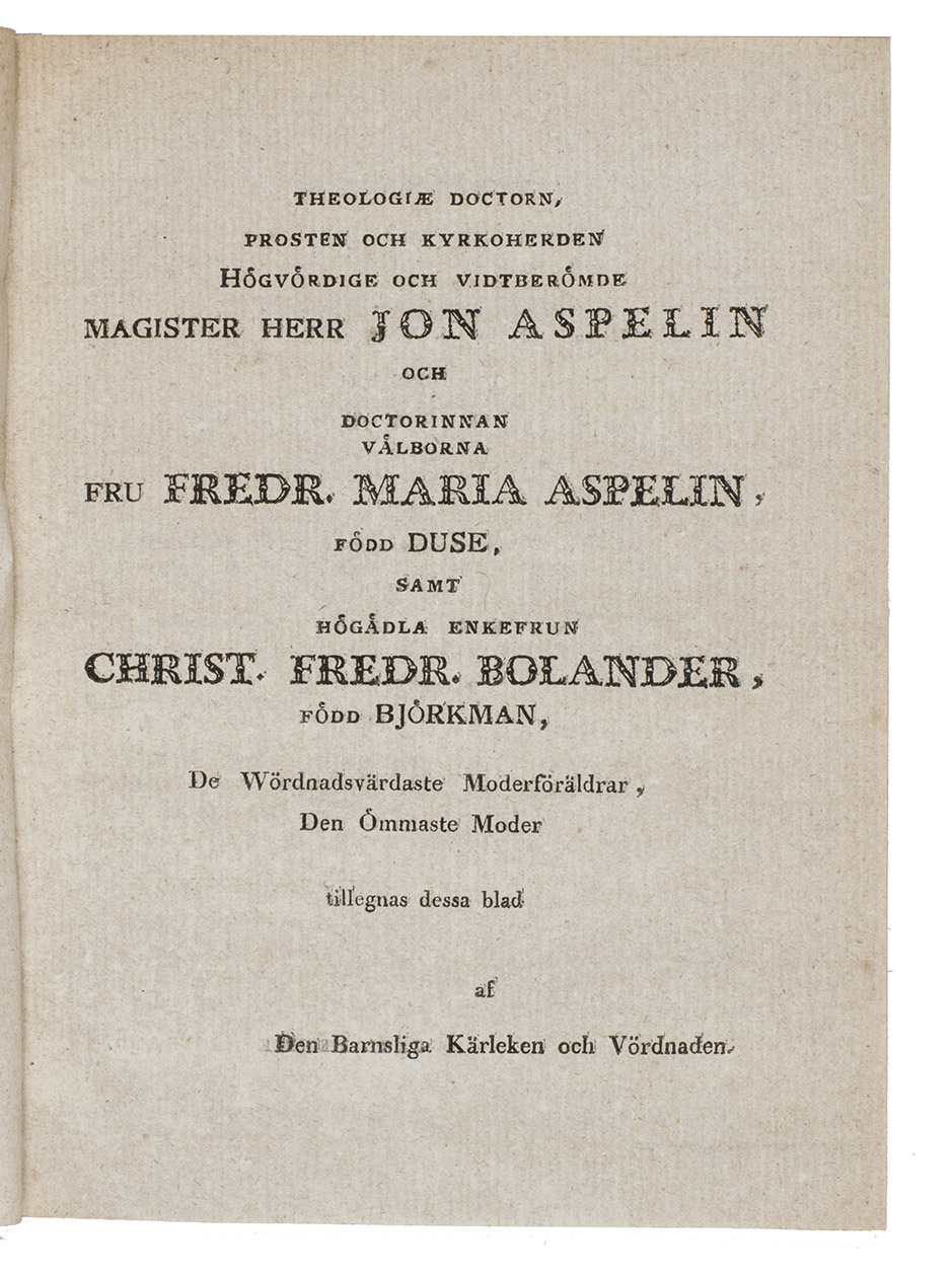Uppsala, Palmblad et C. 1823. Small 4to. With a thin marbled paper strip to reinforce the spine. [4], 9, [1] pp.