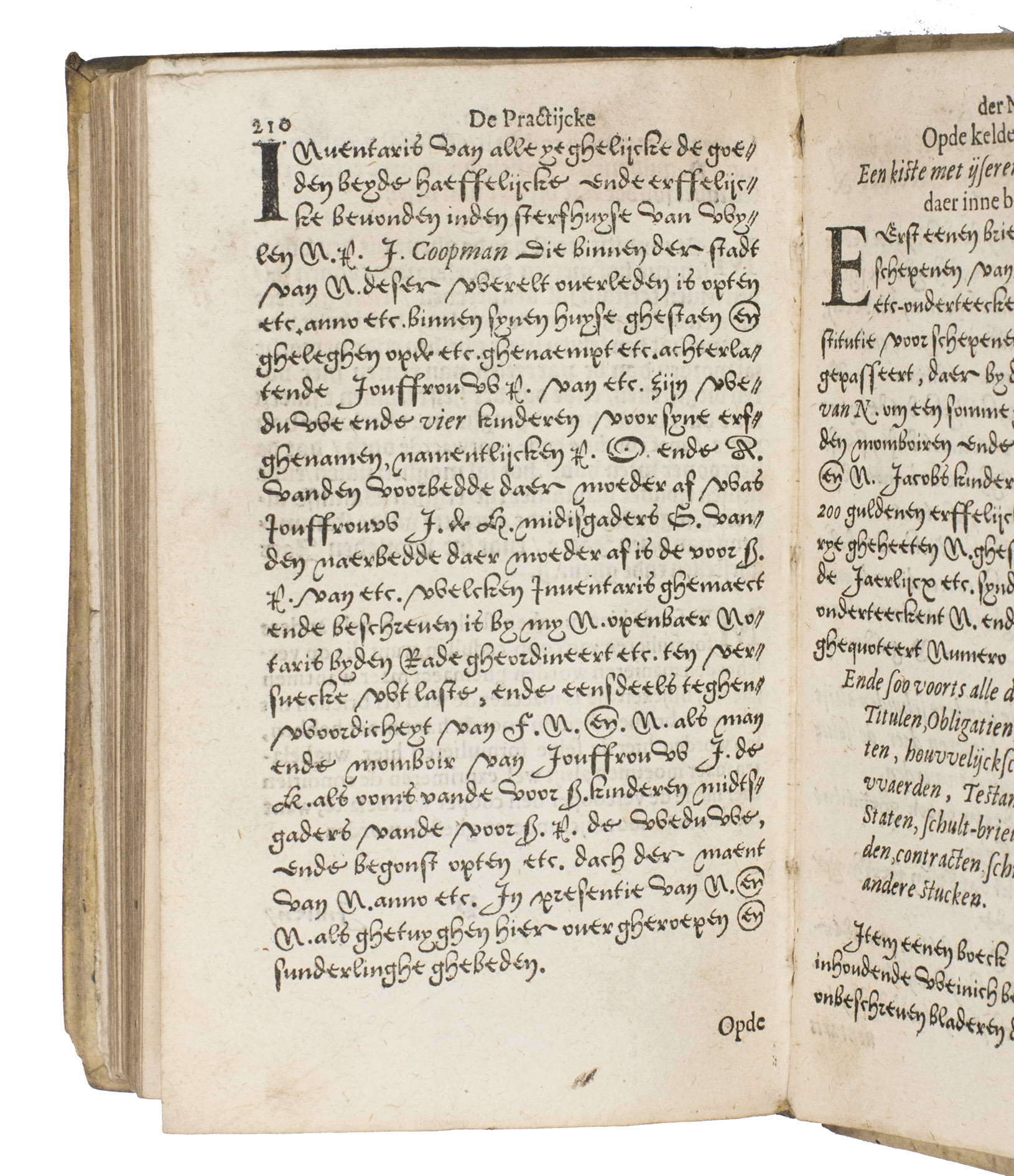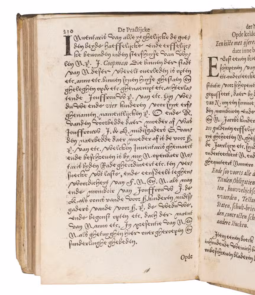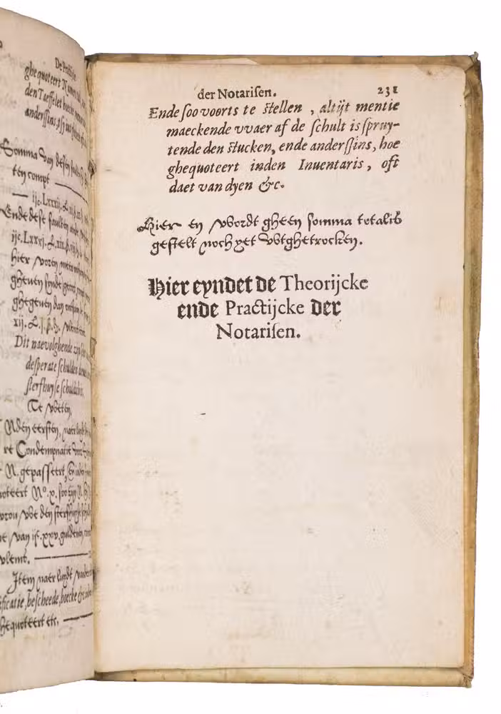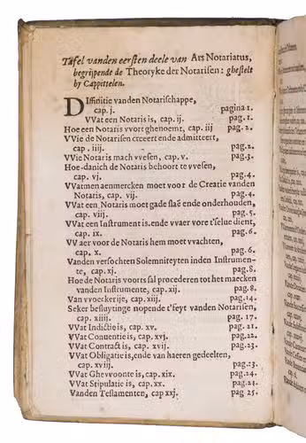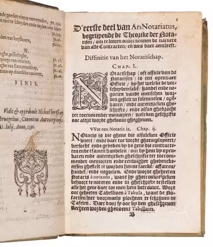 Fourth (third Antwerp) edition, extensively revised and expanded to reach its definitive form, of the first substantial Dutch manual on the notary's practice, based partly on older Latin and French works, some with the same Latin title. It was written (in part translated) by the Antwerp notary Jacques (Jacob) Thuys. Hendrick Heyndricxz published the first 2 editions at Antwerp in 1583 and 1585. The present calls itself the third, clearly following on the 1585 edition, which calls itself the second, but Bruyn Harmansz. Schinkel published an edition at Delft in 1589 (copying even the "second edition" statement from the 1585 edition). Shinkel appears to have copied the present edition for his 1596 edition. The book was, of course, intended for the use of the notaries themselves, and for notaries in training, but Thuys's note to the reader also offers it to merchants, investors and tradesmen, since they would benefit from a better understanding of the documents they might have to have drawn up for business purposes.
