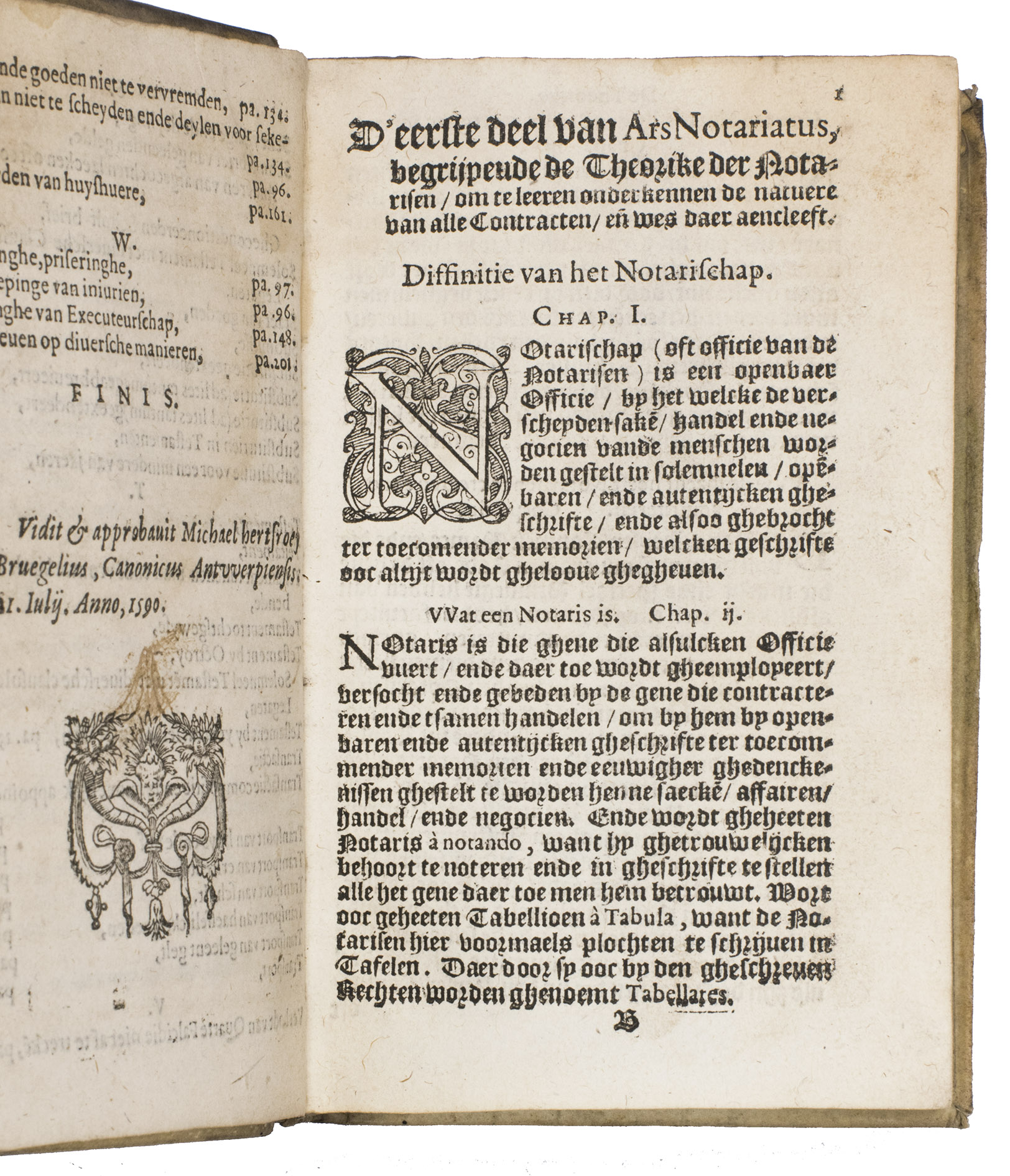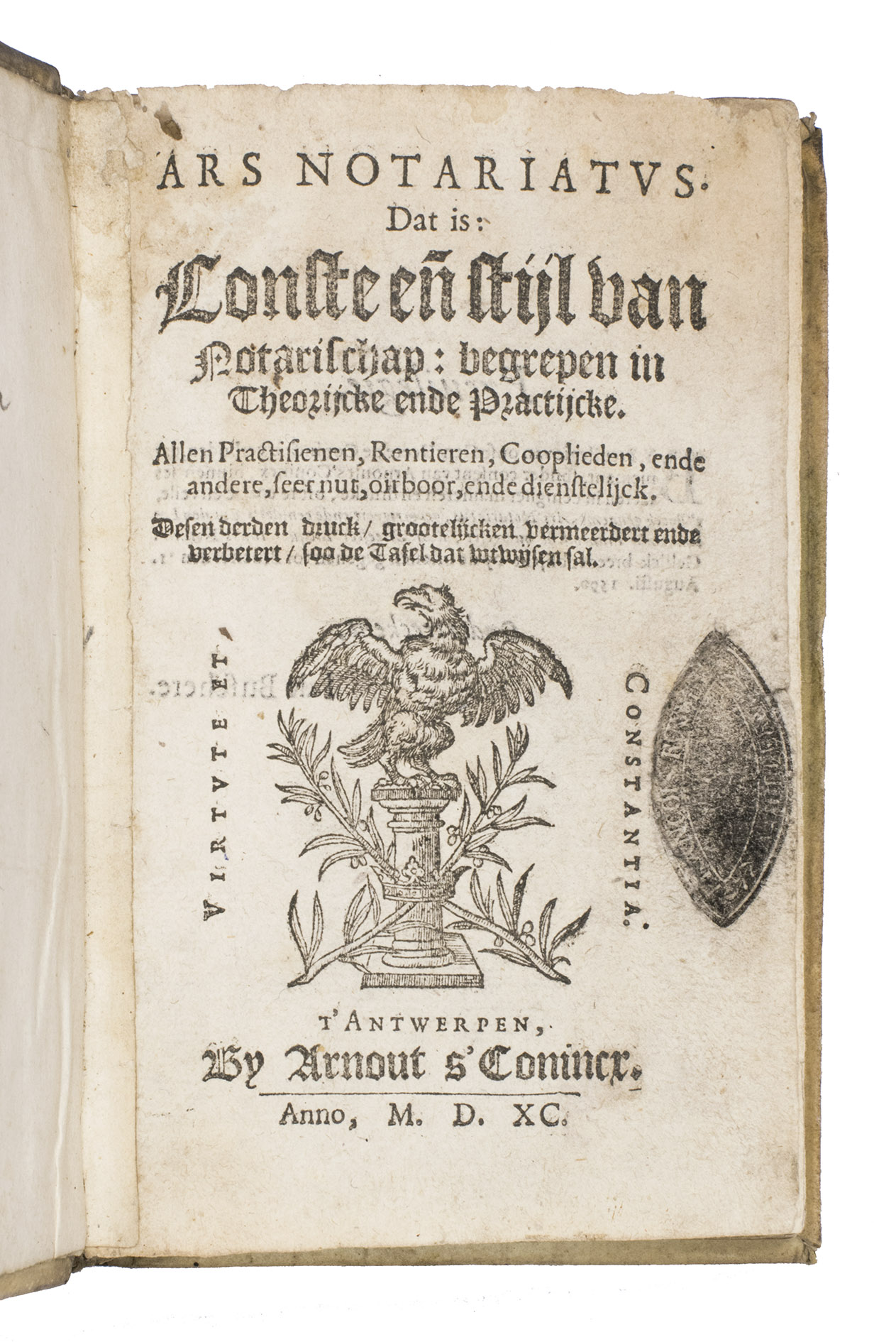 Antwerp, Arnout s'Conincx, 1590. Small 8vo (15.5 x 10 cm). With woodcut publisher's device (with letterpress motto "Virtute et constantia") on title-page, a woodcut tail-piece and woodcut decorated initials (3 series). Set in textura types with incidental roman, with sample documents set in civilité with incidental italic. 17th-century parchment. [16], 231, [1] pp.