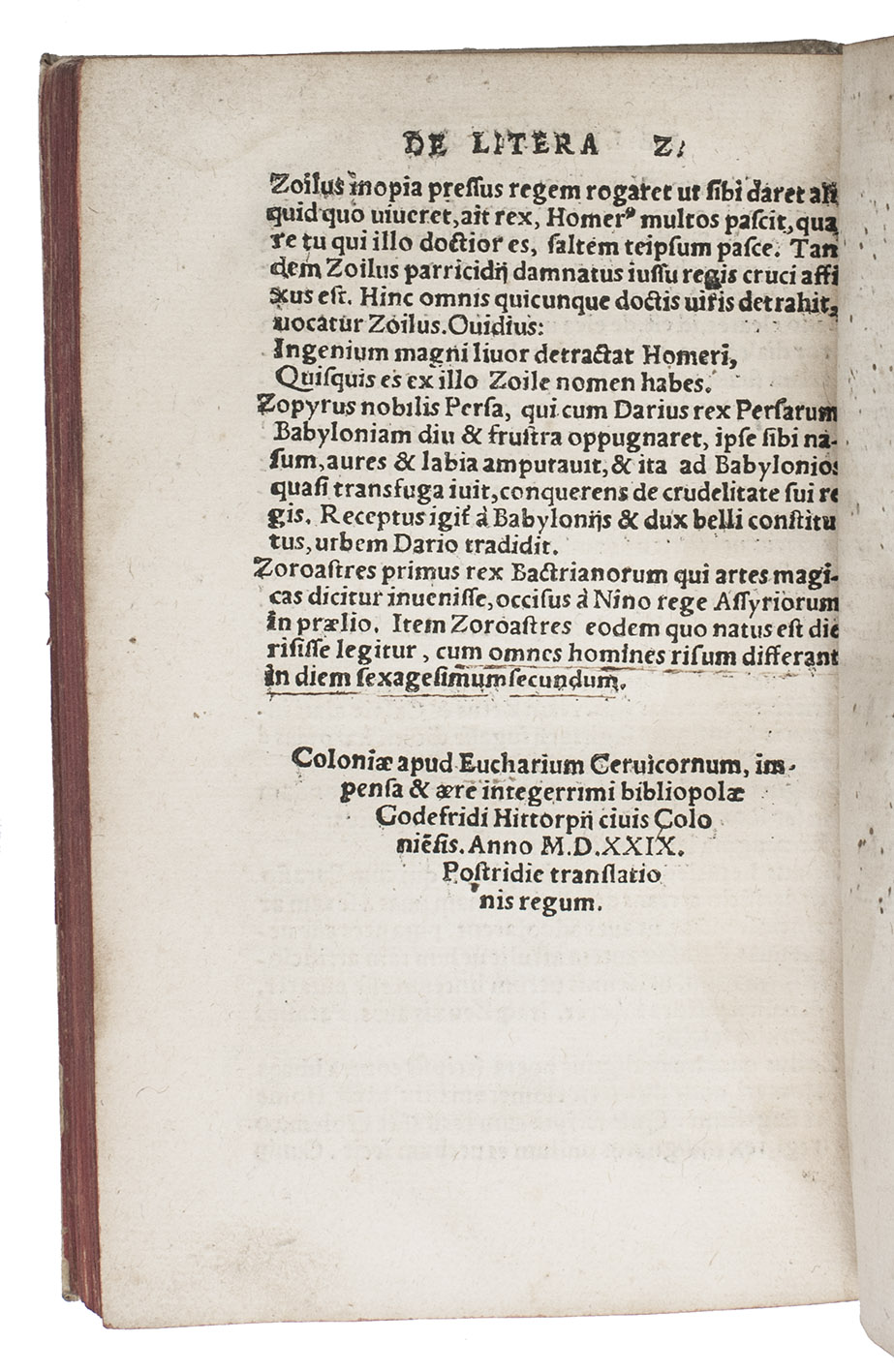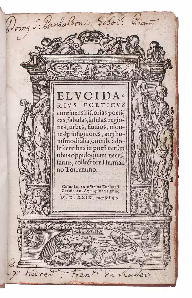 Cologne, Eucharius Cervicornus (colophon: Godefried Hittorp), July 1529. With the title in an elaborate woodcut architectural border with the Cologne coat of arms in the head, the death of Cleopatra in the foot, further figures in the right and left sides and 3 putti, one holding a shield with a monogram or mark, perhaps of the artist or woodblock cutter. Set in roman types with 8 and 14 mm roman capitals used as initials.