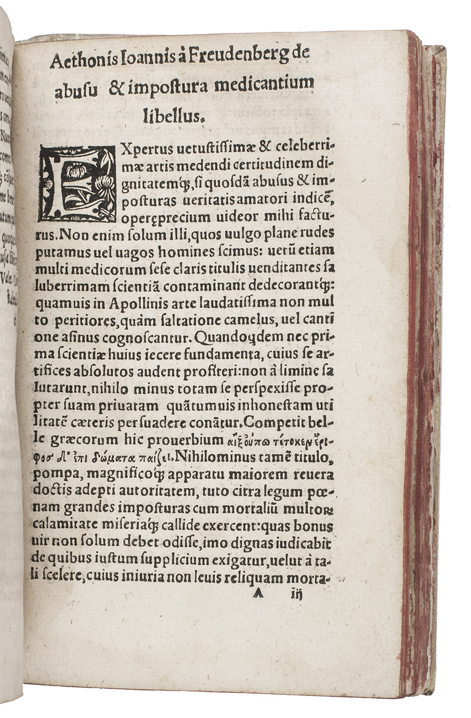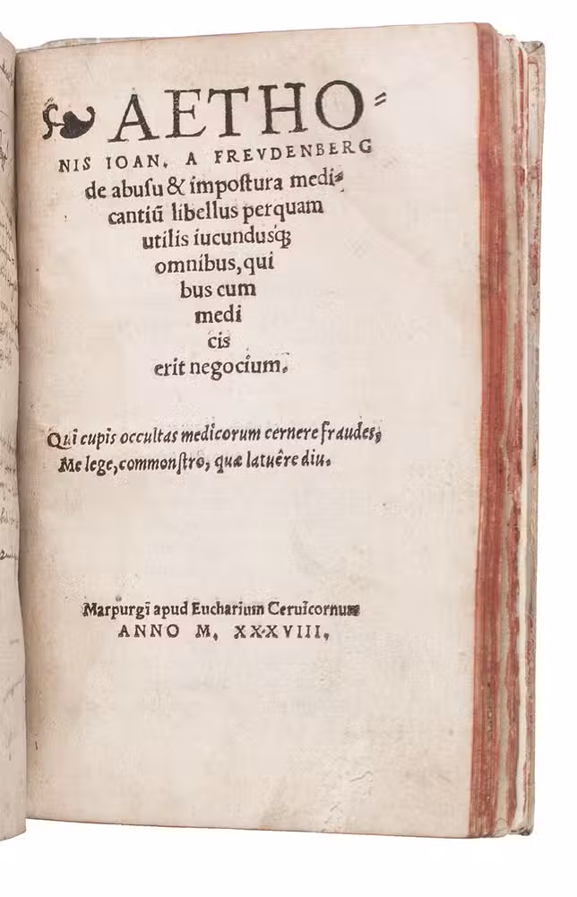 Ad 2: Rare first and only edition, in the original Latin, of the only work written by Aethon Johann von Freudenberg: a pamphlet exposing the abuses perpetrated by dishonest or incompetent doctors and the dangers of the inappropriate medications or treatments they prescribe. Dommers extensive bibliography of the earliest books printed in Marburg overlooked this edition.