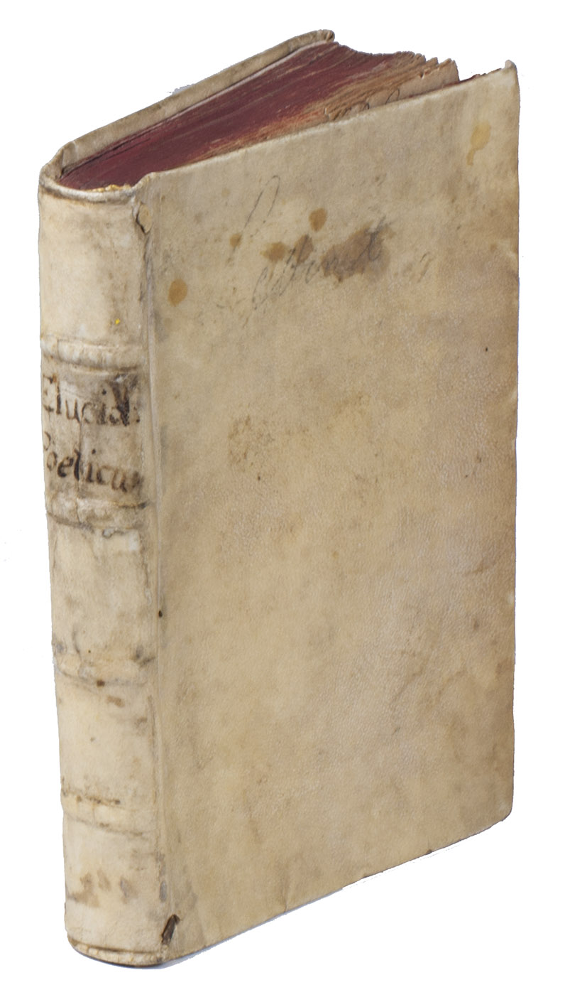 2 works in 1 volume. 8vo. Sheepskin parchment (ca. 1700?), sewn on 4 supports, red edges, first title lettered in ink in the second spine compartment. [85], [1 blank]; [23] ll.