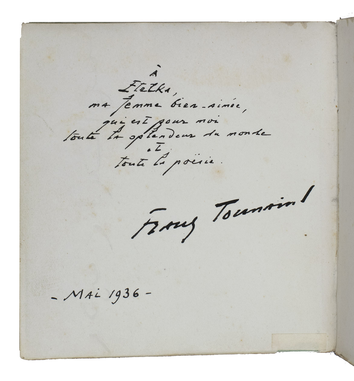 Autograph copy of Le jardin des caresses, Toussaint's famous collection of Moorish erotic poems, written and inscribed by the author himself as a gift to a his second wife. The work is considered to be a classic of 20th-century French orientalism. The work contains a collection of anonymously written Moorish sensual and erotic poems, translated from the Arabic into French by Franz Toussaint. The present copy of the work was very likely made as a gift for his second wife (married since 1925), Adelaïde Etelca Stefania Braggiotti, and is inscribed by the author himself, emphasizing his feelings for her: "À Etelka, ma femme bien-aimée, qui est pour moi toute la splendour du monde et toute la poësie. Franz Toussaint. Mai 1936".Franz Toussaint (1879-1955) was a French author and orientalist, known for his translations of Arabic, Persian, Sanskrit and Japanese works. He is most known for his translation of the Rubaiyat of Omar Khayyam (1924). He was also a director of films.
