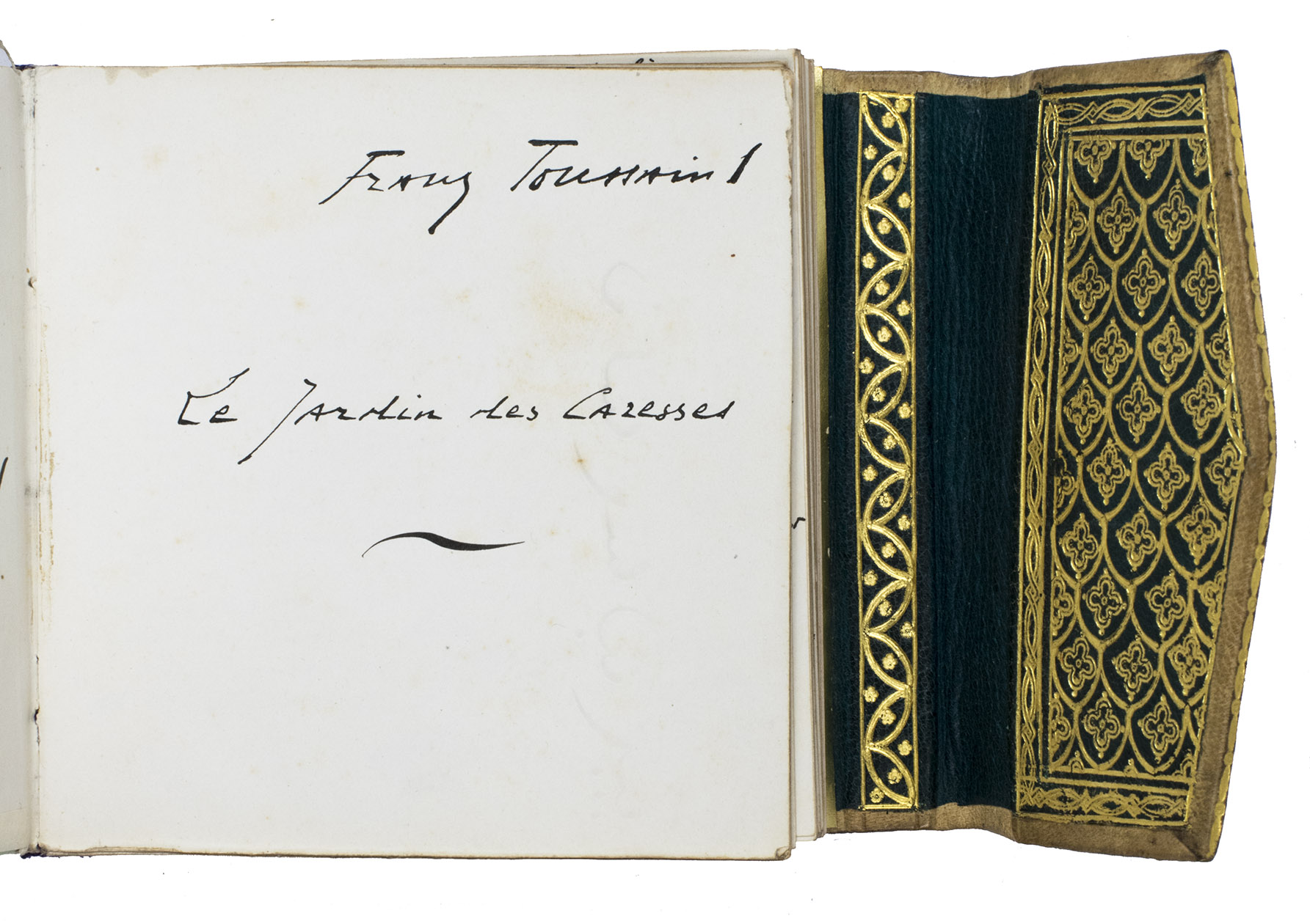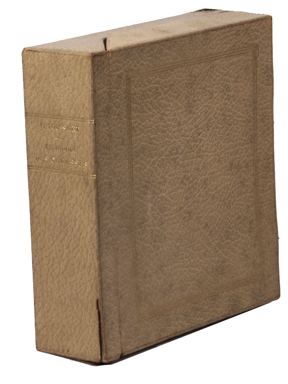 With the monogrammed stamp of the author in black ink on both endpapers. Binding slightly worn around the edges of the spine and fore-edge (including the flap), first two endpapers almost loose, with a few minor spots. The case is a little worn at a few places, the two fastenings are gone but still preserved. Overall an autograph copy of Le jardin des caresses which is still in very good condition and in its original binding, made by Toussaint as a gift for his wife.