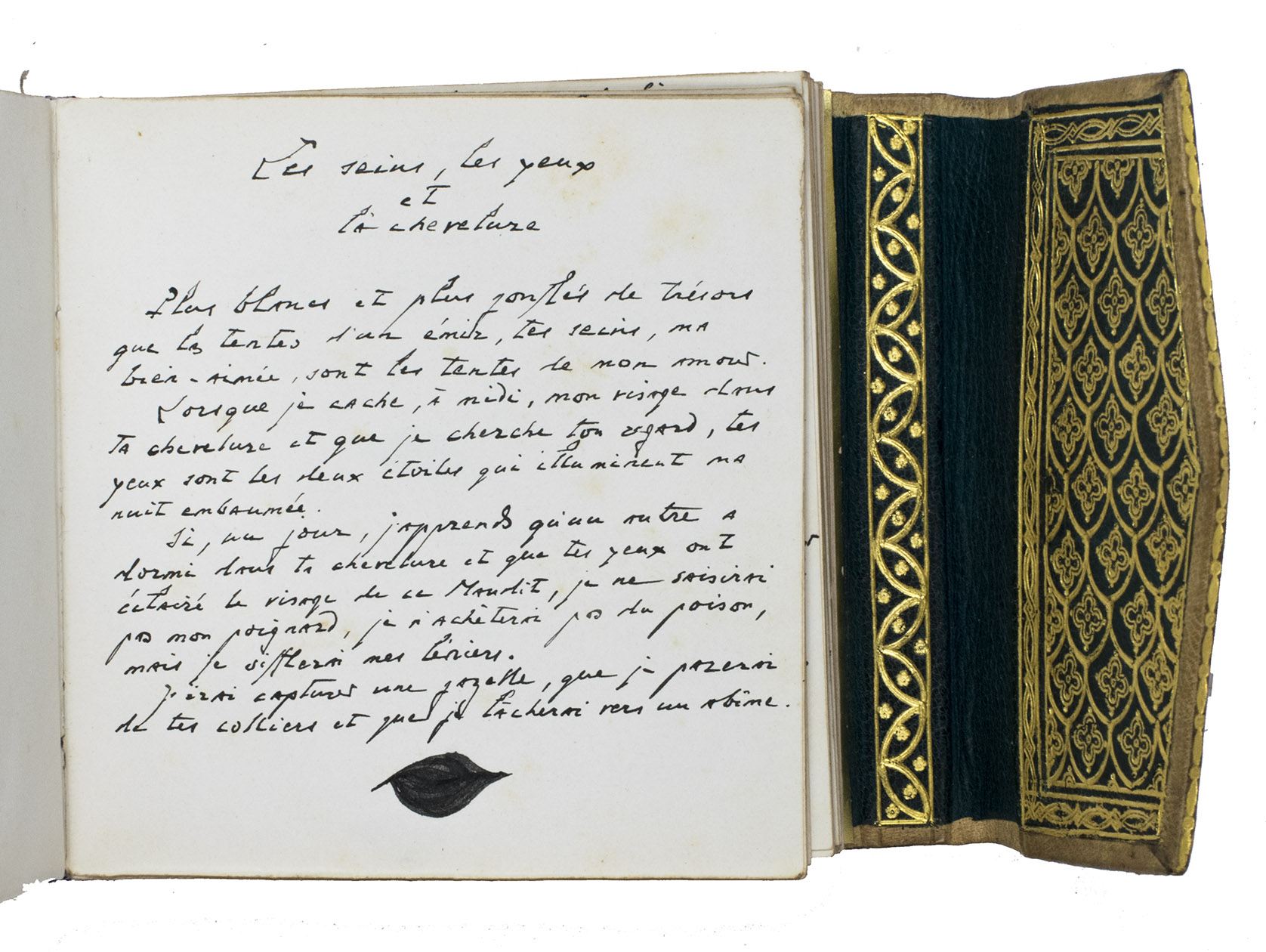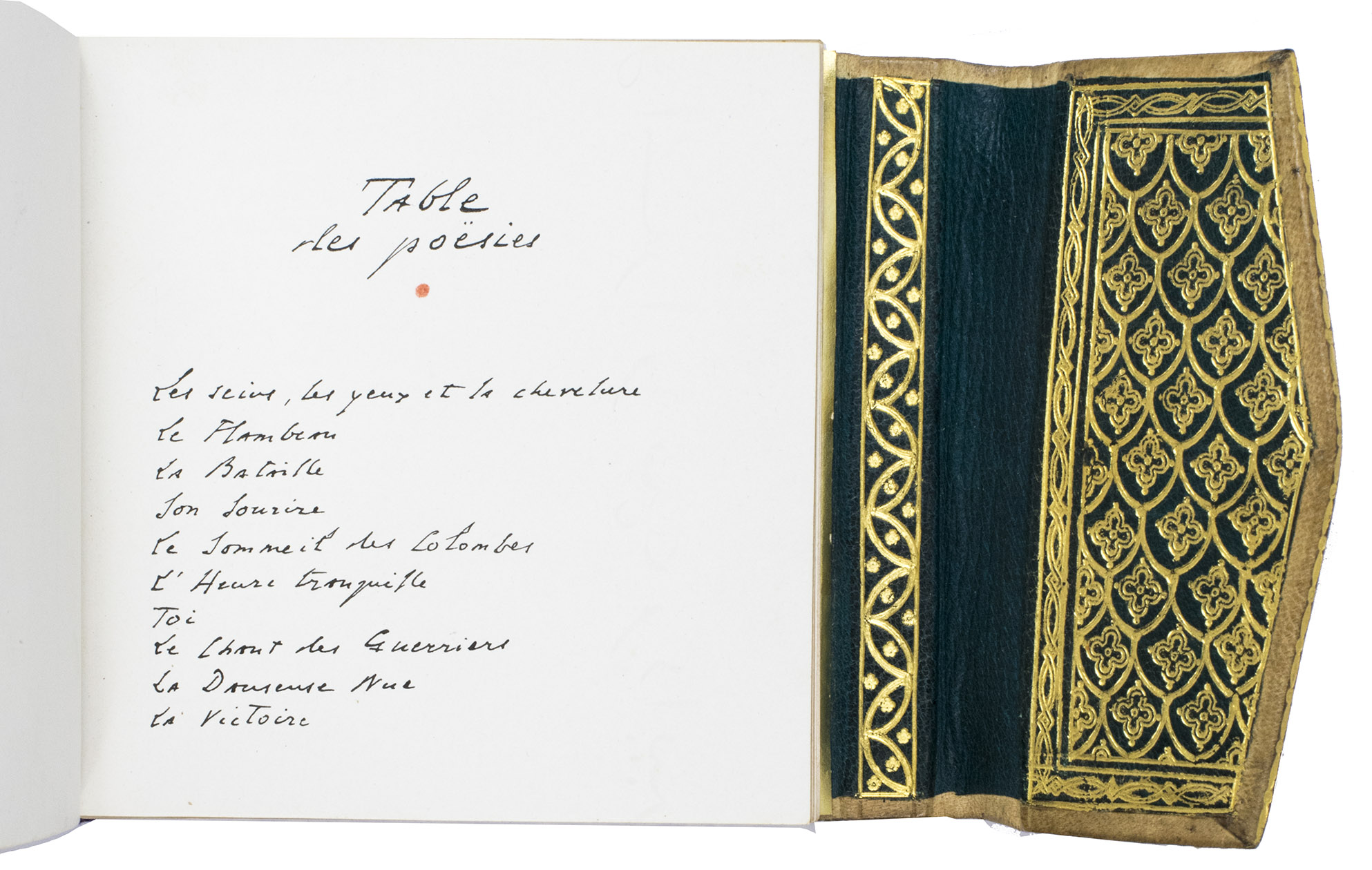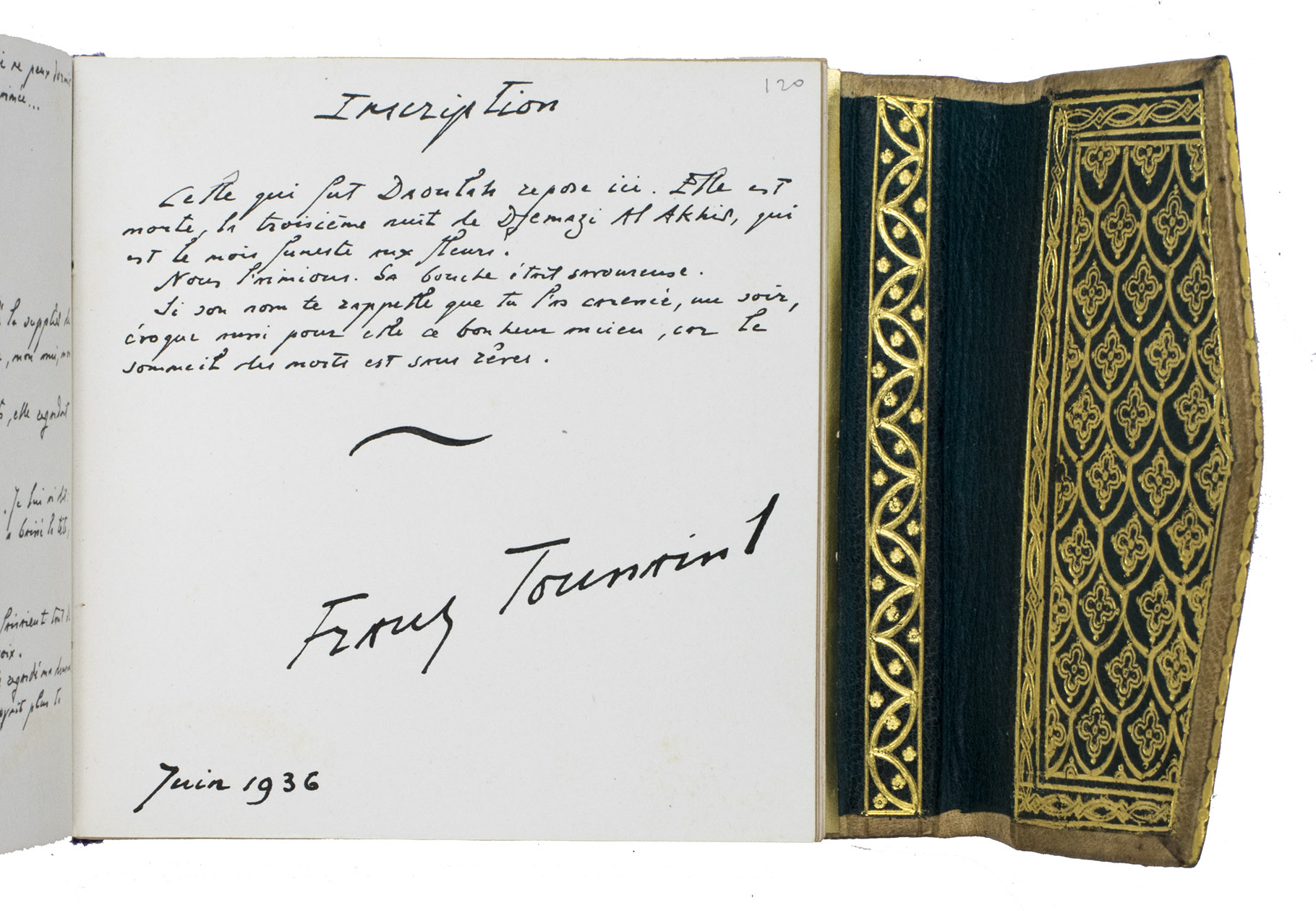 May and June 1936. 11.5 x 12 cm. Manuscript in French written by the author in blank ink a neat 20th-century hand in one column. Chapter divisions are made in the form of a calligraphic leaf, drawn in the same black ink as the text. Bound in contemporary richly gold-tooled arabesque beige morocco with a flap at the front-edge, covered with gold-tooled green morocco on the inside, purple and white head and end bands, gold and light blue endpapers. Stored in a professionally made beige morocco box (ca. 15 x 15 cm) with a gold-tooled three-line fillet frame on the boards, on the inside covered with light pink silk, title in gold on the spine. [3 blank], [141], [13 blank] pp.